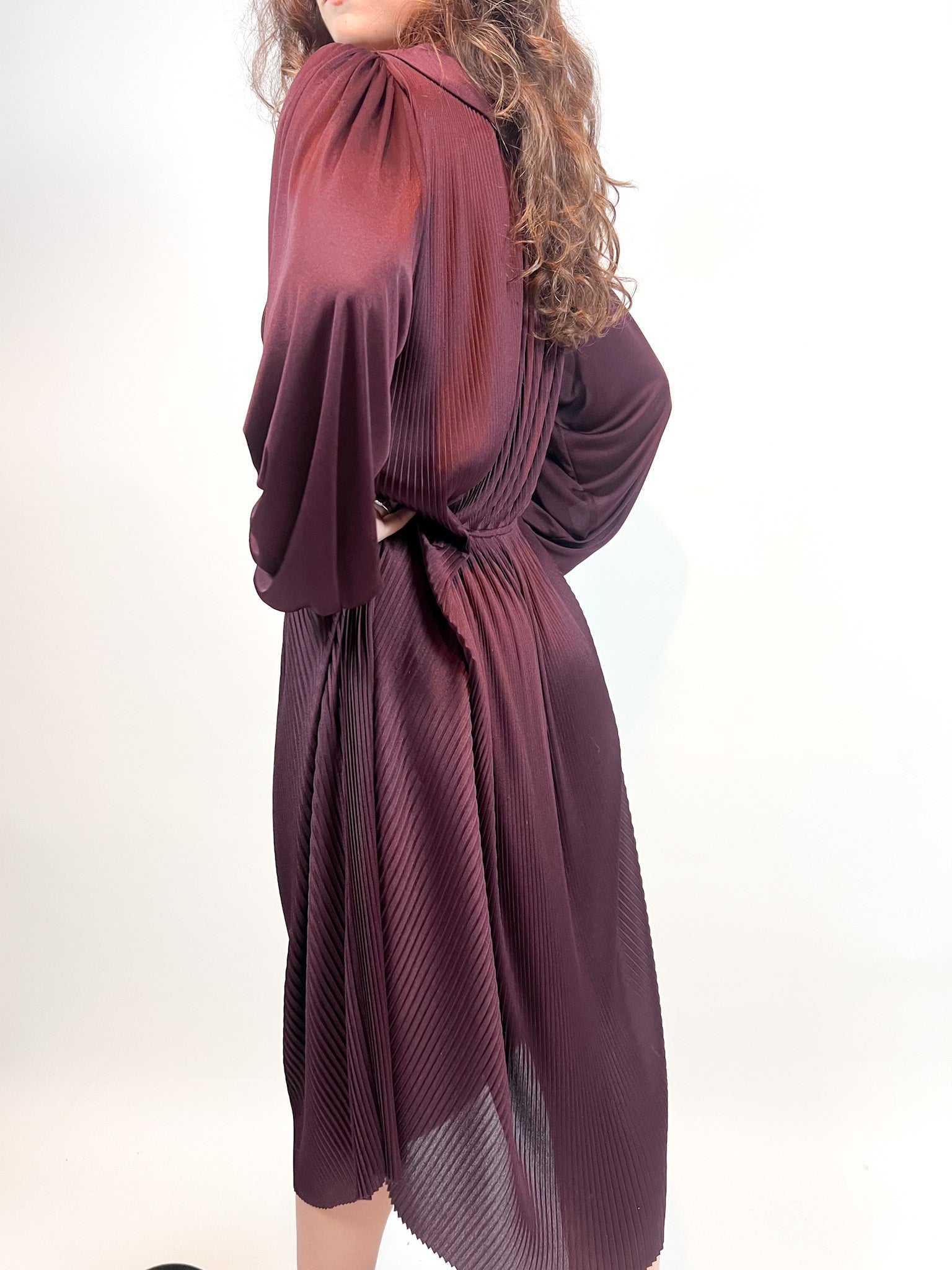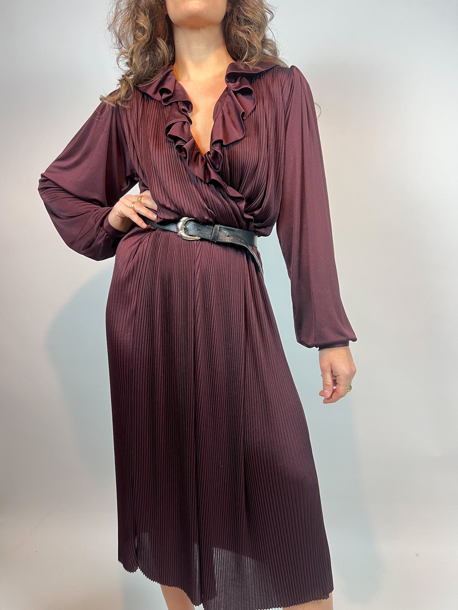 Vintage Burgundy Pleated Dress with Ruffled Neckline