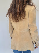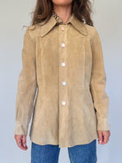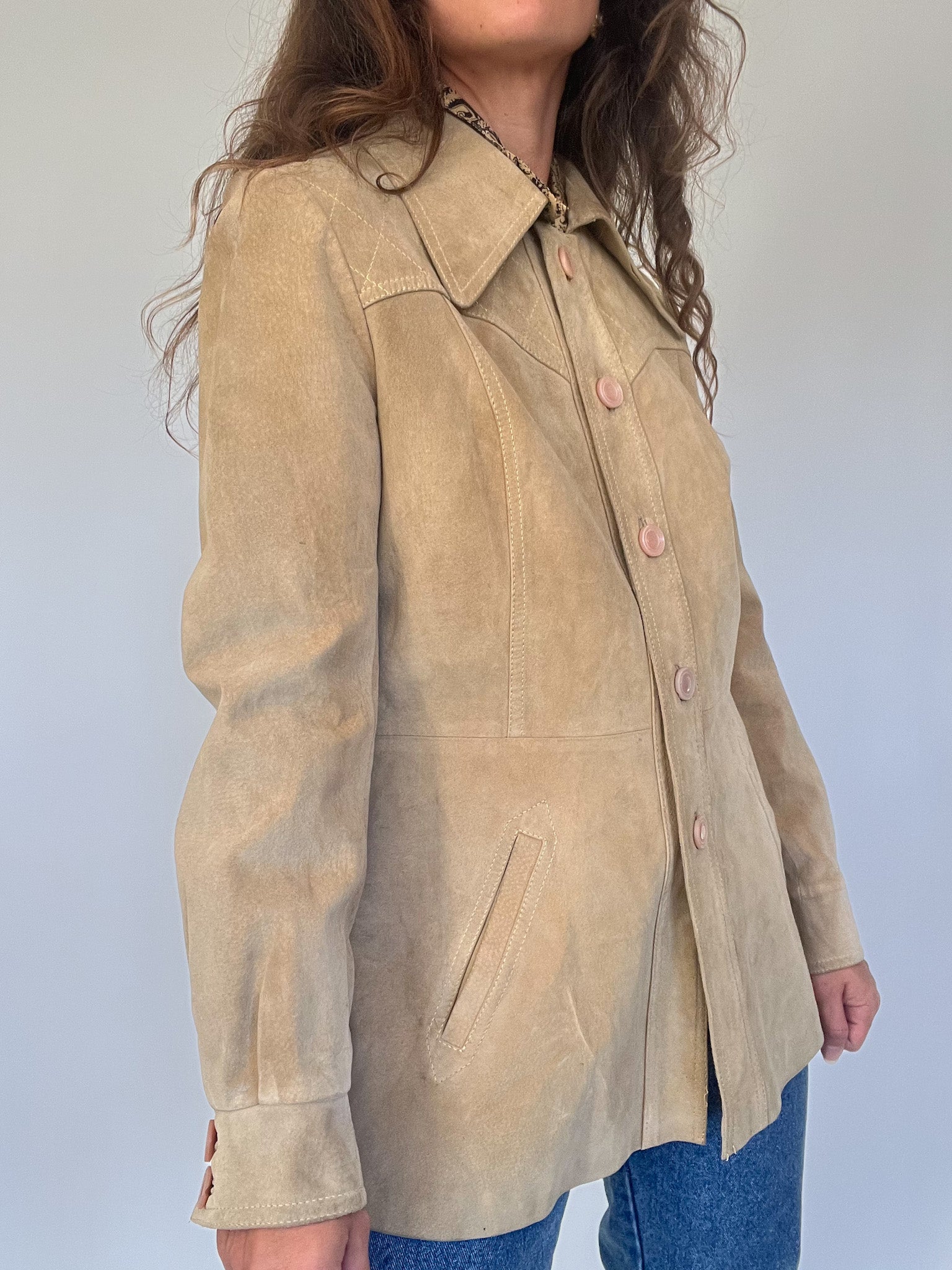 • Special features: Wide 70’s collar, tonal stitching details, pink-toned buttons, soft beige suede