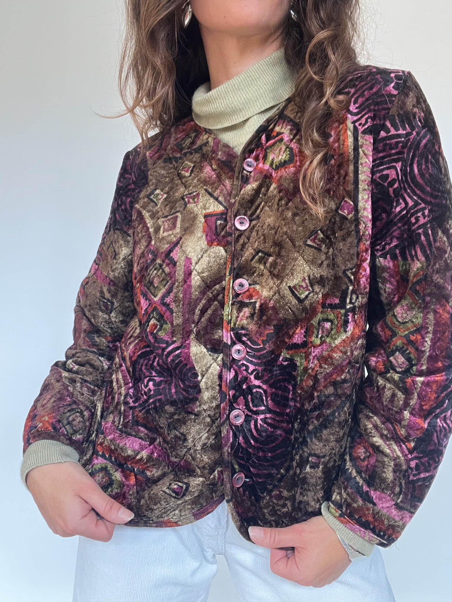 A true statement from the 80’s, this velvet jacket brings together bold abstract patterns in earthy browns and deep purples with hints of magenta. The quilted texture adds depth while the sheen of the fabric catches the light, making it both eclectic and sophisticated. Designed in Germany, this piece reflects the fearless spirit of 80’s fashion — unapologetic, artistic, and timeless. True to the Skorpiones Vintage philosophy, it’s a garment that empowers individuality and celebrates standing out with elegance and strength.