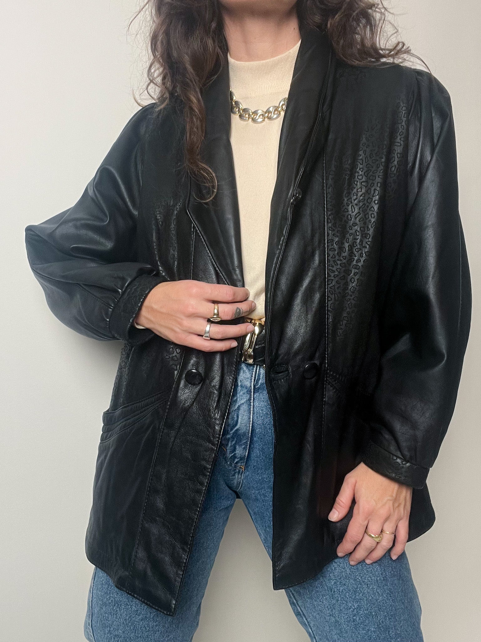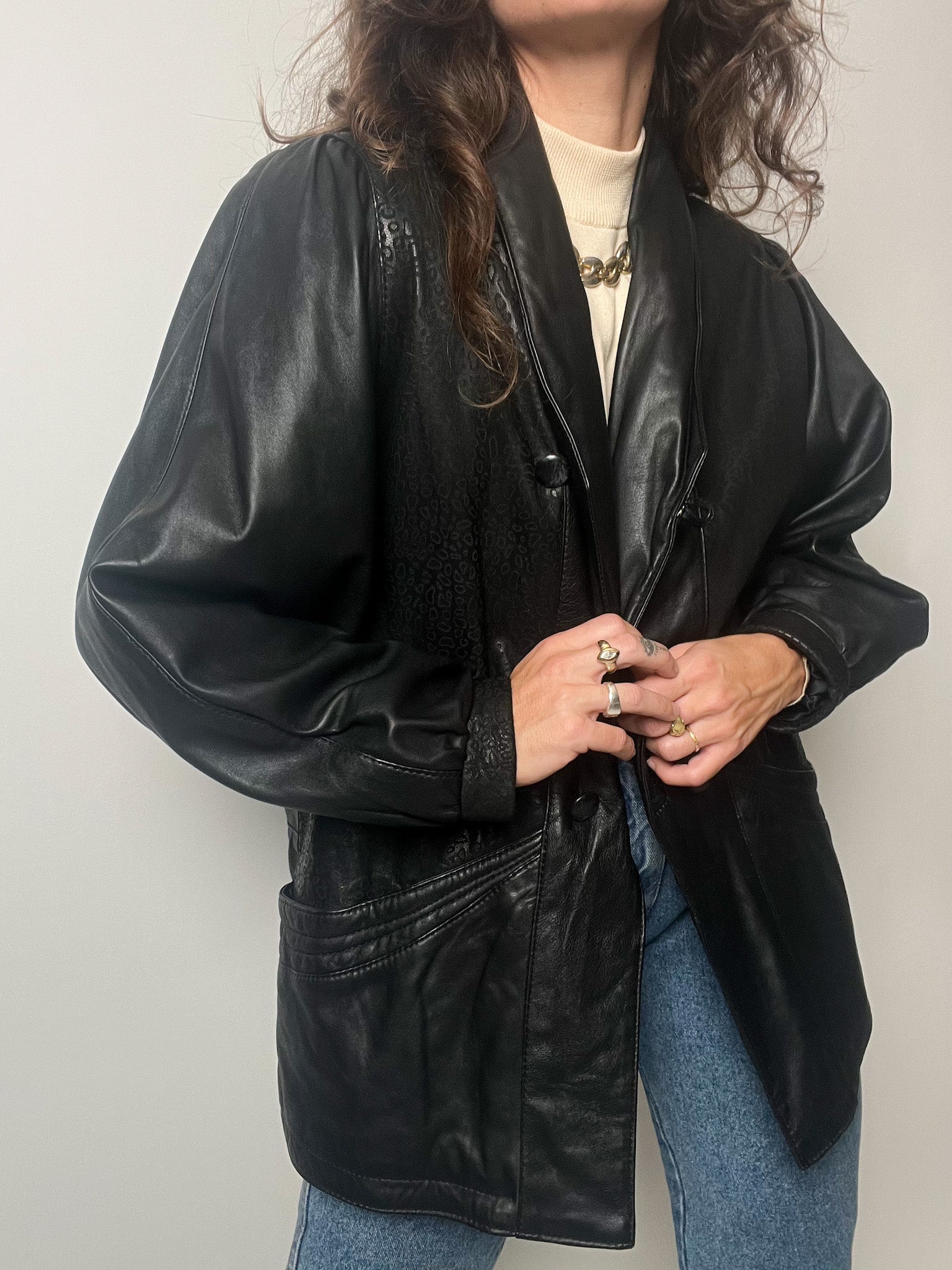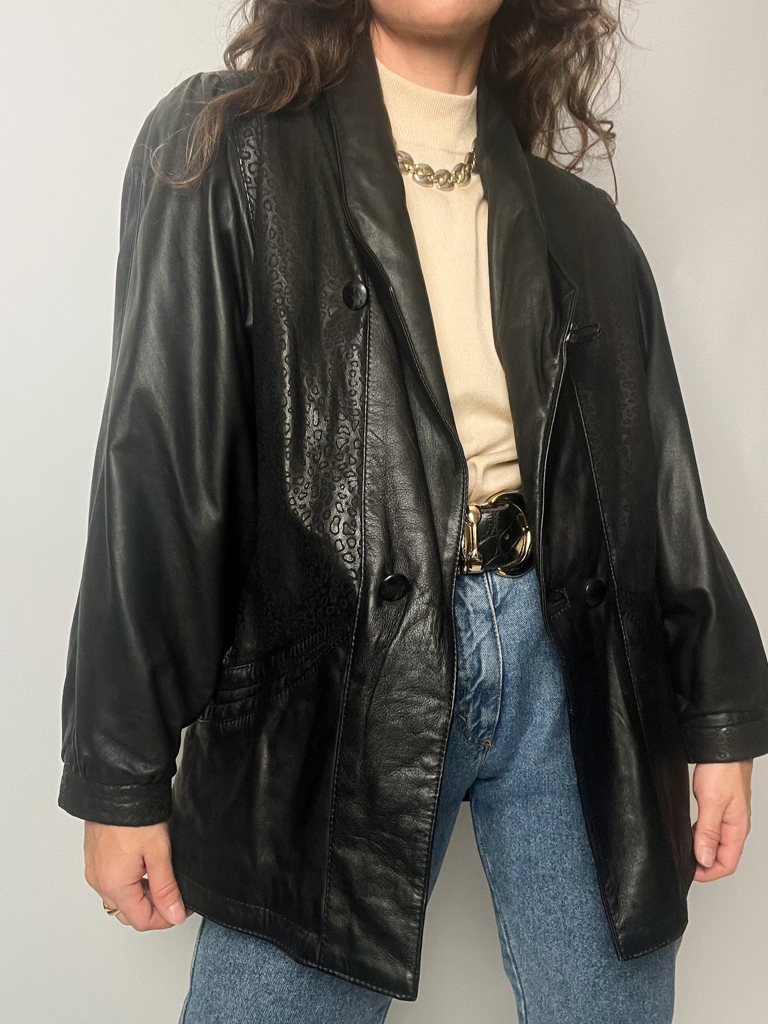 Vintage 80’s Black Embossed Leather Jacket with Leopard Details