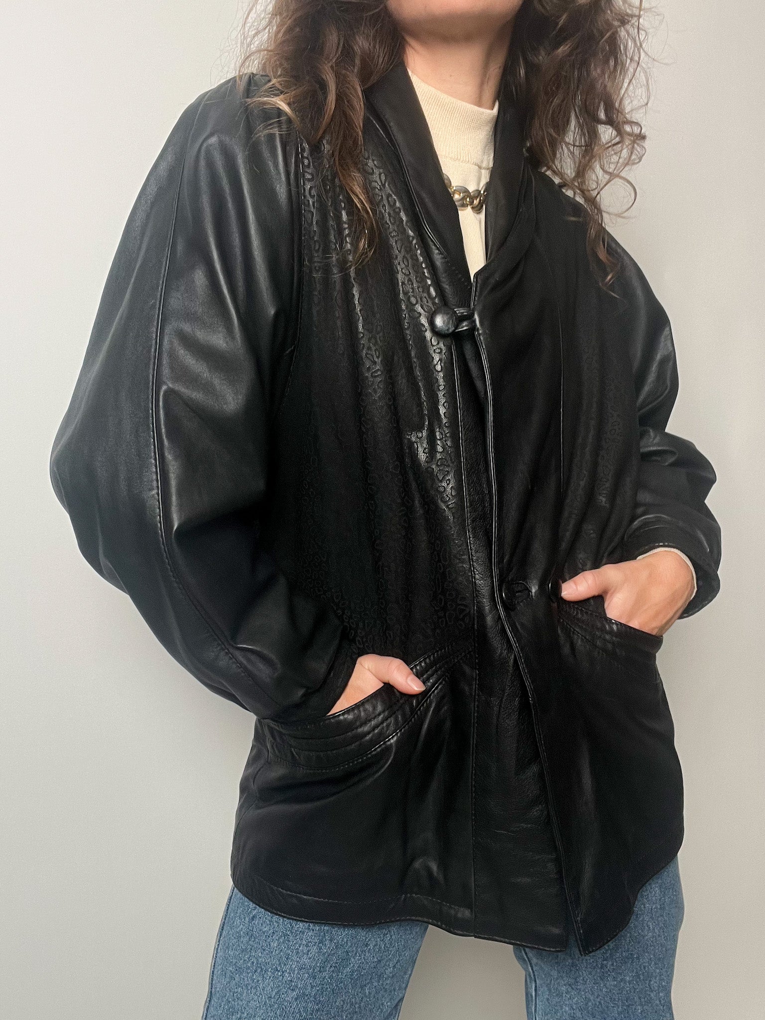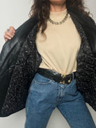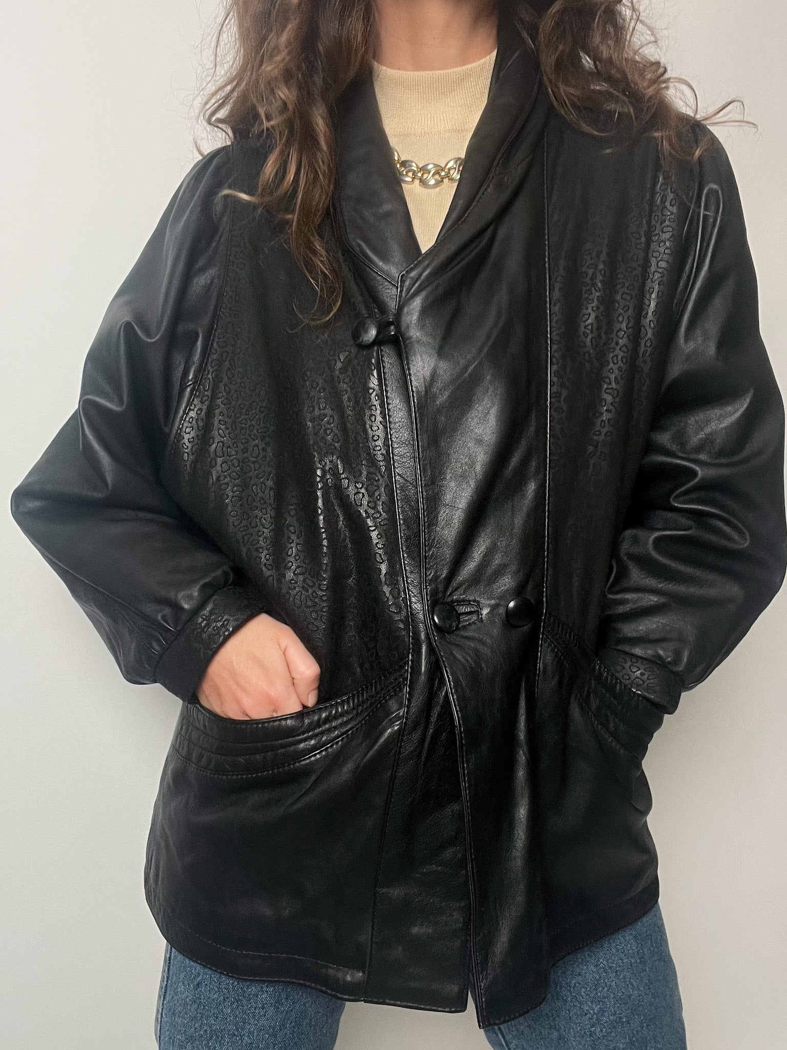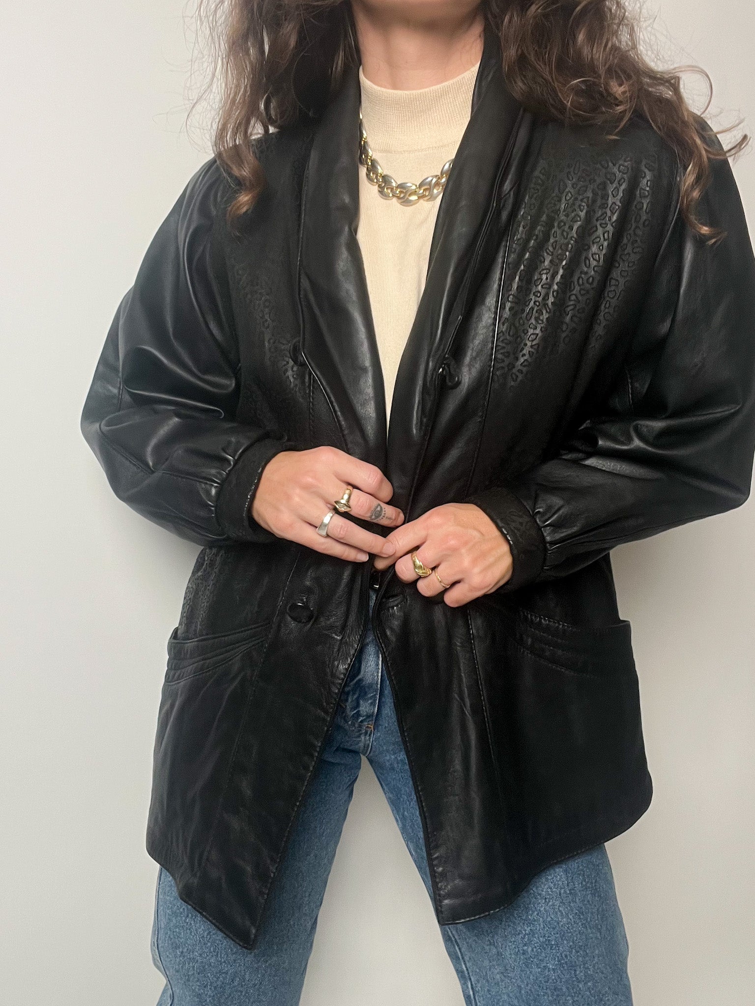 Vintage 80’s Black Embossed Leather Jacket with Leopard Details