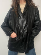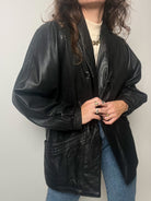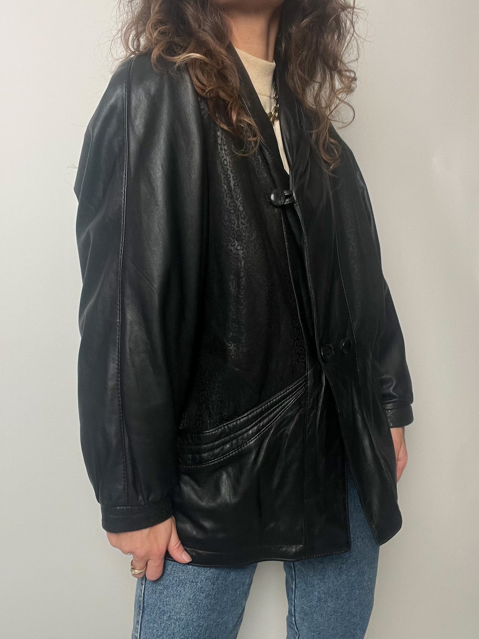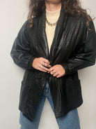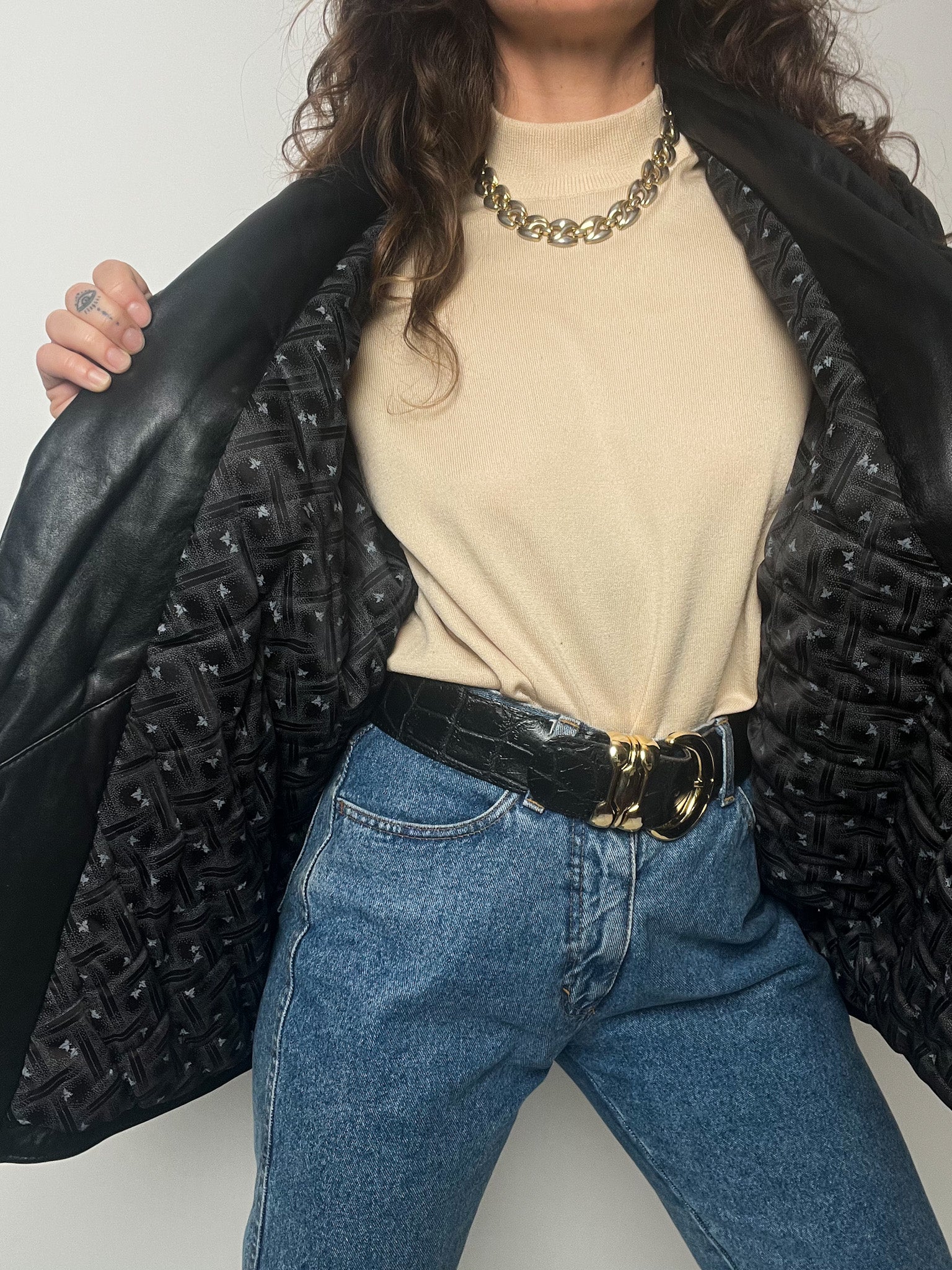 A striking vintage leather jacket that perfectly captures the confidence and boldness of 80’s design. Crafted from smooth black leather with subtle embossed detailing, it combines sophistication with edge. Its slightly oversized silhouette brings structure and attitude, empowering the wearer with timeless allure — a true reflection of the Skorpiones Vintage spirit.