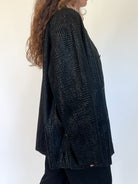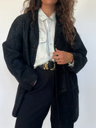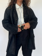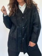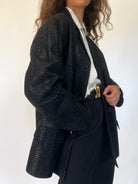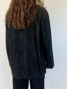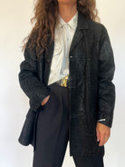 This vintage 80’s jacket combines bold structure with refined texture. Crafted from supple black suede embossed in a crocodile-effect pattern, it creates a striking visual depth that elevates a timeless cut. Its oversized fit gives it that effortless power-dressing silhouette, a style that defined the late 80’s and still resonates with modern wardrobes. Button-front closure and practical patch pockets bring both function and attitude, making this piece a true wardrobe statement.