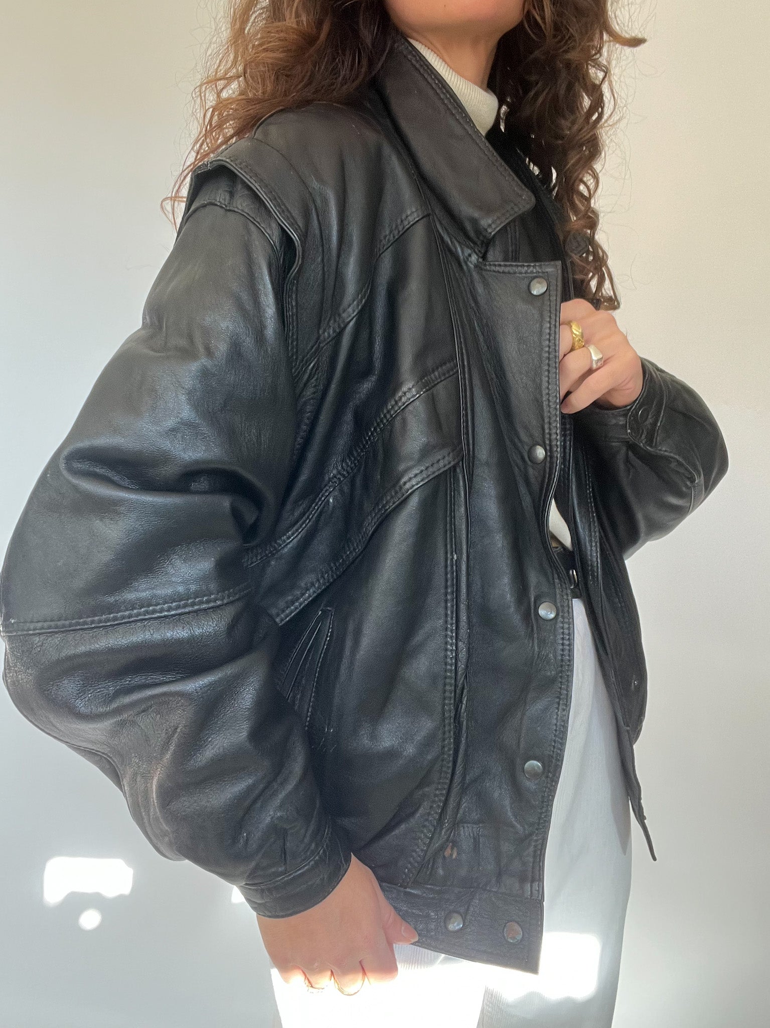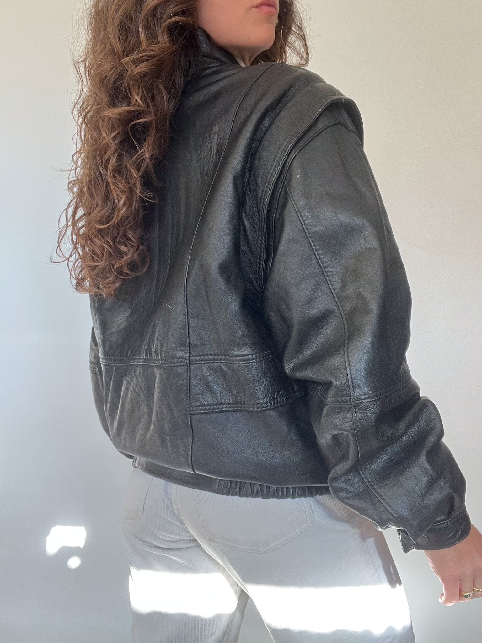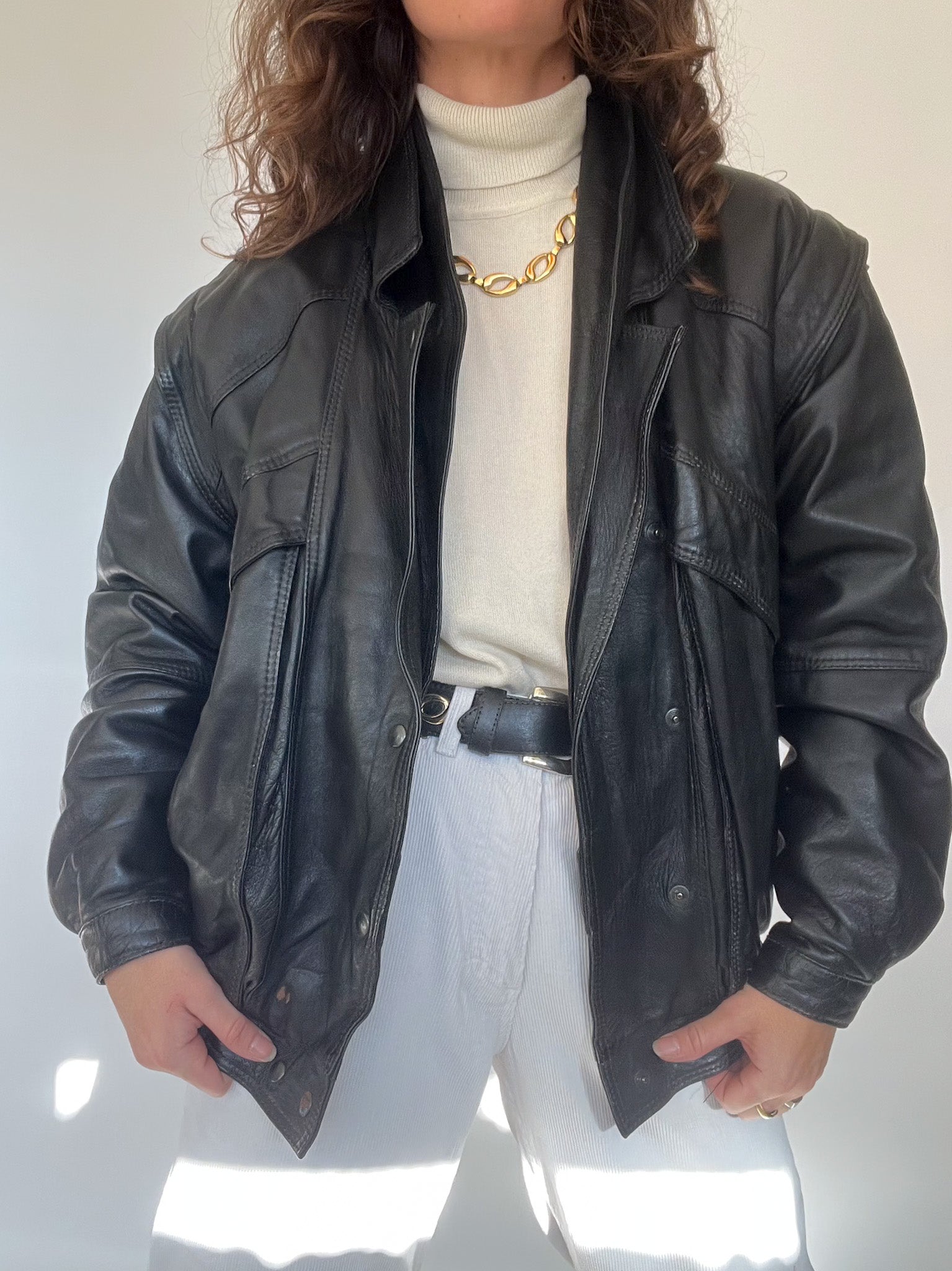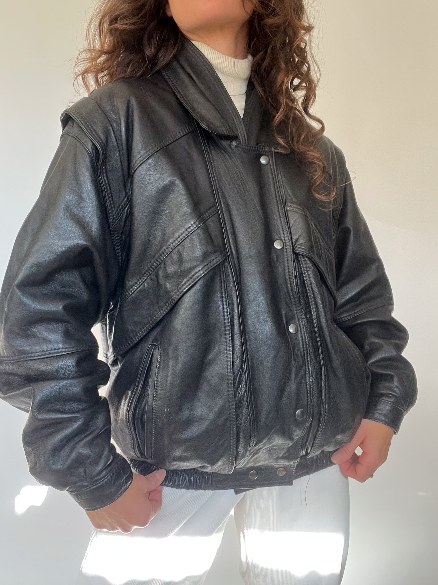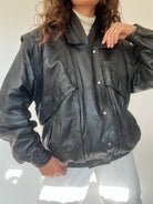 An iconic 80’s leather bomber — structured, bold, and full of attitude. Selected for its exceptional cut and rich leather texture, this piece captures the essence of true vintage outerwear: strong lines, oversized volume, and that unmistakable confidence that defines Skorpiones Vintage. Crafted in 100% leather, it features a beautifully shaped bomber silhouette with dropped shoulders, sculpted panel work, and an elasticated hem that gives the jacket its signature rounded shape. The snap-button and zip closure add depth, while the front pockets complete the look with practical, authentic detailing.