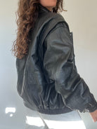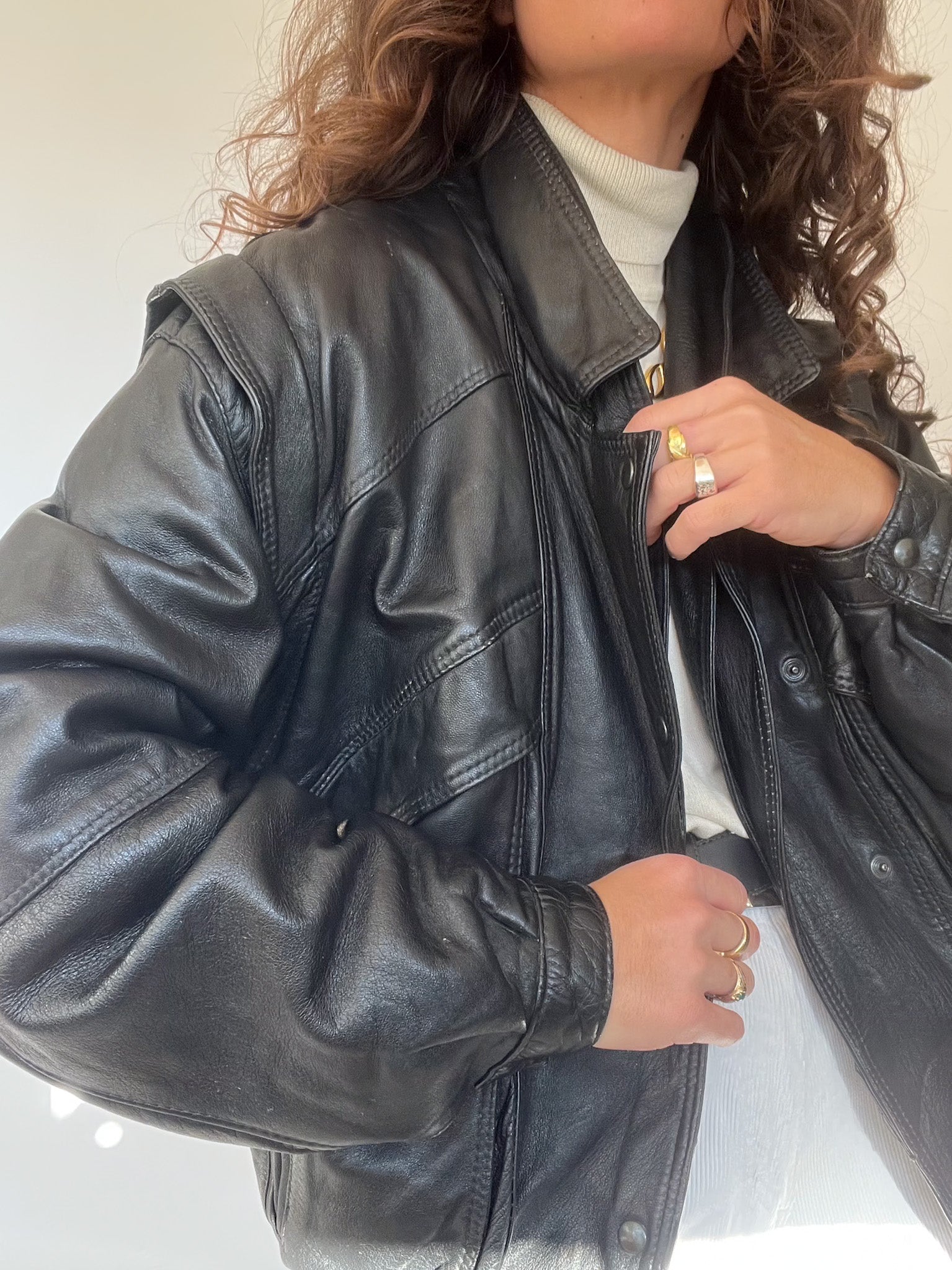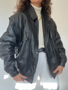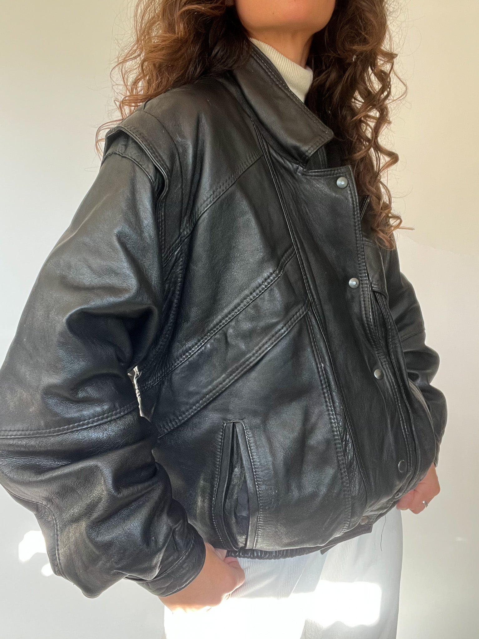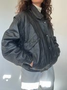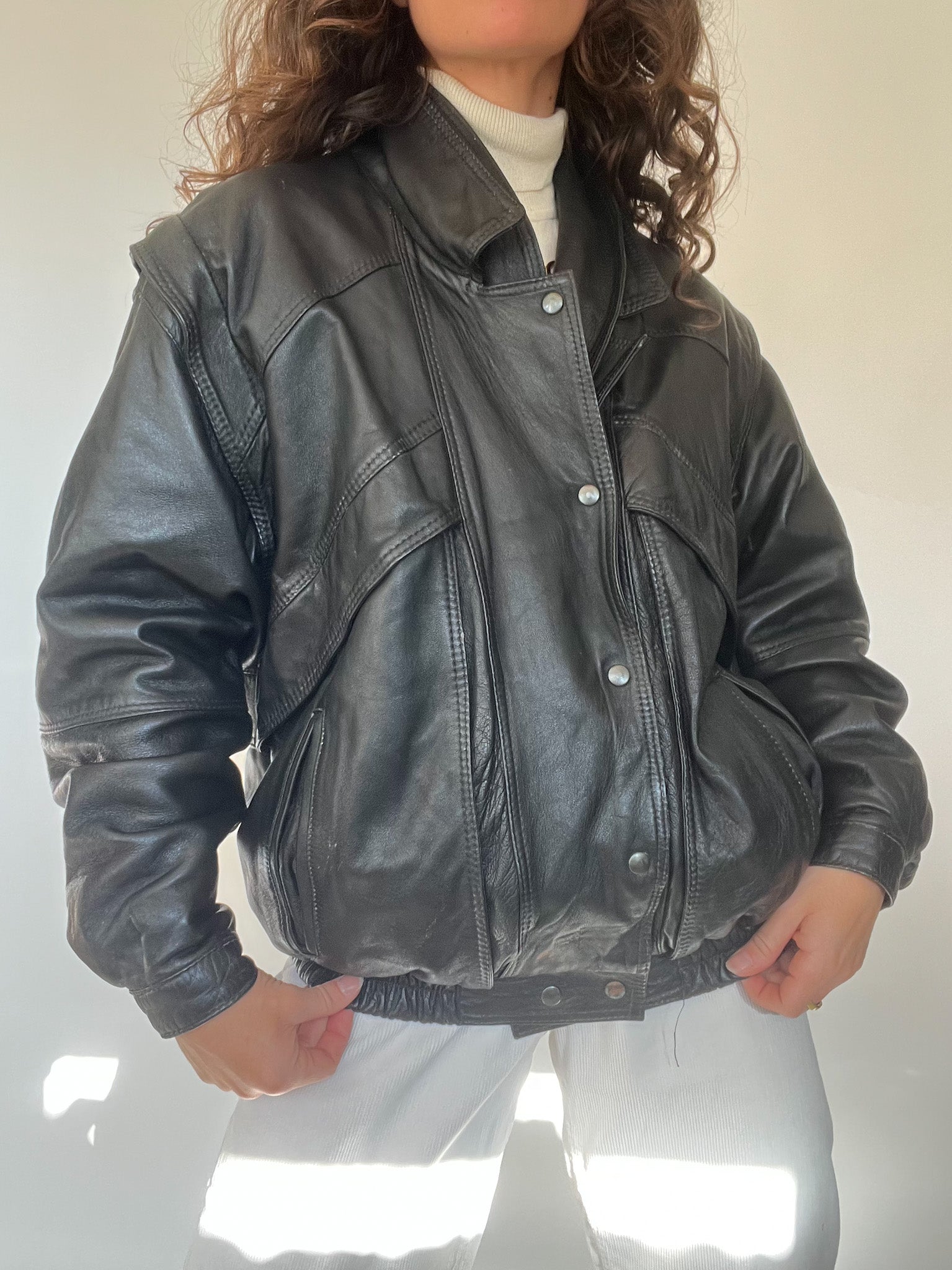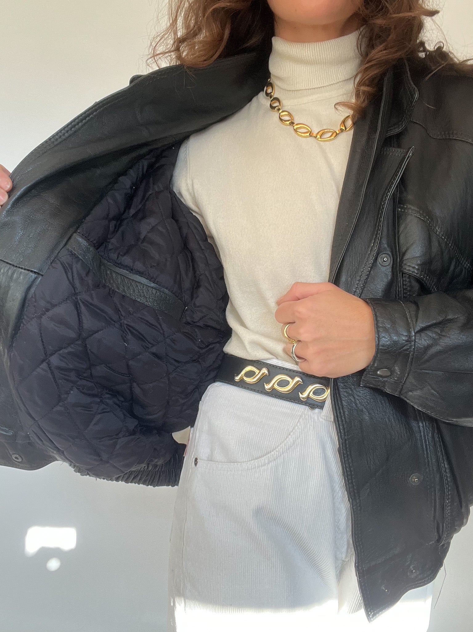 An iconic 80’s leather bomber — structured, bold, and full of attitude. Selected for its exceptional cut and rich leather texture, this piece captures the essence of true vintage outerwear: strong lines, oversized volume, and that unmistakable confidence that defines Skorpiones Vintage. Crafted in 100% leather, it features a beautifully shaped bomber silhouette with dropped shoulders, sculpted panel work, and an elasticated hem that gives the jacket its signature rounded shape. The snap-button and zip closure add depth, while the front pockets complete the look with practical, authentic detailing.