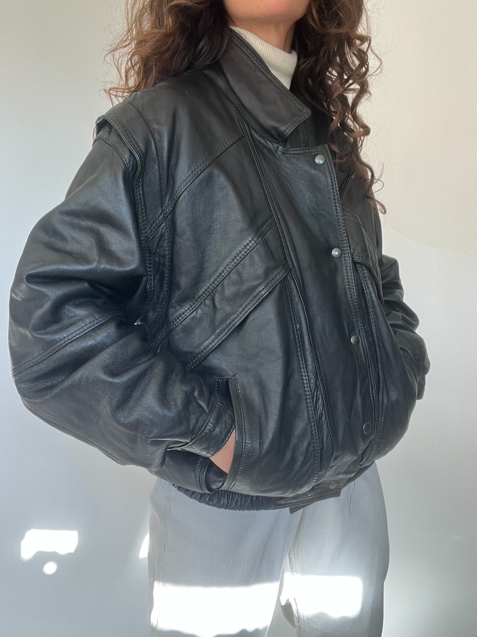 • Special features: Iconic 80’s bomber cut; sculpted leather panels; elasticated hem; snap-button and zip closure