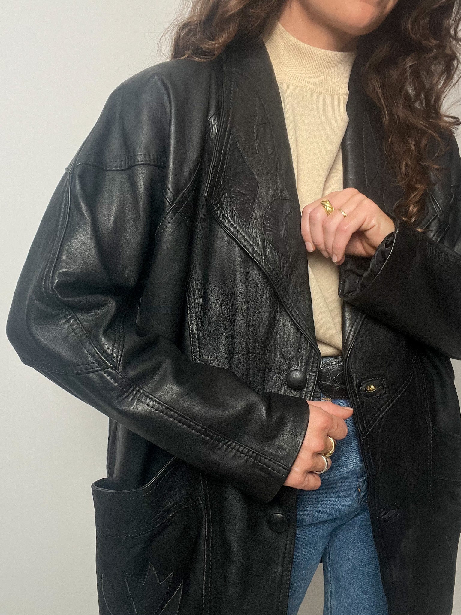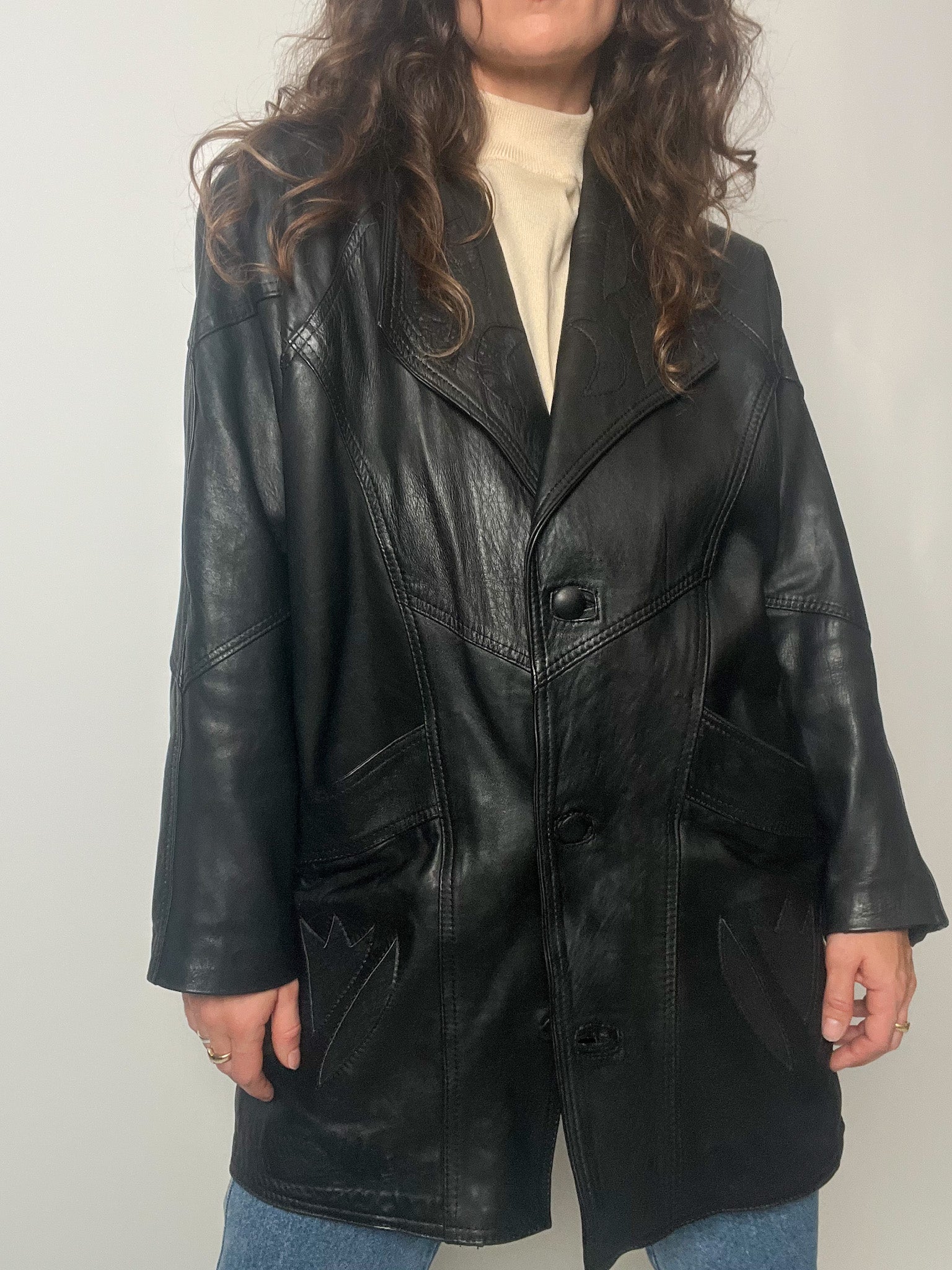 A statement piece from the 80’s that blends strength and artistry. This black leather blazer features exquisite tonal embroidery on the front and pockets, adding texture and depth to its bold, structured silhouette. Designed for those who embrace timeless sophistication with character — a reflection of Skorpiones Vintage’s signature balance between femininity and edge.