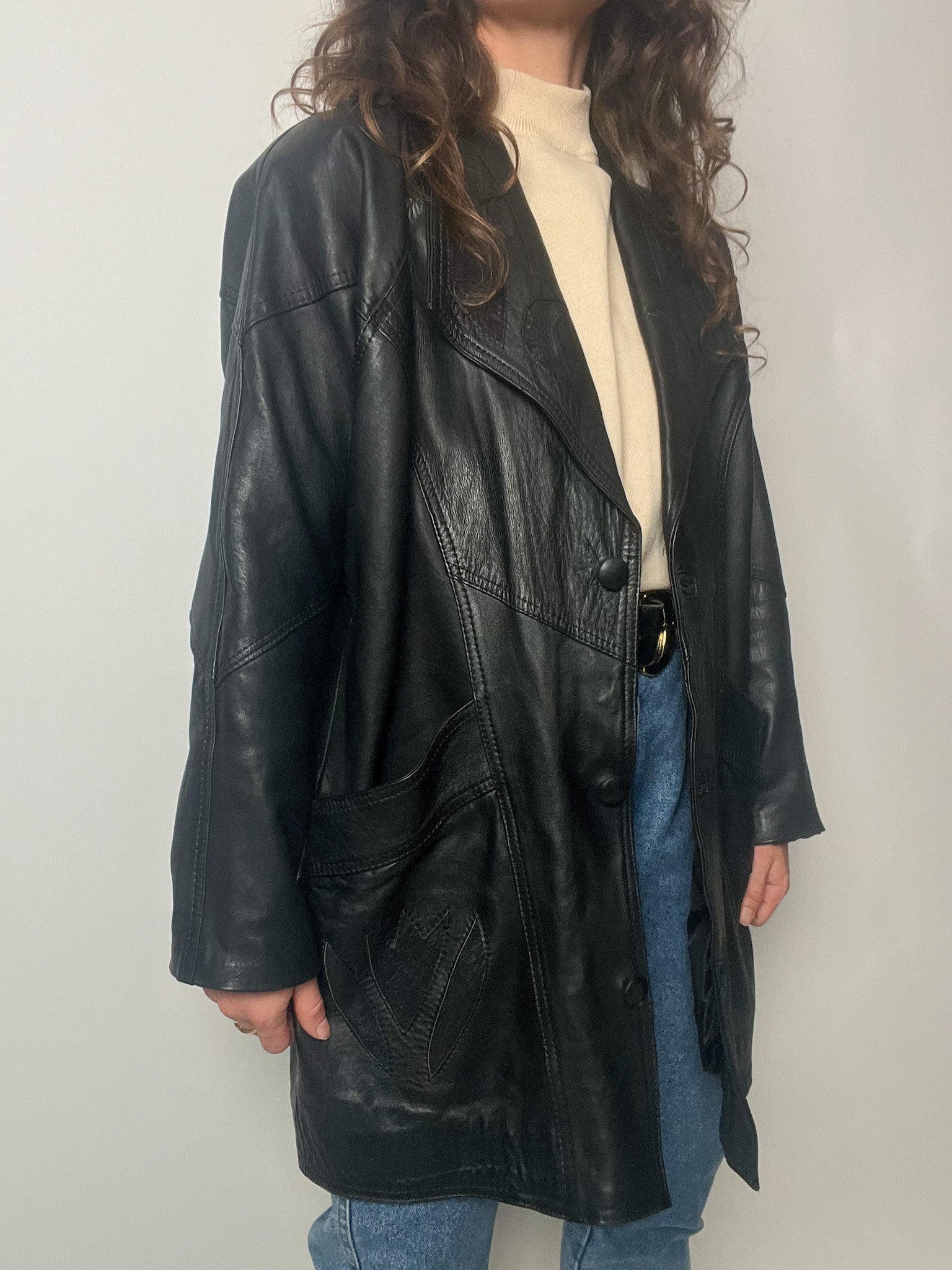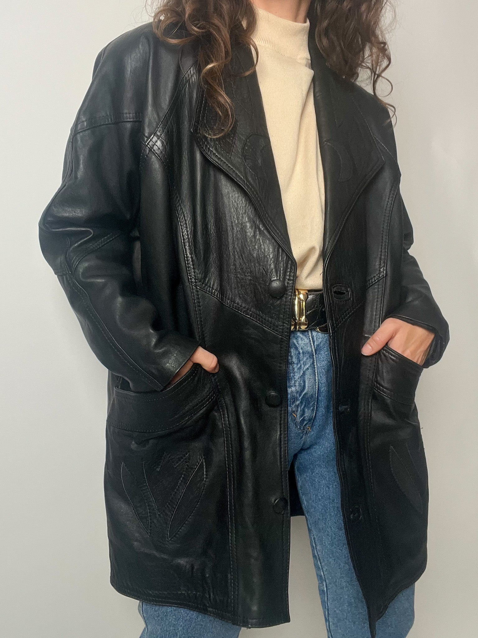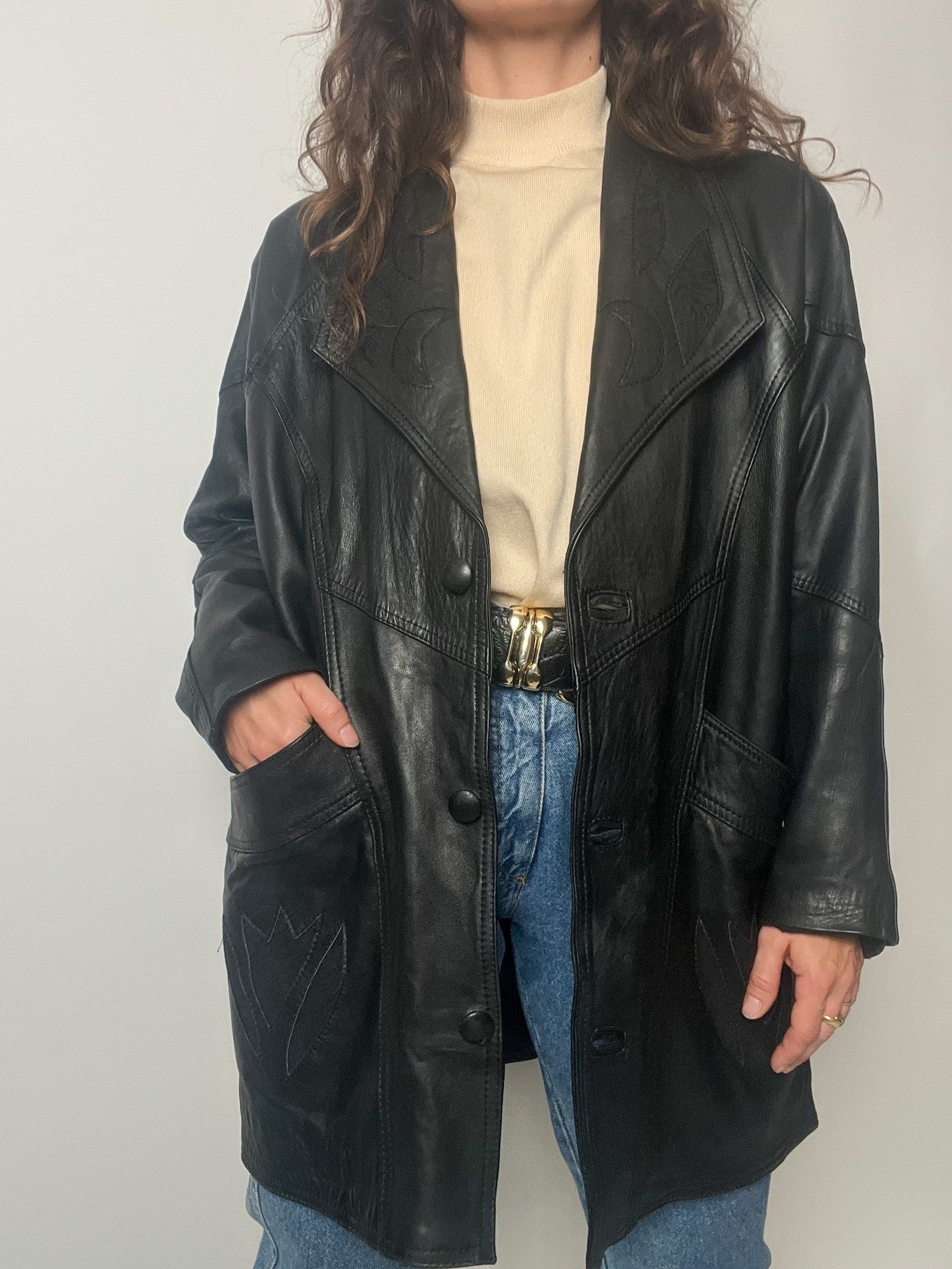 Vintage 80’s Black Leather Long Blazer with Embroidered Details