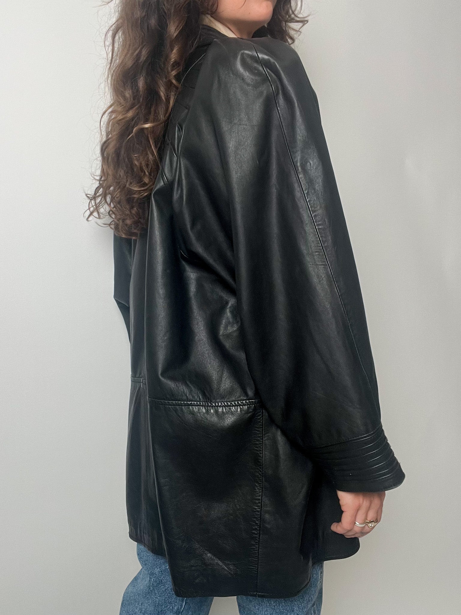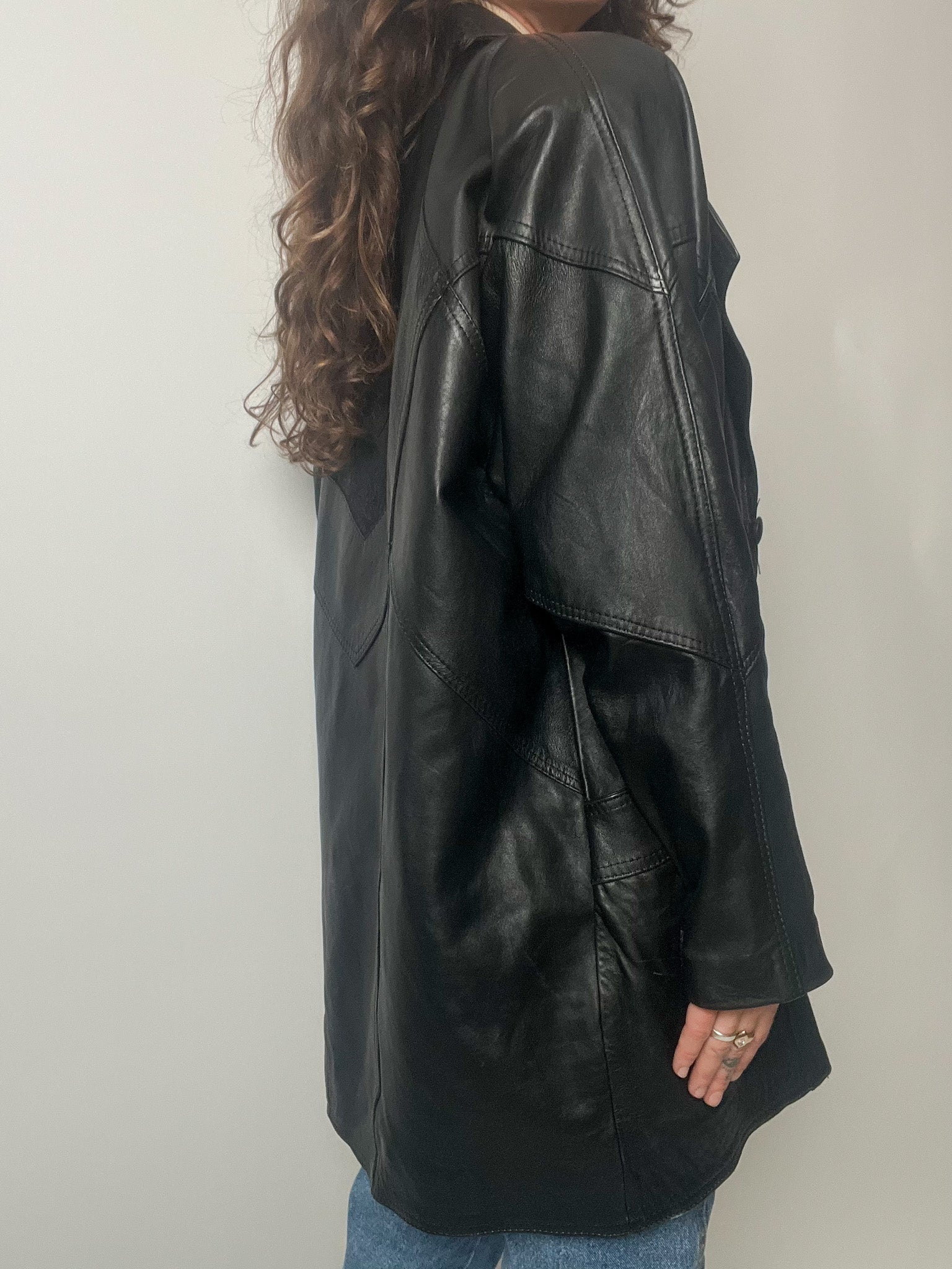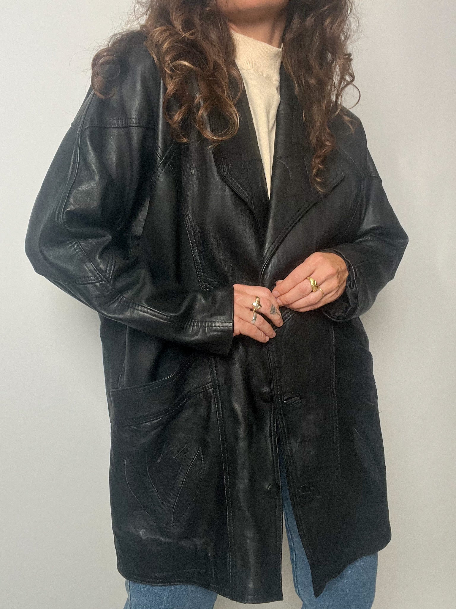 Vintage 80’s Black Leather Long Blazer with Embroidered Details