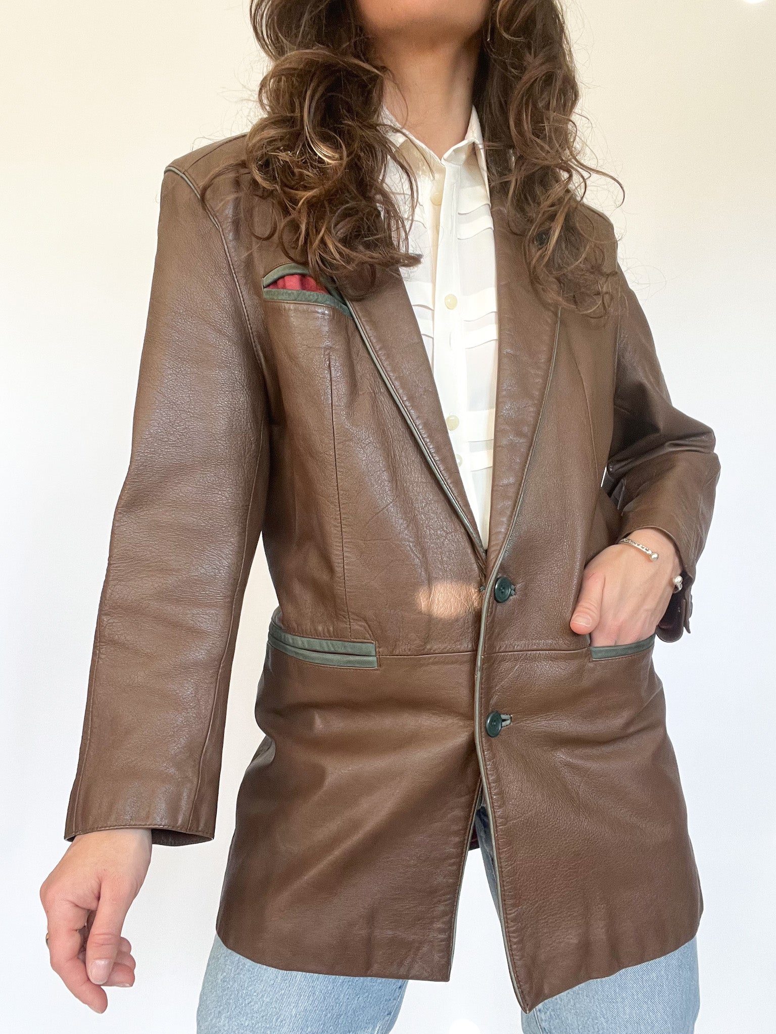 This structured leather blazer from the 80s is a masterpiece of vintage tailoring. In rich chocolate brown with subtle green piping and a faux pocket square detail, it channels classic Italian elegance with a twist. Crafted in 100% leather and fully lined, it encapsulates the Skorpiones Vintage vision — timeless, elevated, and unforgettable.