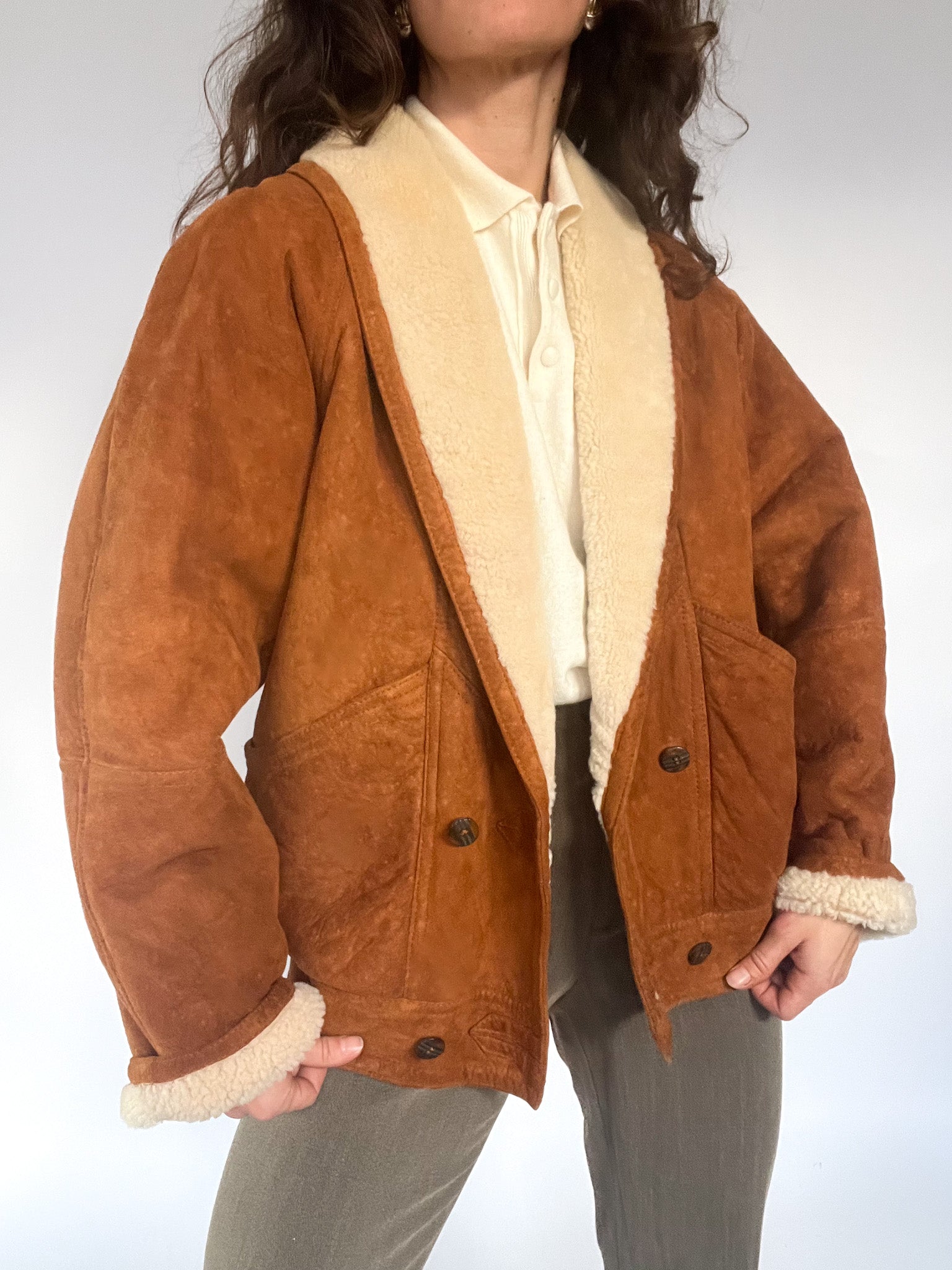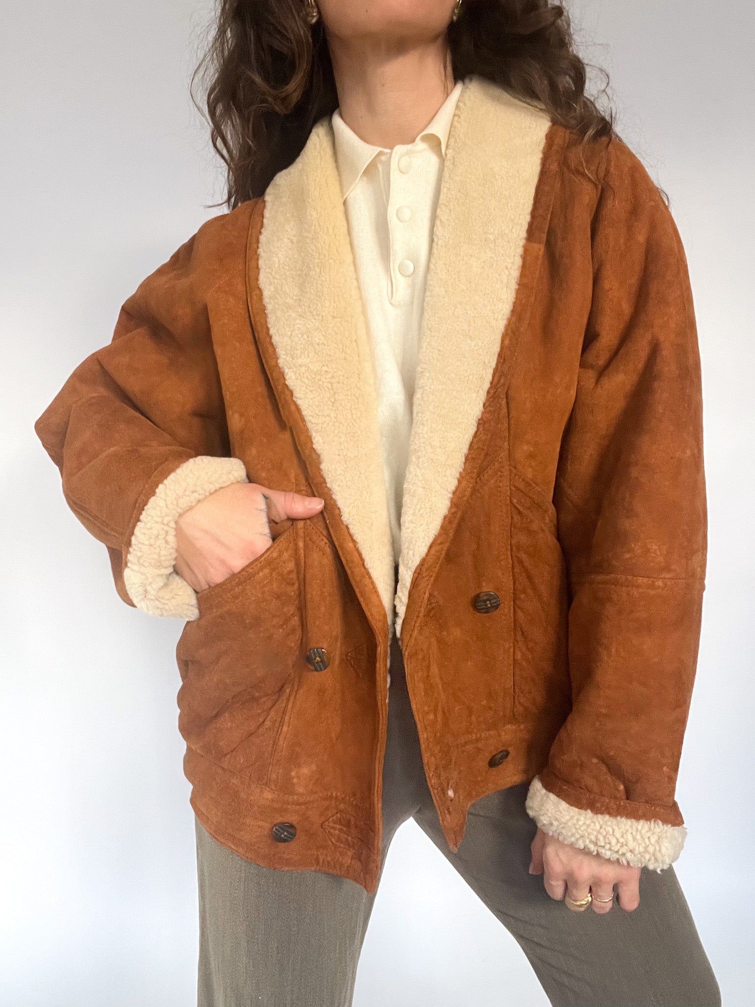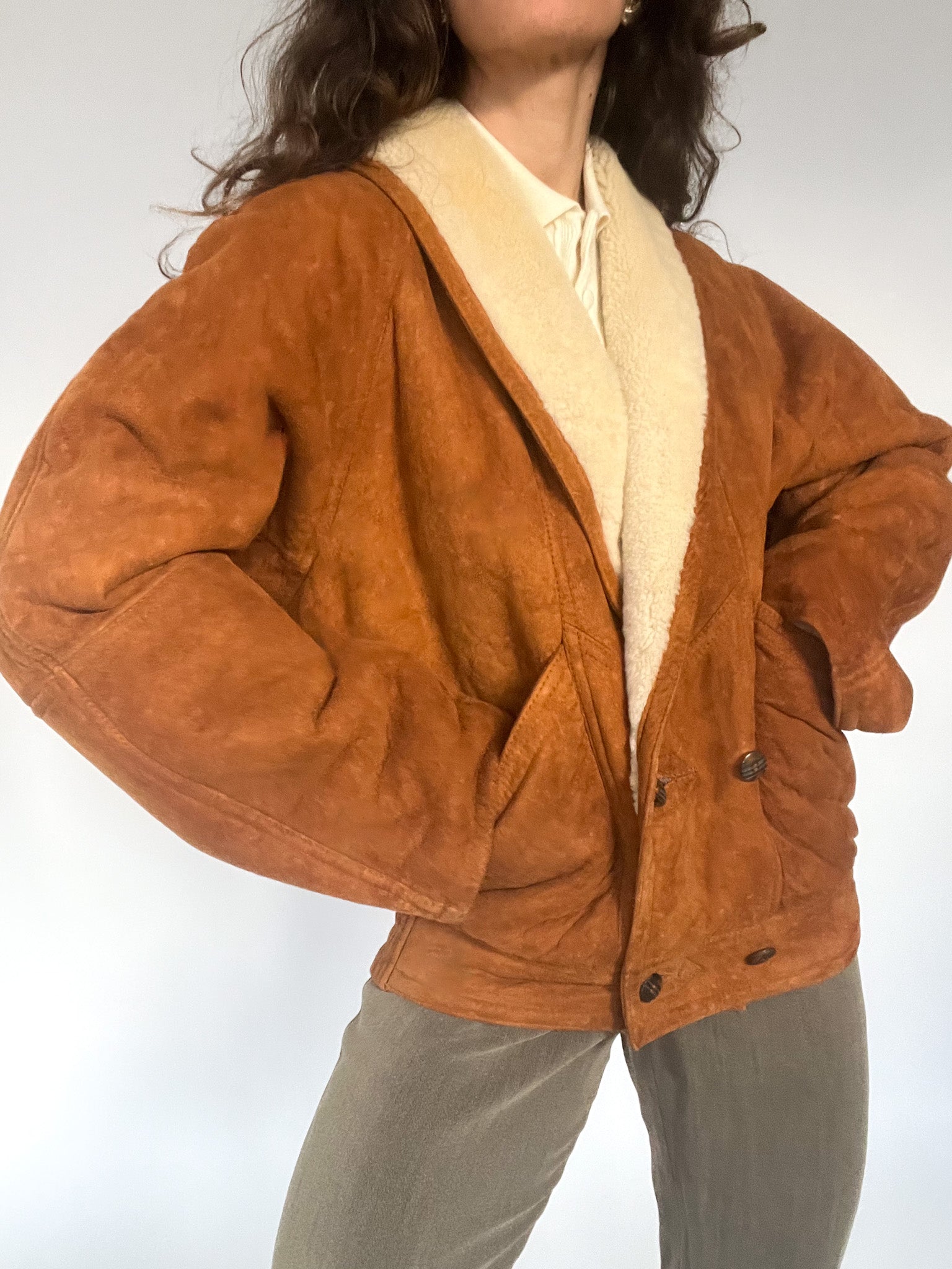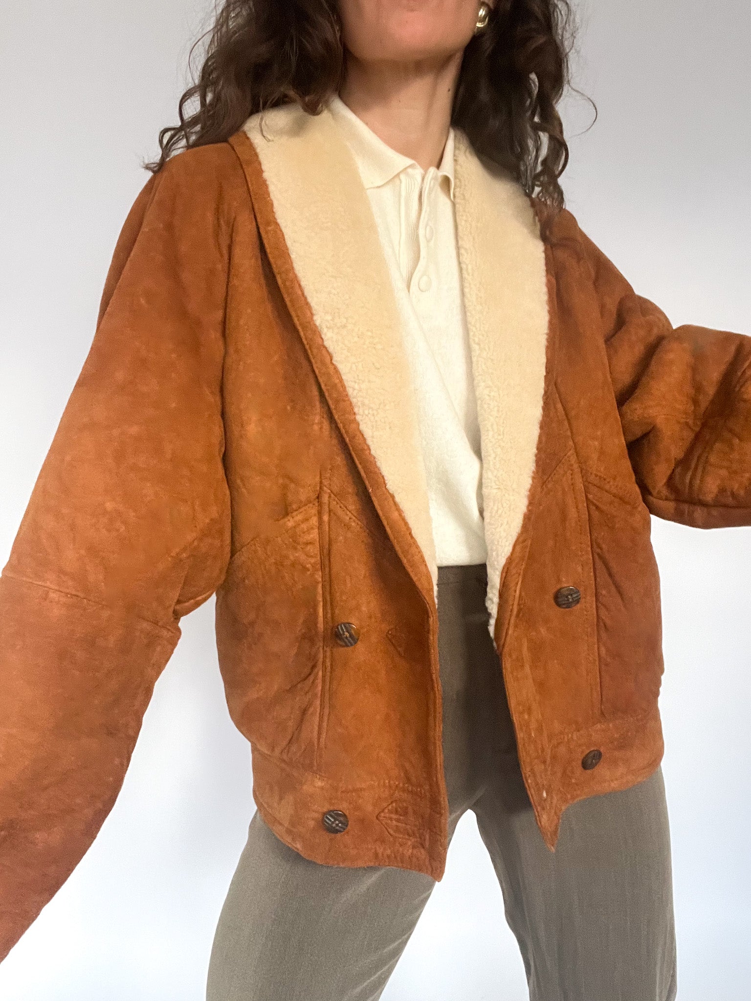 A rare 80’s shearling bomber selected for its beautifully structured shape and richly textured suede — that warm, earthy tan tone that brings instant character to any winter look. The cropped-oversized silhouette, combined with the elasticated back, creates that iconic Italian balance between softness and strength: relaxed in volume yet perfectly held in place. The deep shearling collar and cuffs add cosy contrast, while the sculptural front panels and distinctive buttons make this piece feel truly unique. In pure Skorpiones Vintage spirit, it embodies everything we love. Expressive design, noble materials, and a silhouette that empowers you the moment you slip it on.