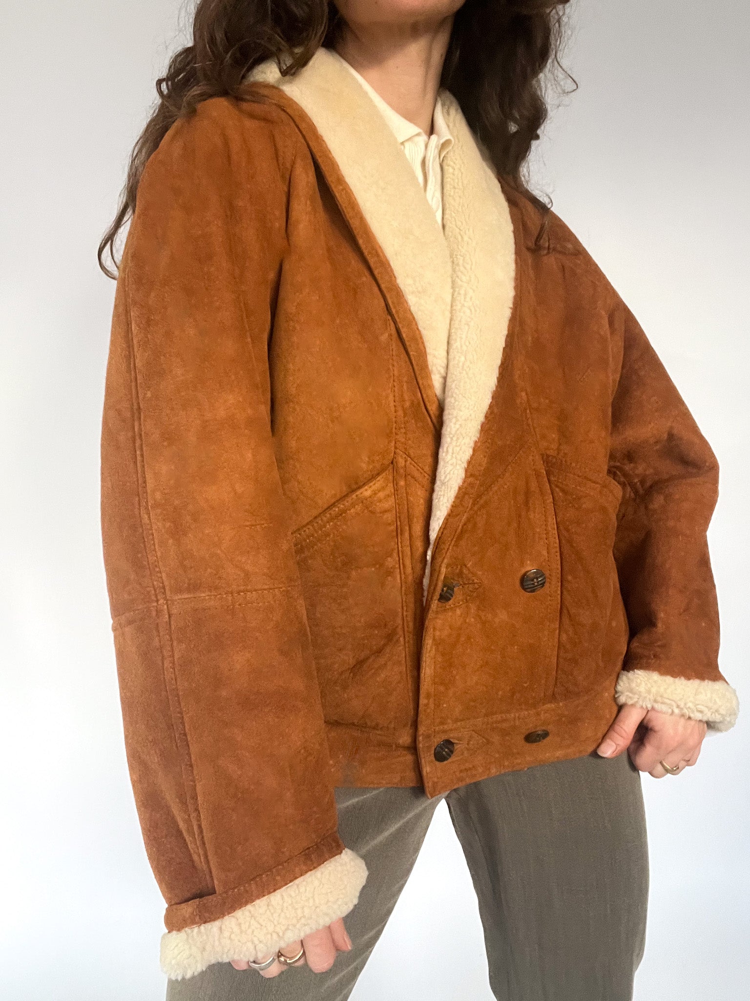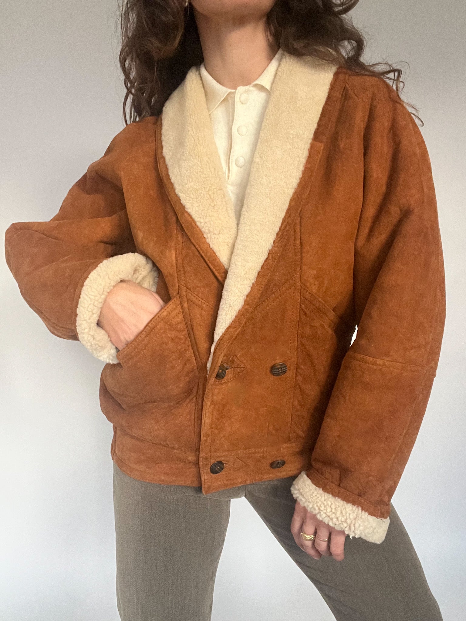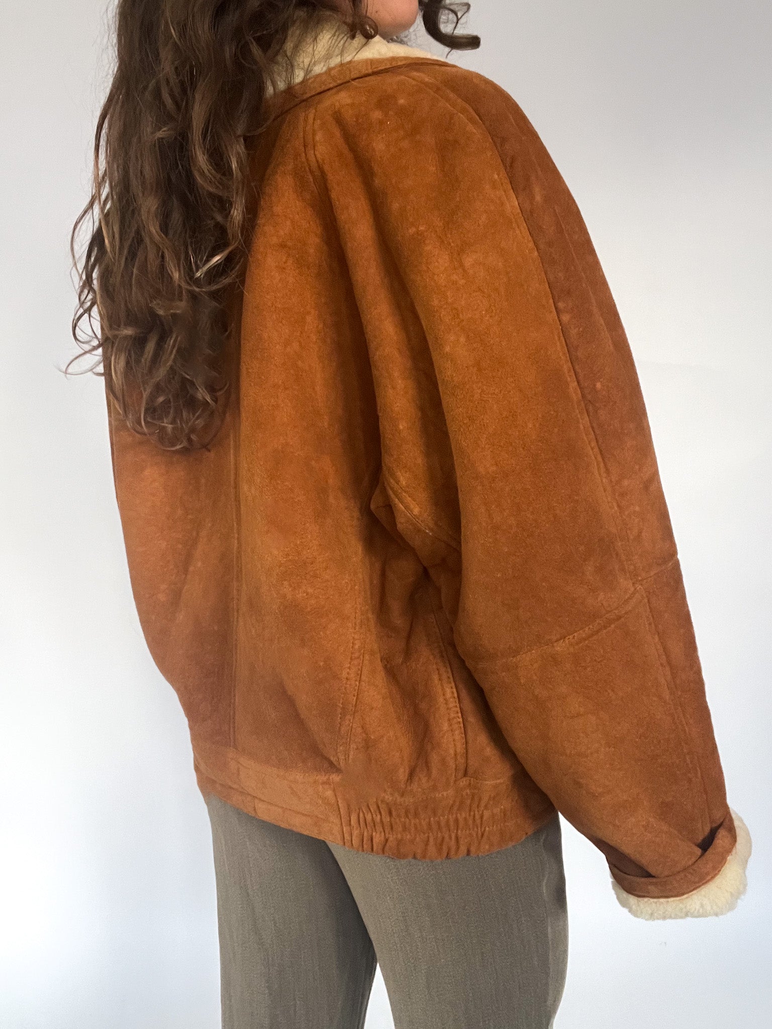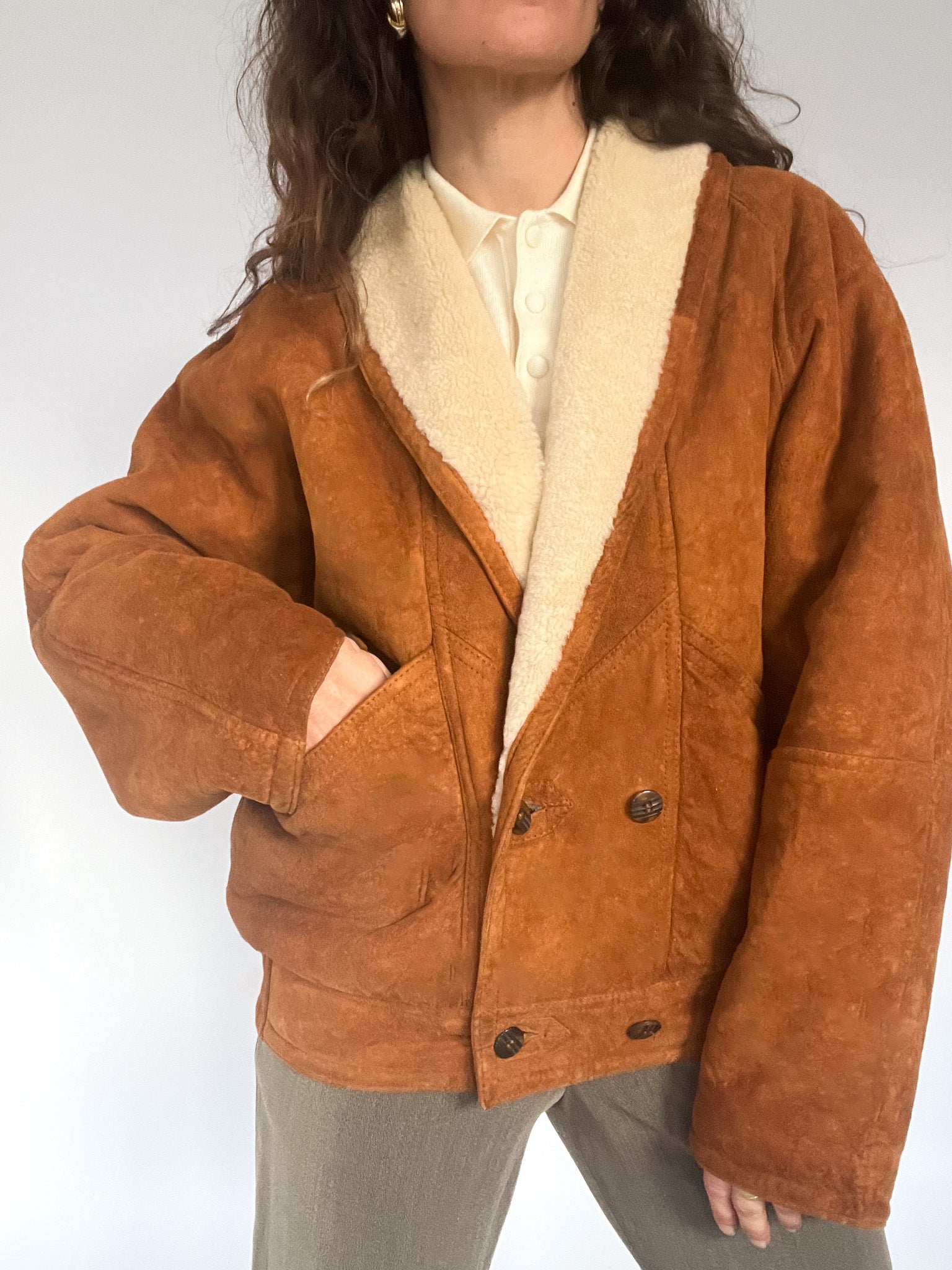A rare 80’s shearling bomber selected for its beautifully structured shape and richly textured suede — that warm, earthy tan tone that brings instant character to any winter look. The cropped-oversized silhouette, combined with the elasticated back, creates that iconic Italian balance between softness and strength: relaxed in volume yet perfectly held in place. The deep shearling collar and cuffs add cosy contrast, while the sculptural front panels and distinctive buttons make this piece feel truly unique. In pure Skorpiones Vintage spirit, it embodies everything we love. Expressive design, noble materials, and a silhouette that empowers you the moment you slip it on.