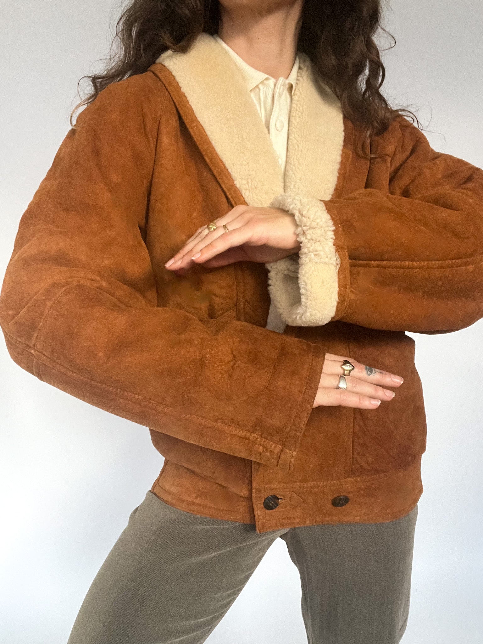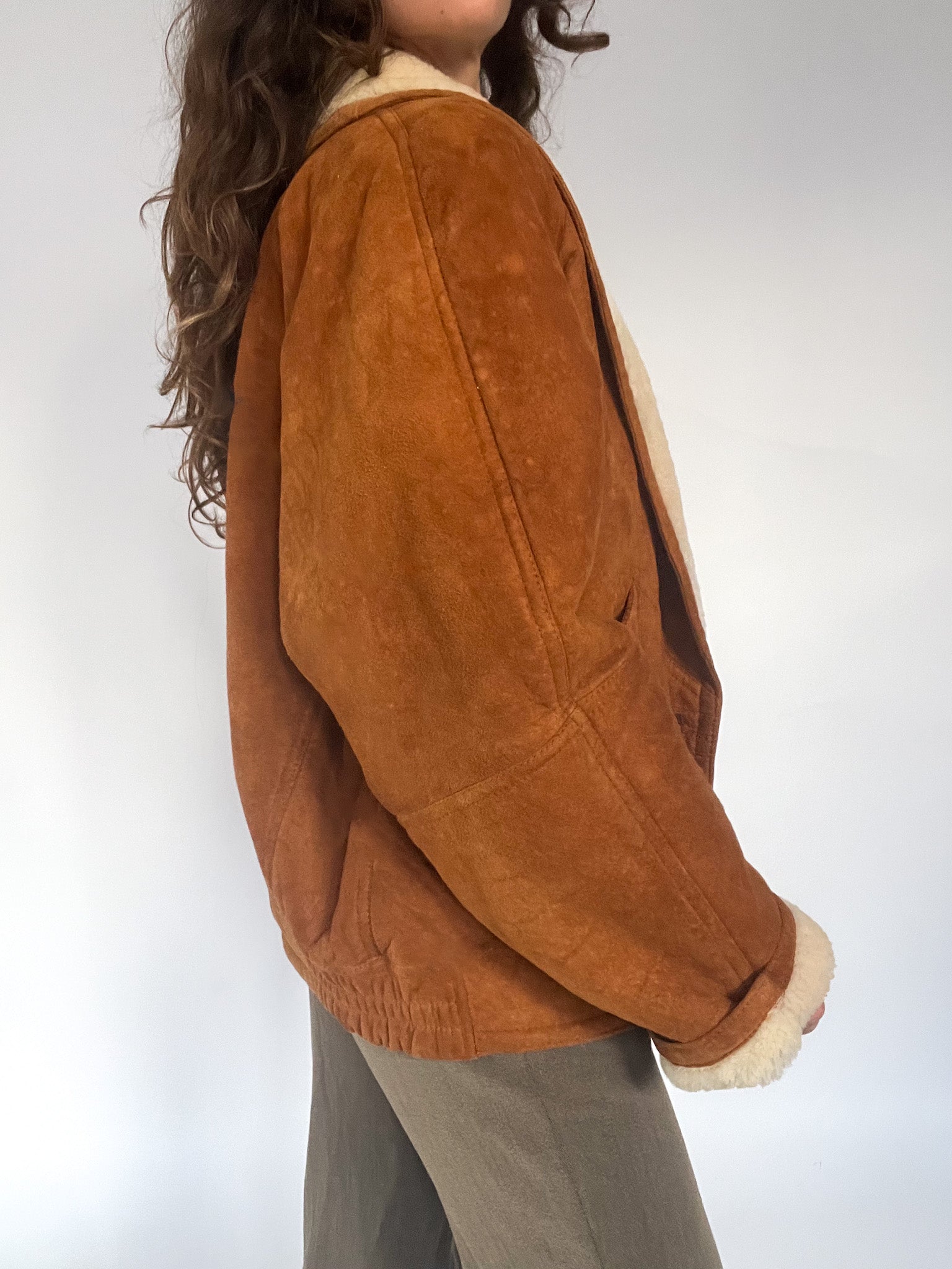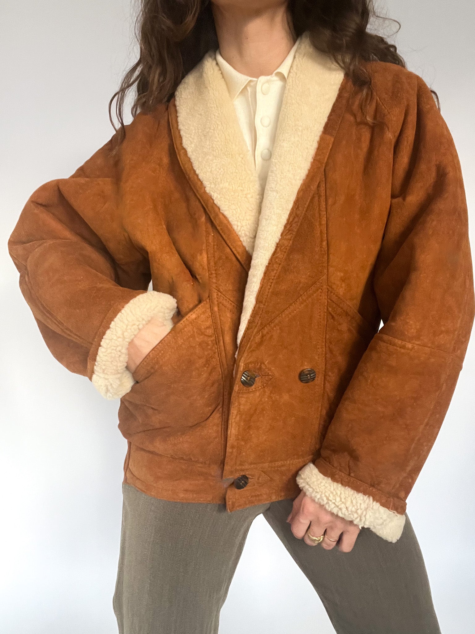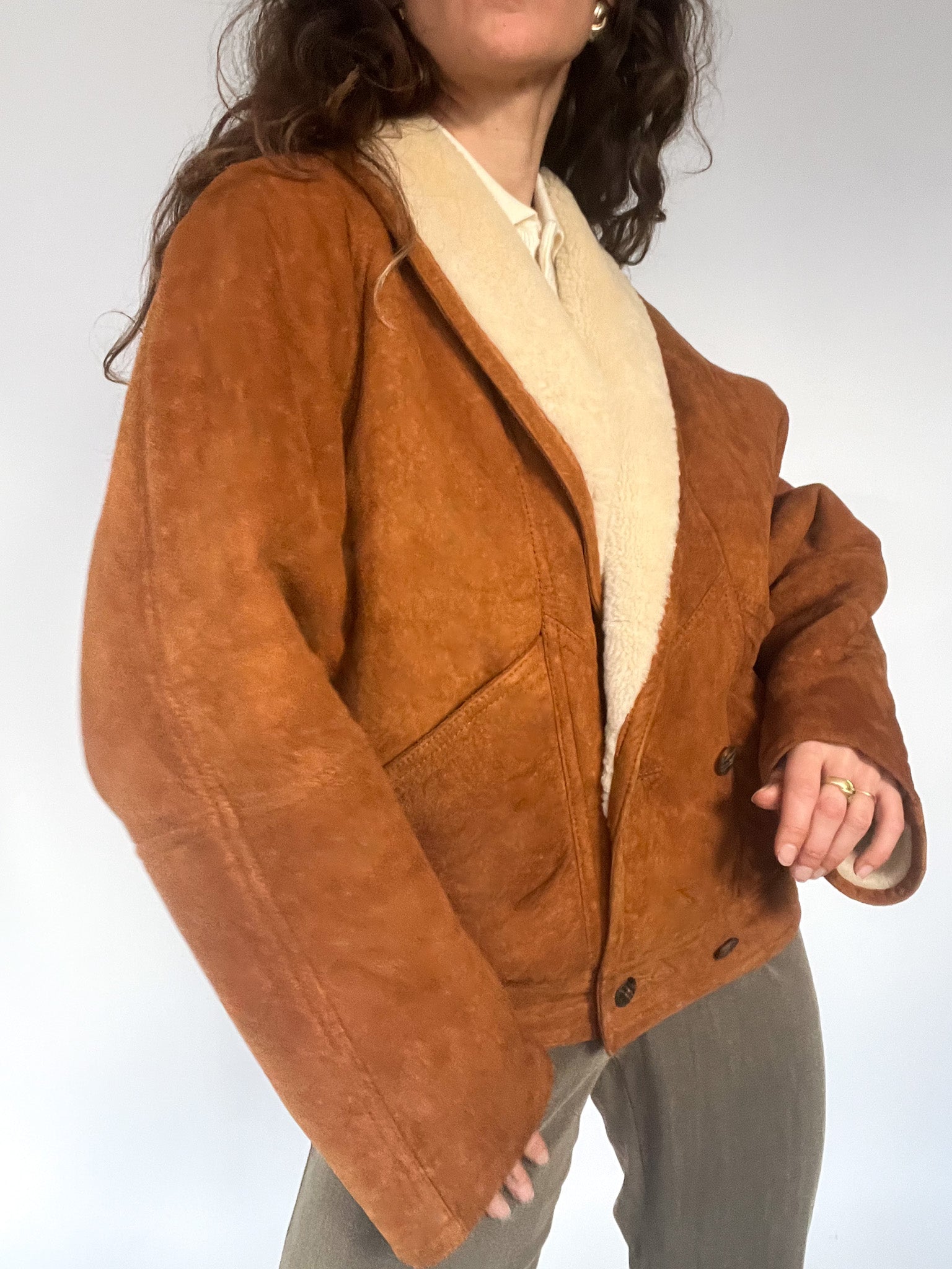A rare 80’s shearling bomber selected for its beautifully structured shape and richly textured suede — that warm, earthy tan tone that brings instant character to any winter look. The cropped-oversized silhouette, combined with the elasticated back, creates that iconic Italian balance between softness and strength: relaxed in volume yet perfectly held in place. The deep shearling collar and cuffs add cosy contrast, while the sculptural front panels and distinctive buttons make this piece feel truly unique. In pure Skorpiones Vintage spirit, it embodies everything we love. Expressive design, noble materials, and a silhouette that empowers you the moment you slip it on.