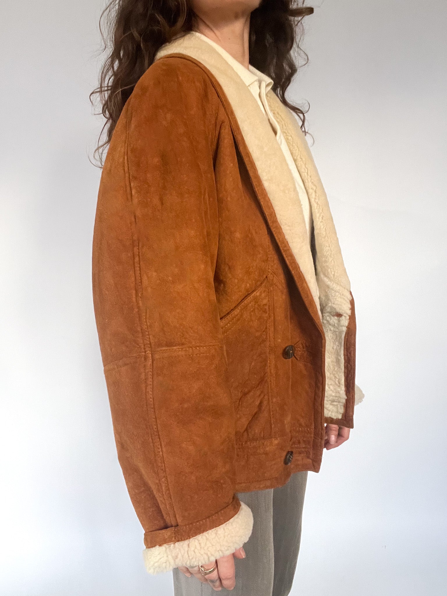 - Condition: Good, the suede shows subtel drop patina throughout - a natural variation from previous wear - which has been evened out as much as possible. The slight nuance does not affect the structure or quality of the coat and remains consistent with the charm and authenticité of true vintage shearling. The price is slightly lower for this reason.