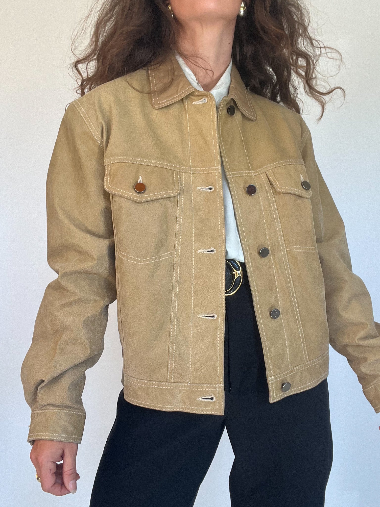 • Special features: Trucker-style cut, chest flap pockets, metal button closure, visible patina adding character