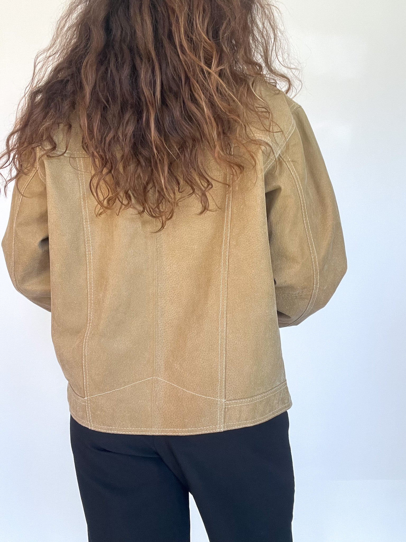 This vintage 80’s jacket reimagines the classic trucker silhouette in a bold cracked leather finish. Its structured lines, double chest pockets, and metal button closure give it a rugged yet refined character, perfect for those who want their wardrobe to exude strength and originality. The tan tone enhances its vintage patina, making it not only a versatile layering piece but also a true collectible. At Skorpiones Vintage, each piece is chosen for its authenticity and power of expression. This jacket embodies exclusivity, offering the wearer the confidence to stand apart with a look that is both timeless and rebellious.