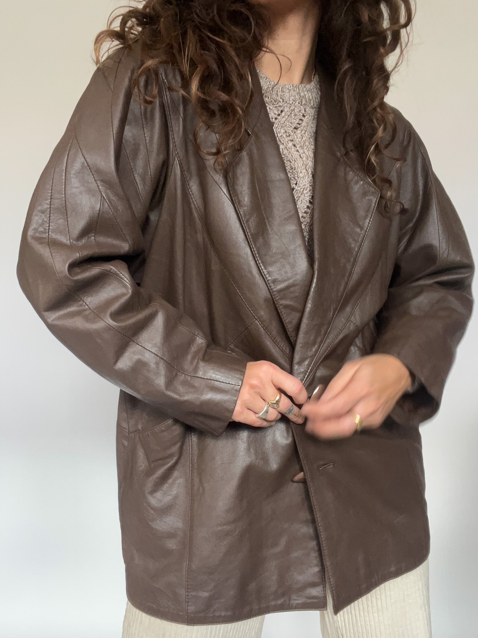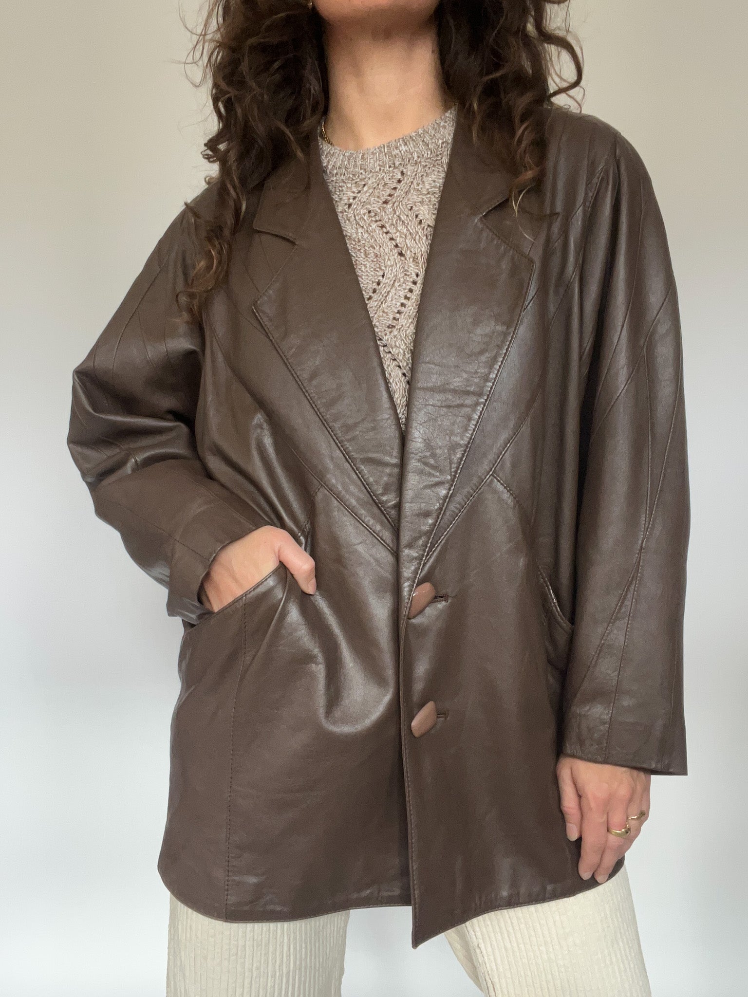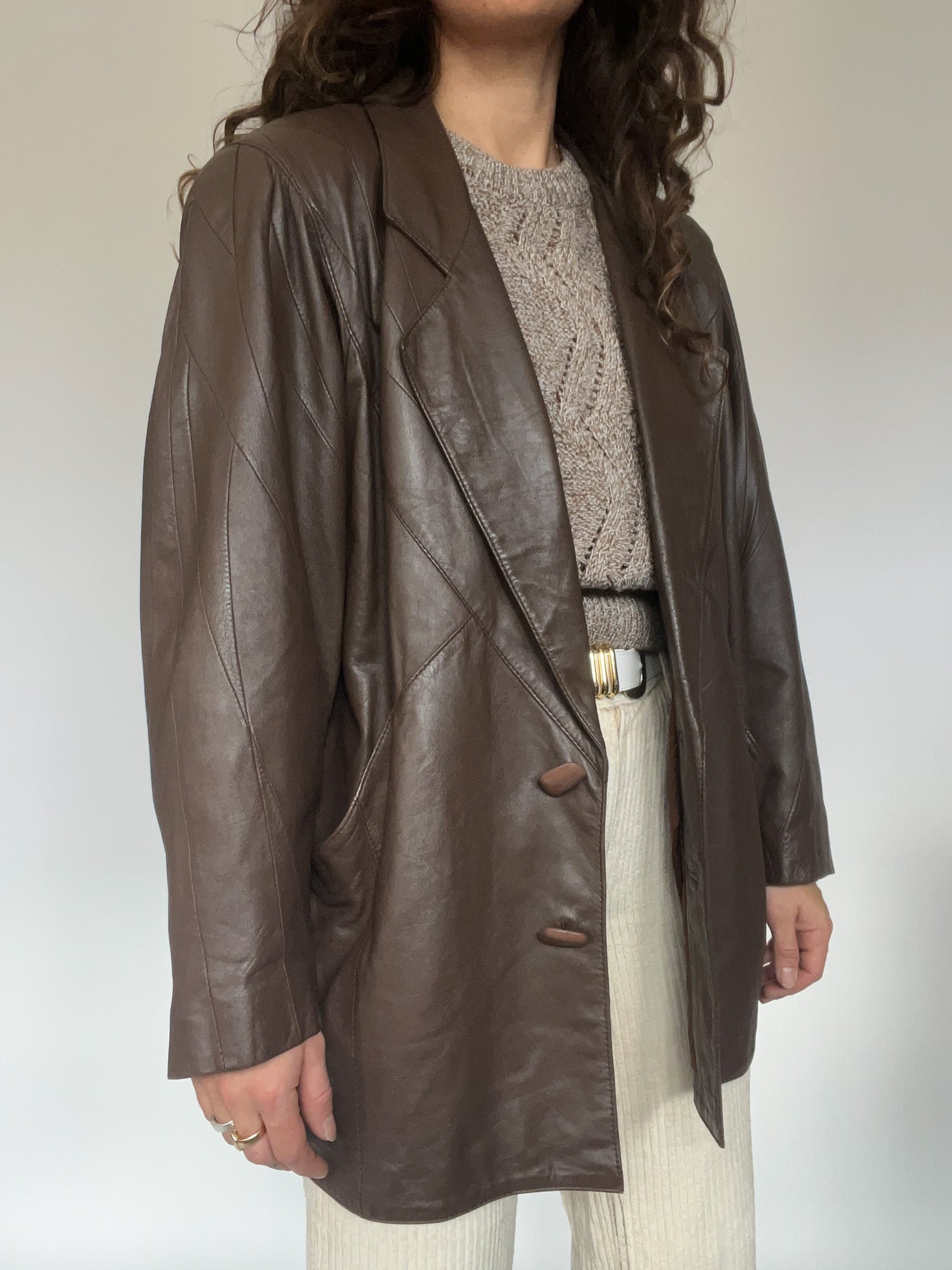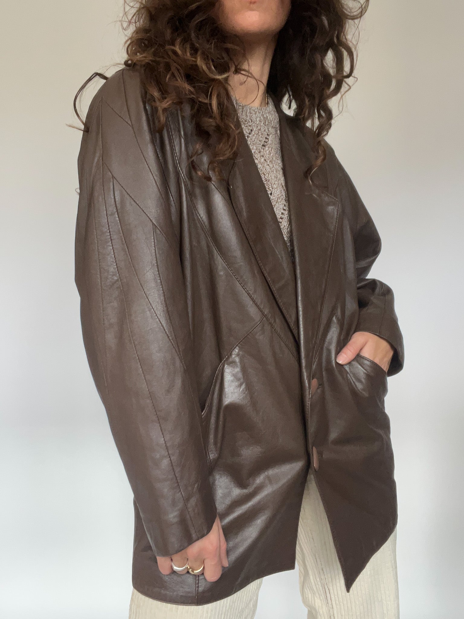 An elegant statement piece from the 80’s, this dark mocha leather blazer perfectly blends minimalism and strength. The sleek geometric stitching gives structure to its fluid silhouette, while the oversized lapels bring a bold, modern feel. A timeless jacket that embodies the refined confidence and understated luxury central to the Skorpiones Vintage aesthetic.