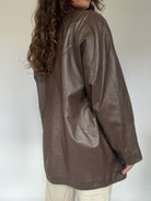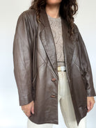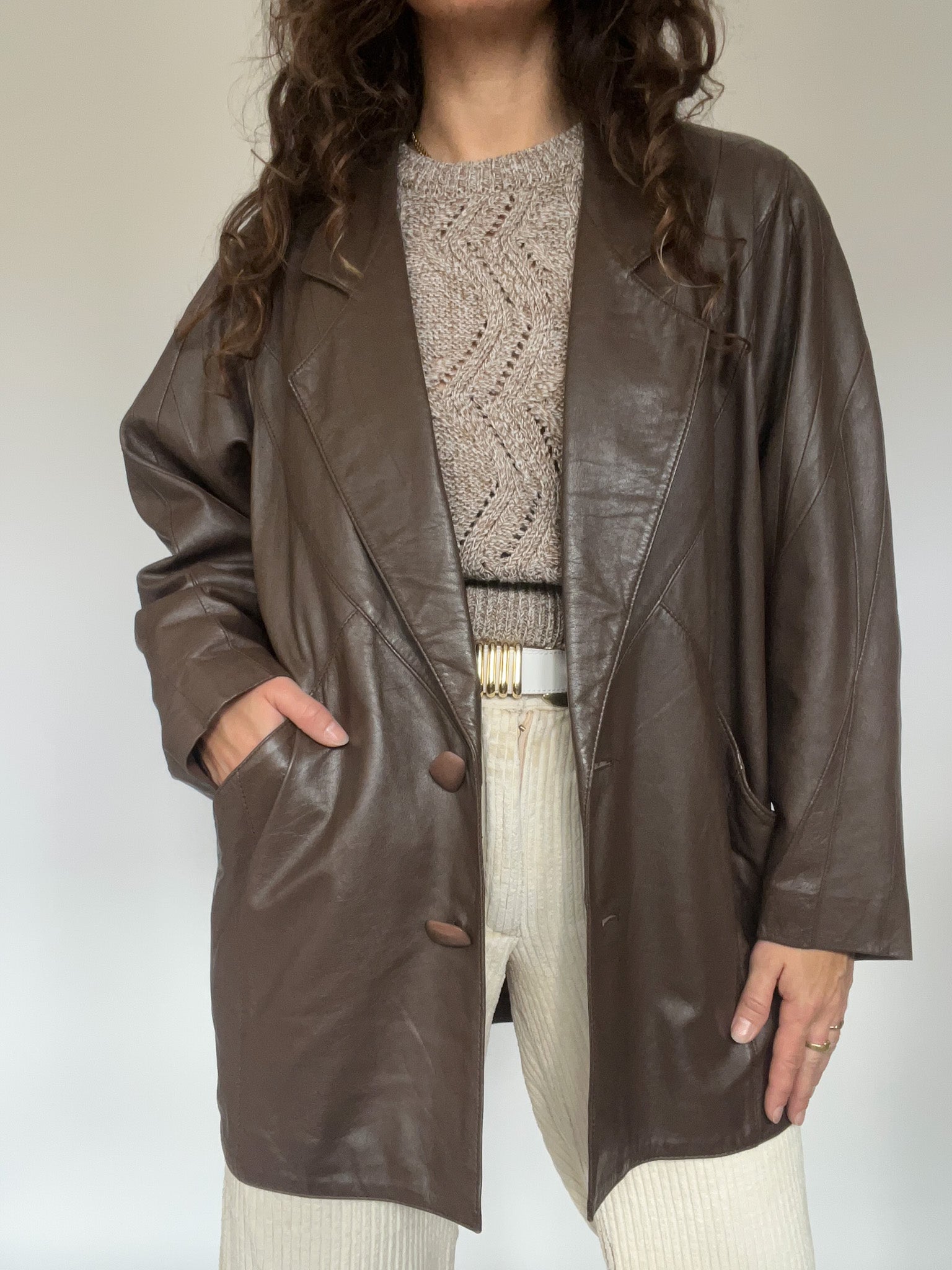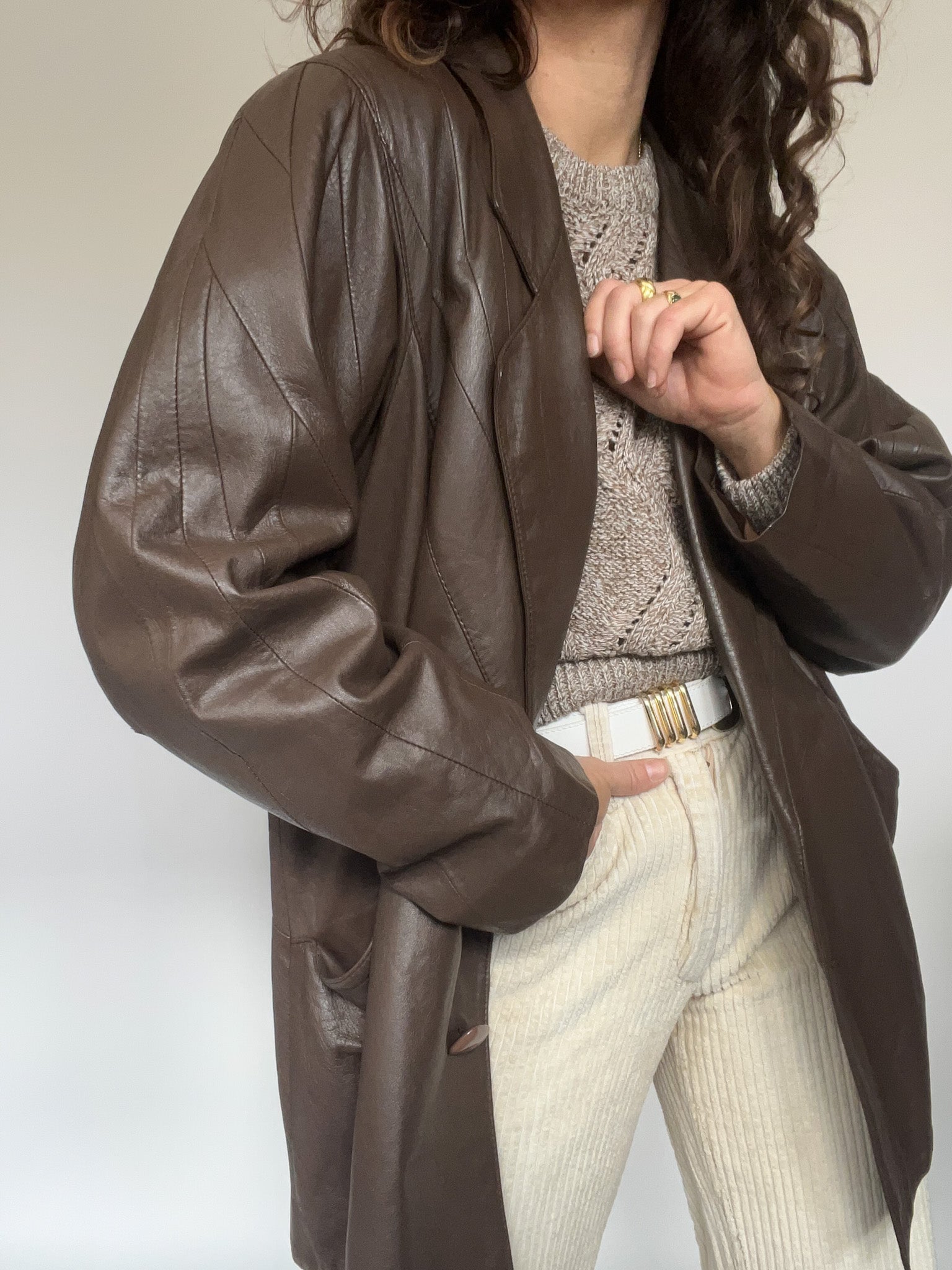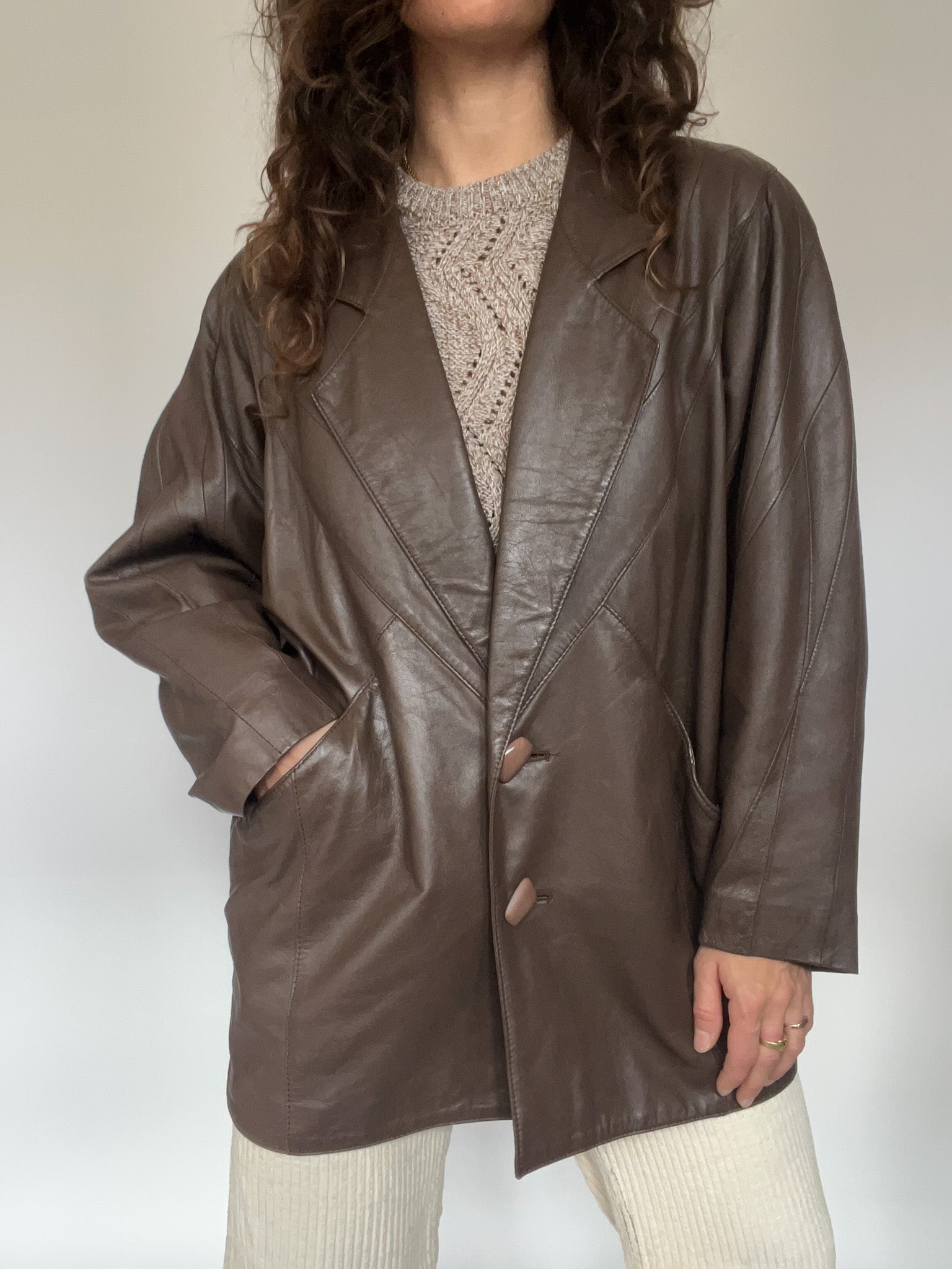 An elegant statement piece from the 80’s, this dark mocha leather blazer perfectly blends minimalism and strength. The sleek geometric stitching gives structure to its fluid silhouette, while the oversized lapels bring a bold, modern feel. A timeless jacket that embodies the refined confidence and understated luxury central to the Skorpiones Vintage aesthetic.