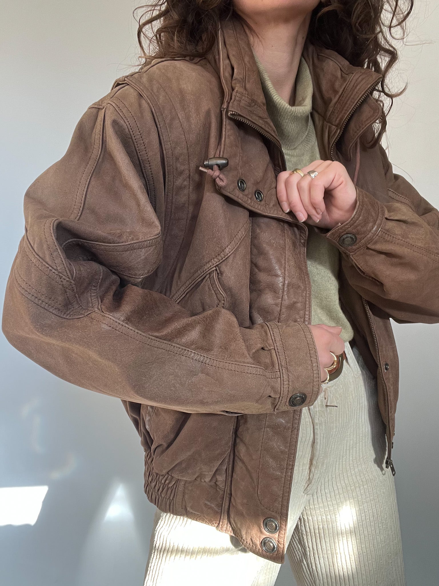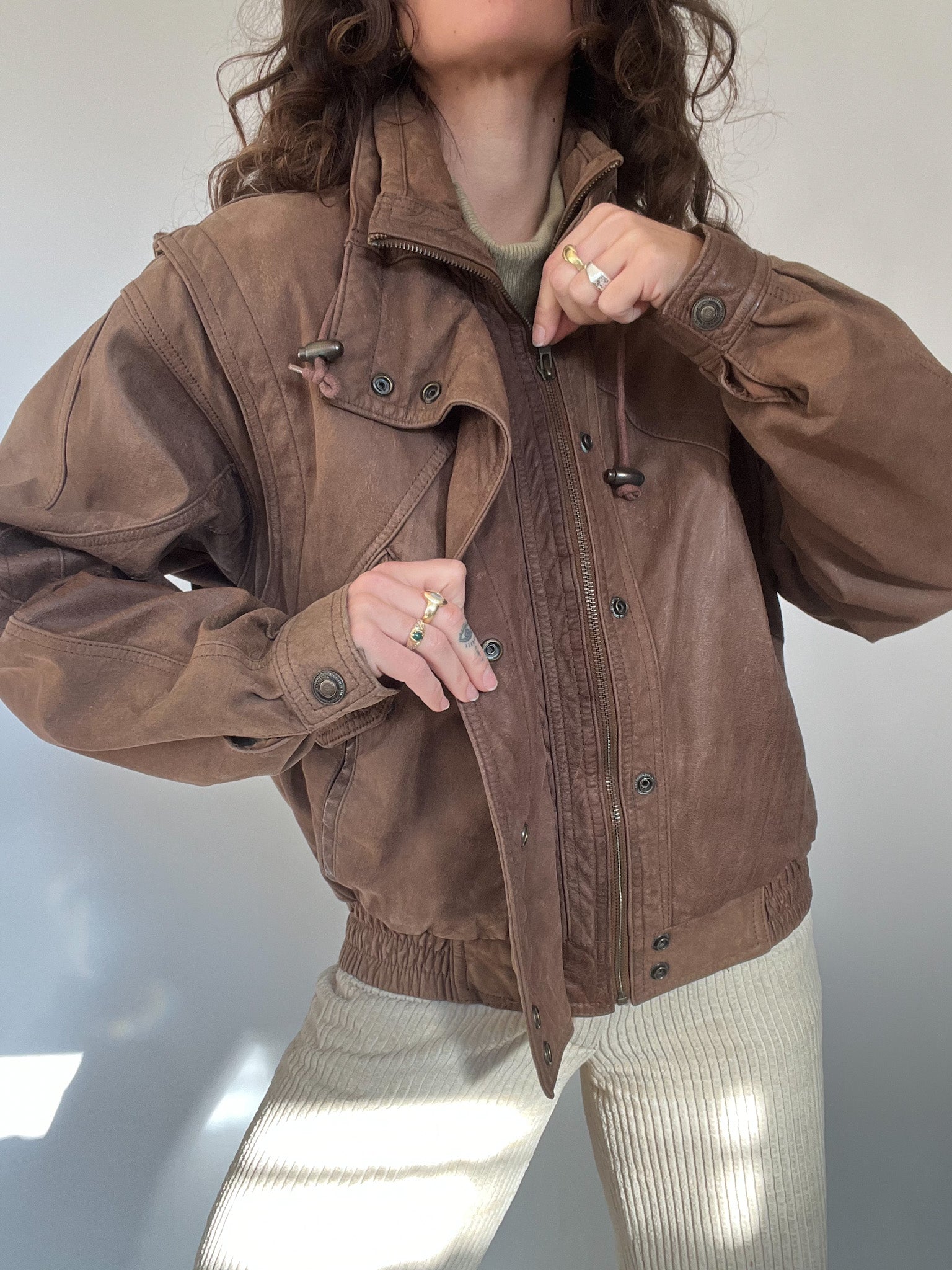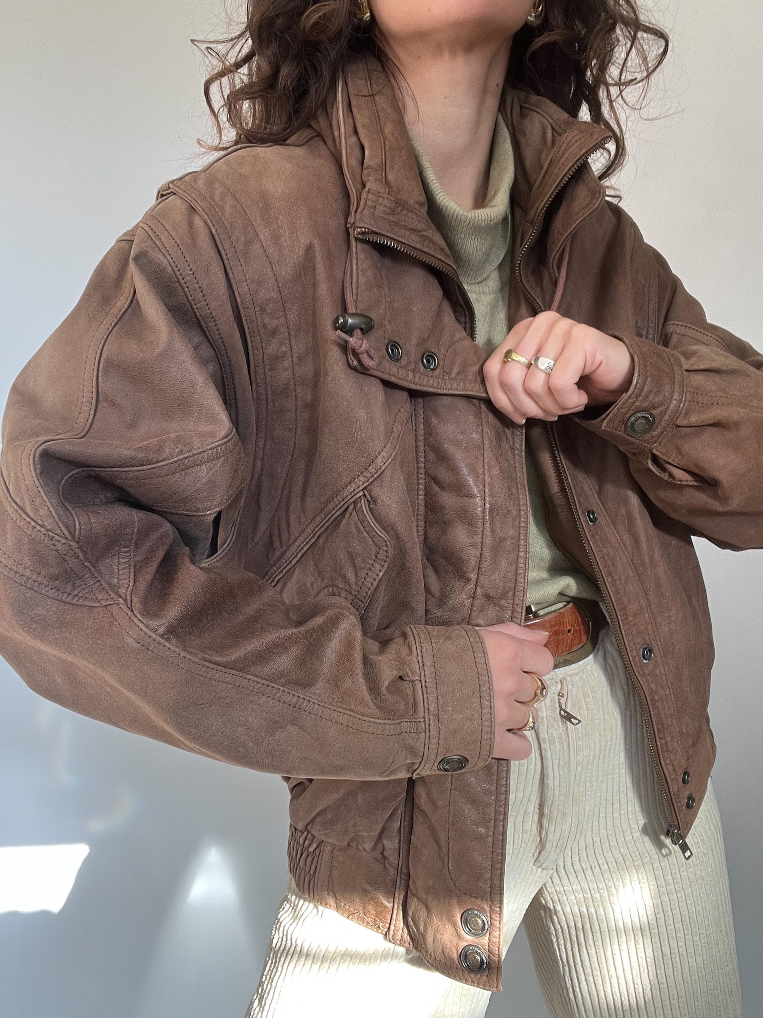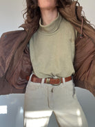 A beautifully lived-in taupe leather bomber with a sculptural, structured silhouette. The kind of piece that defines the effortless strength and character at the heart of Skorpiones Vintage. Its adjustable high collar can be styled in multiple ways, creating a bold cocoon effect that protects from the cold while elevating the entire look. The stitching, the draped leather, the perfectly aged patina, everything about this jacket makes it an iconic winter masterpiece. A true statement piece for women who dress to feel powerful, unique, and unmistakably themselves.