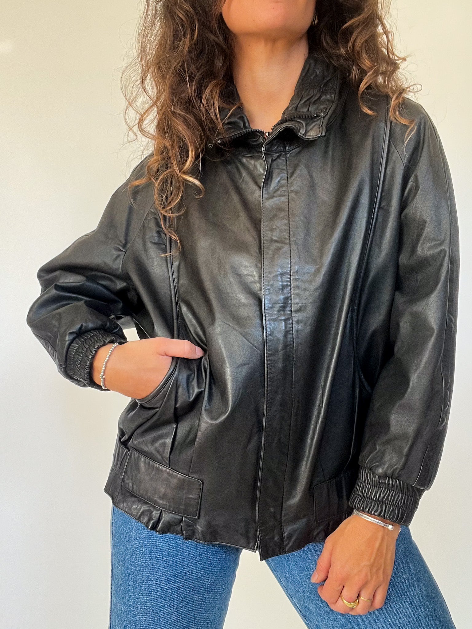 This vintage 90’s bomber jacket in smooth black leather captures the effortless cool of the decade, blending casual comfort with bold attitude. The elasticated cuffs and hem create that classic bomber silhouette, while the high collar and front zip closure give it a structured edge. A versatile piece that works just as well with jeans as with a slip dress, embodying the rebellious, timeless energy of Skorpiones Vintage — strong, unique, and iconic.