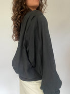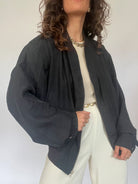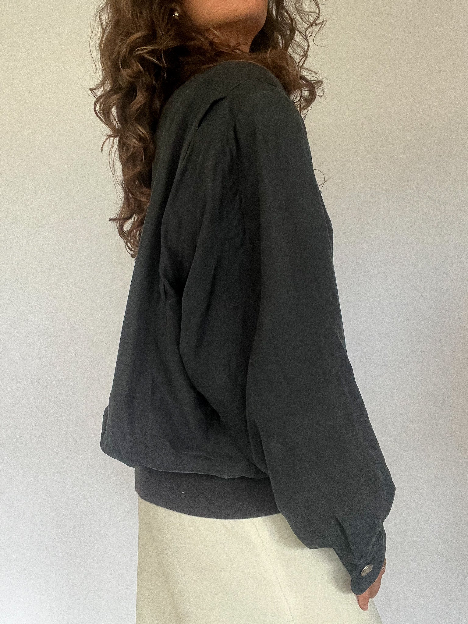 Powerfully minimal, this black silk bomber is a foundation piece—essential, versatile, and full of presence. The weight and fall of the silk bring movement, while the silhouette holds structure. An everyday icon that works across decades, moods, and styles.