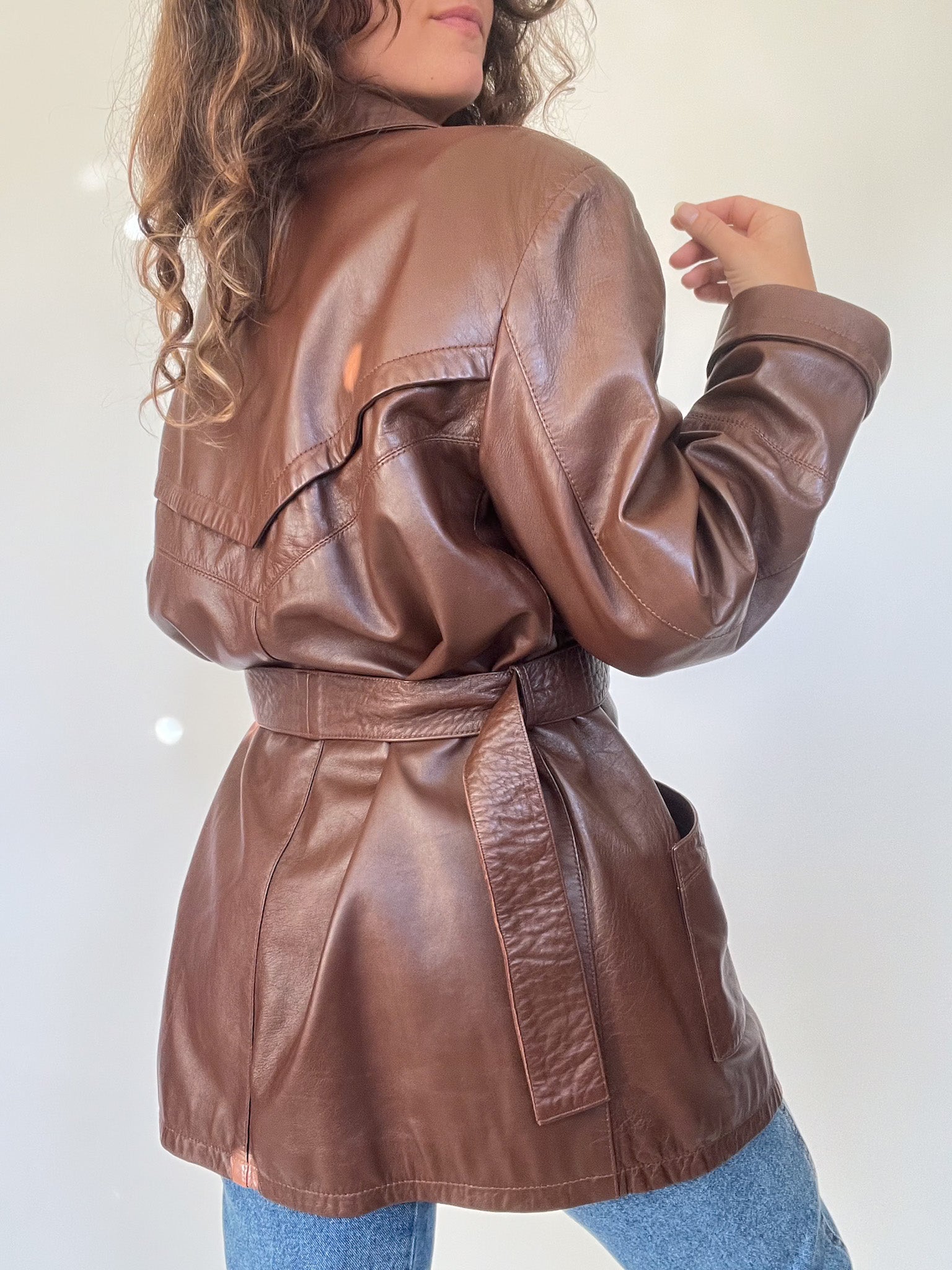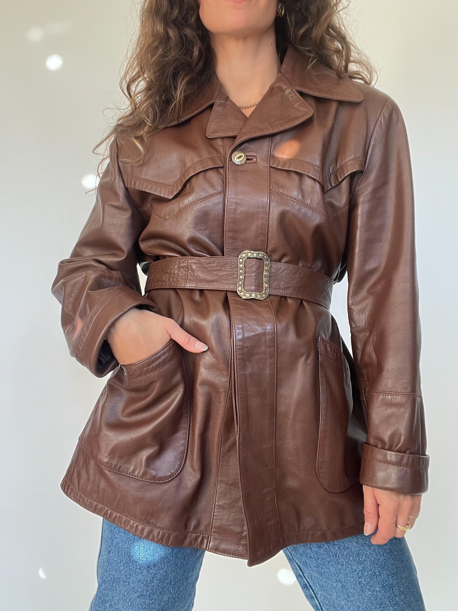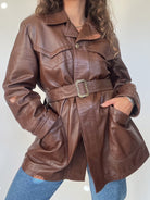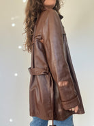 This 90’s brown leather jacket captures the essence of bold femininity with its structured shoulders, oversized patch pockets, and a cinched waist thanks to its matching belt. The warm chestnut tone softens its strong silhouette, offering both edge and elegance. Designed in Italy, it embodies quality and timeless craftsmanship. Whether worn open for a relaxed look or belted to emphasize the waist, this piece radiates the confidence and individuality that define Skorpiones Vintage.