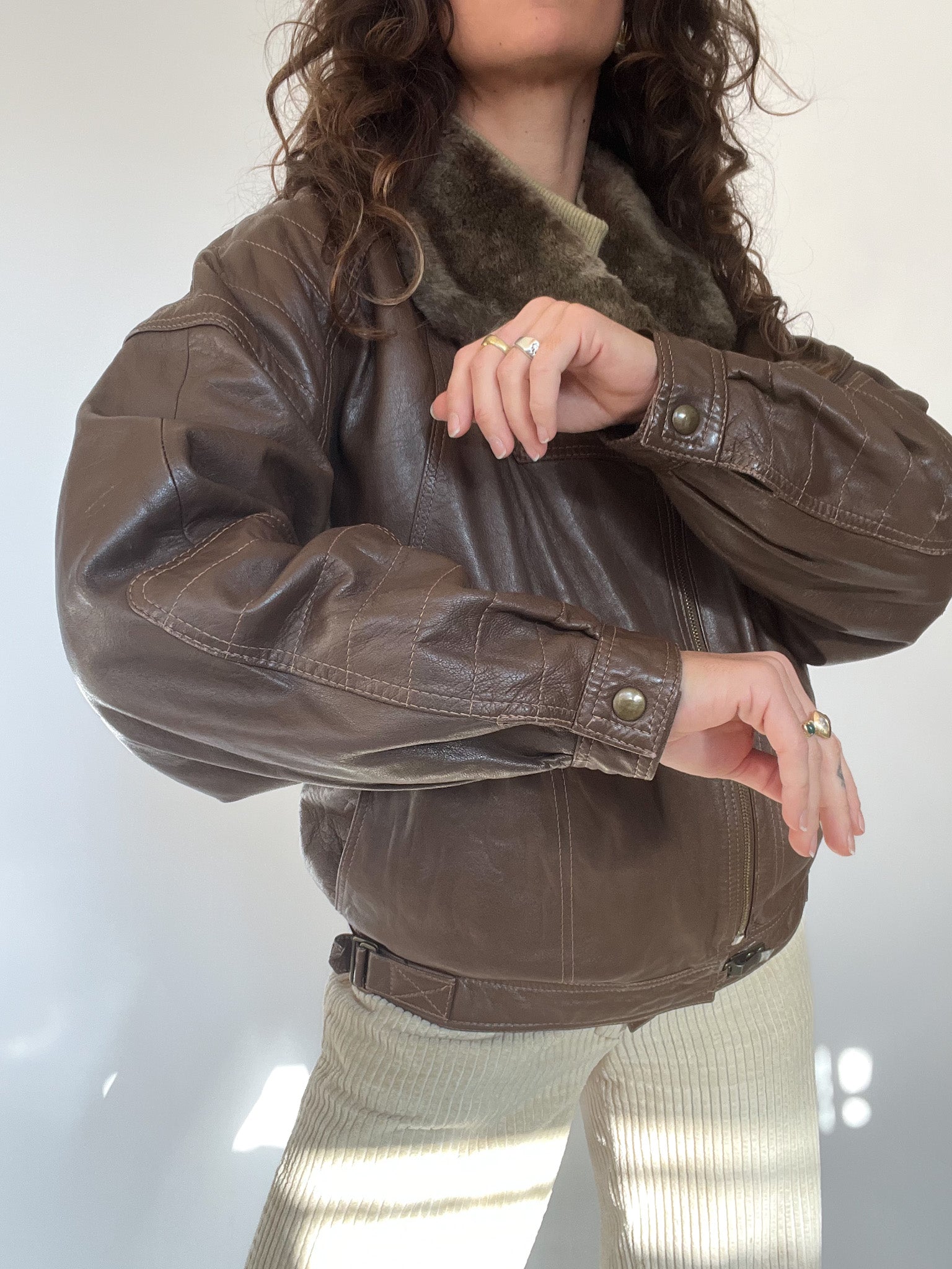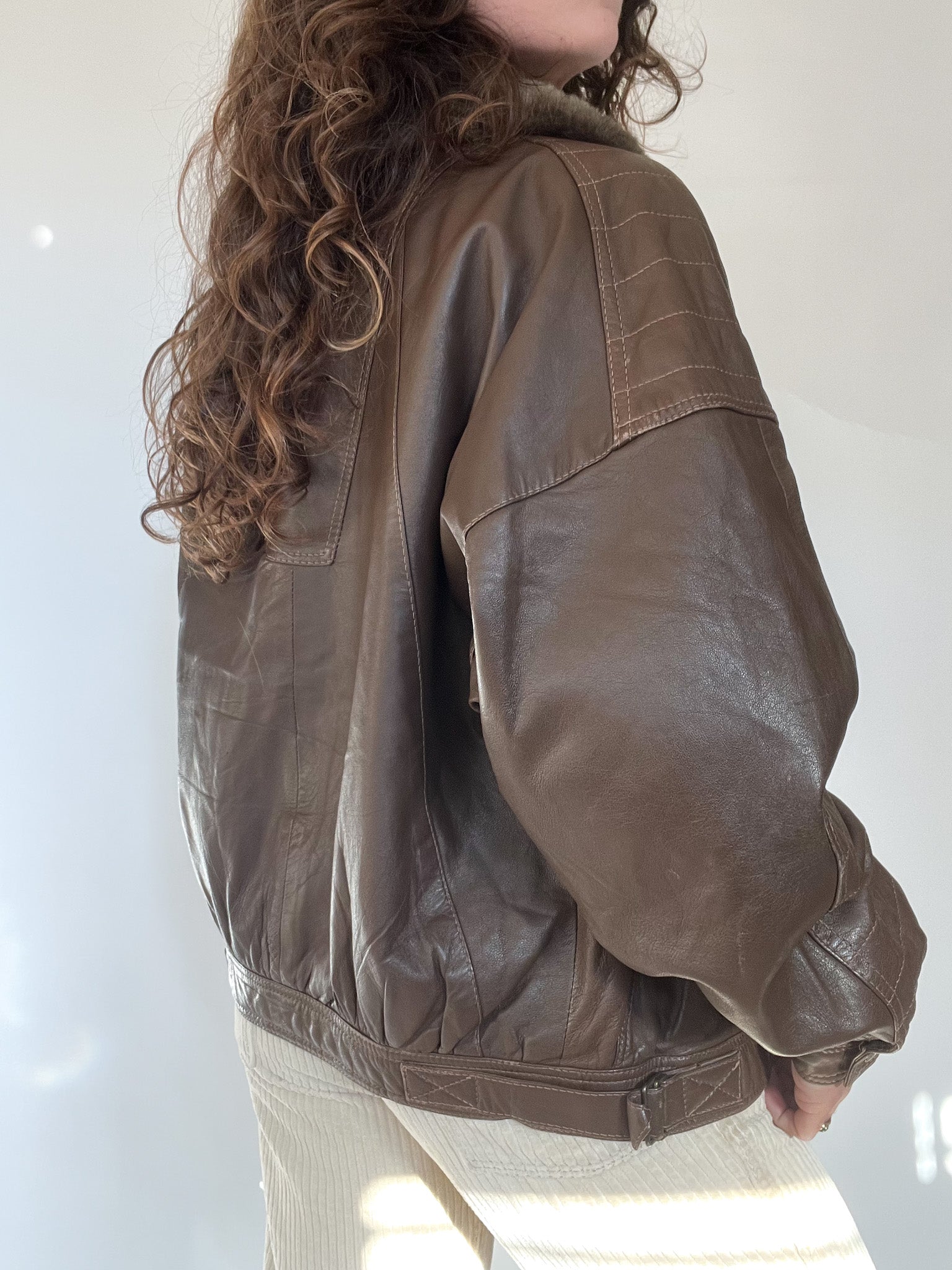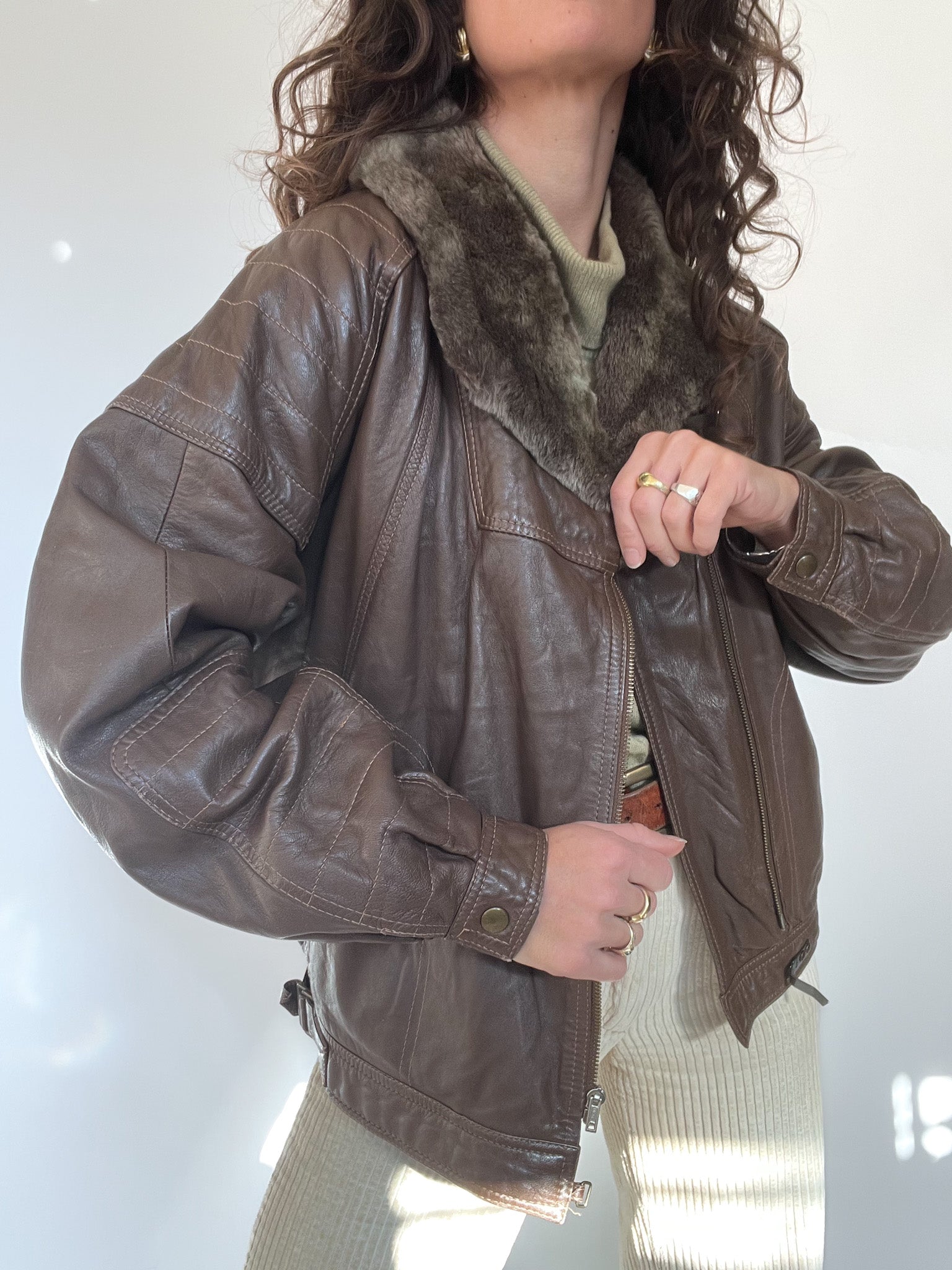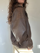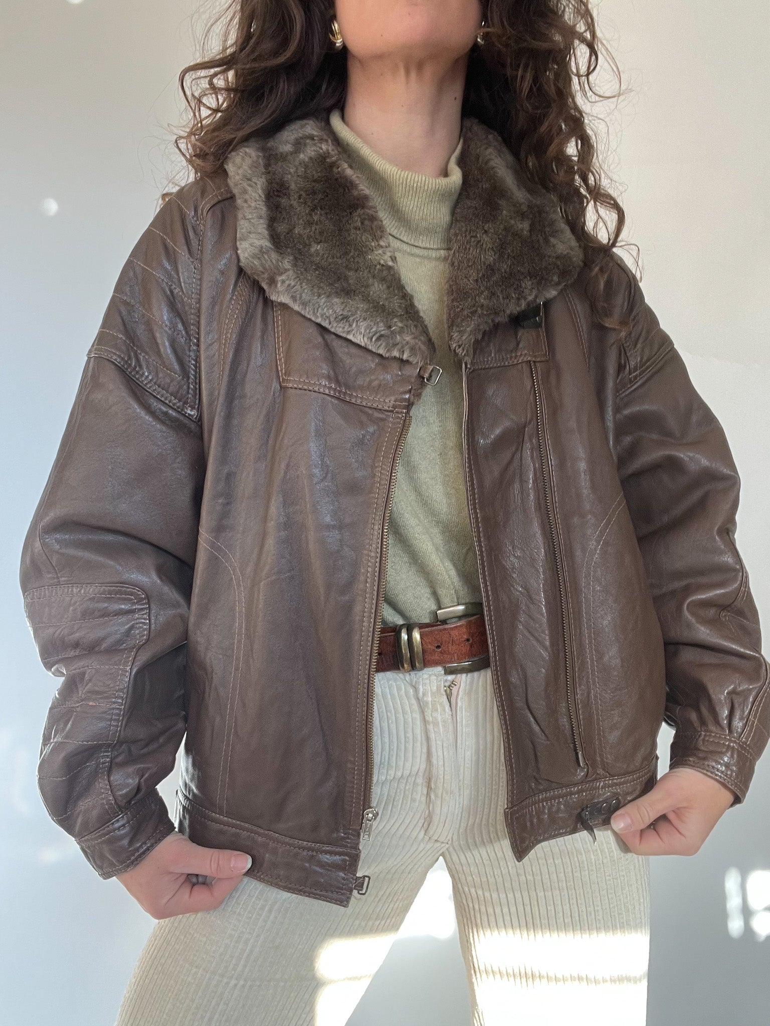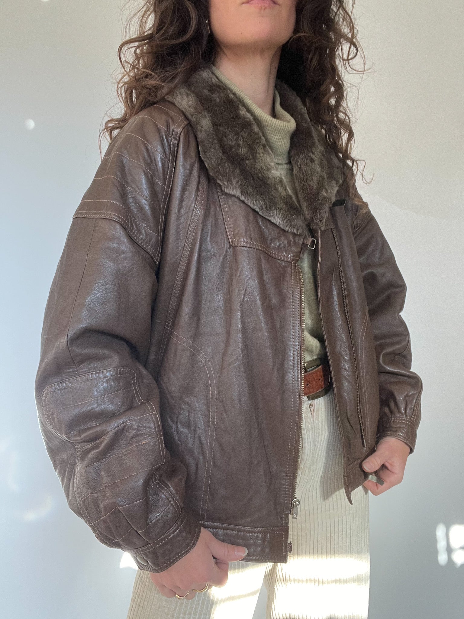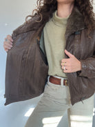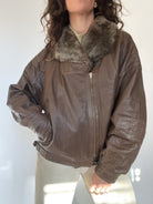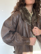 A beautifully structured vintage leather jacket in a rich chocolate brown, featuring a soft faux-fur collar that instantly elevates the silhouette. This is the kind of winter statement piece Skorpiones Vintage loves — warm, character-filled and unmistakably unique. Its oversized fit, textured leather and subtle panel details make it incredibly flattering and easy to style. Perfect layered over chunky knits for a true vintage winter look.