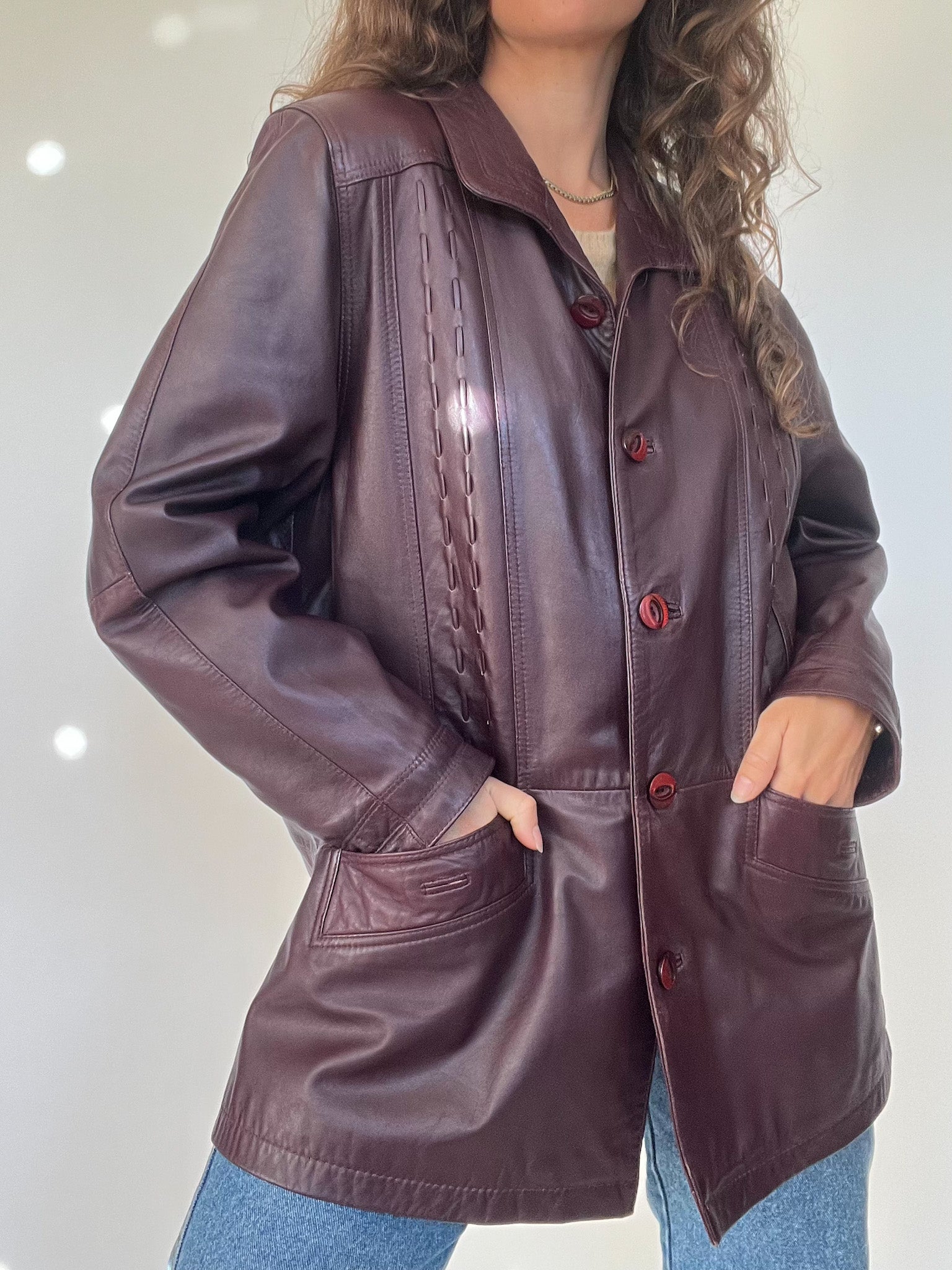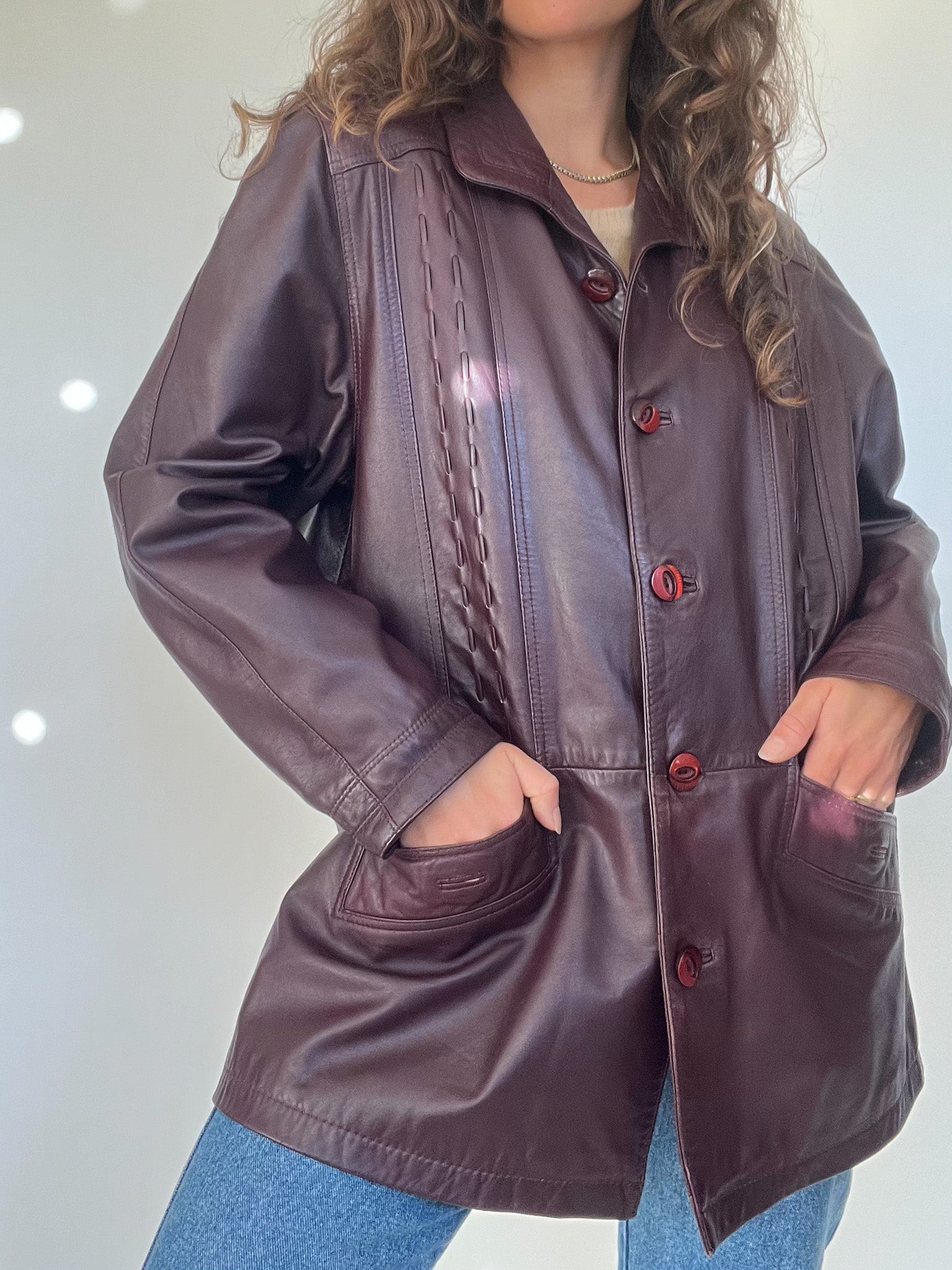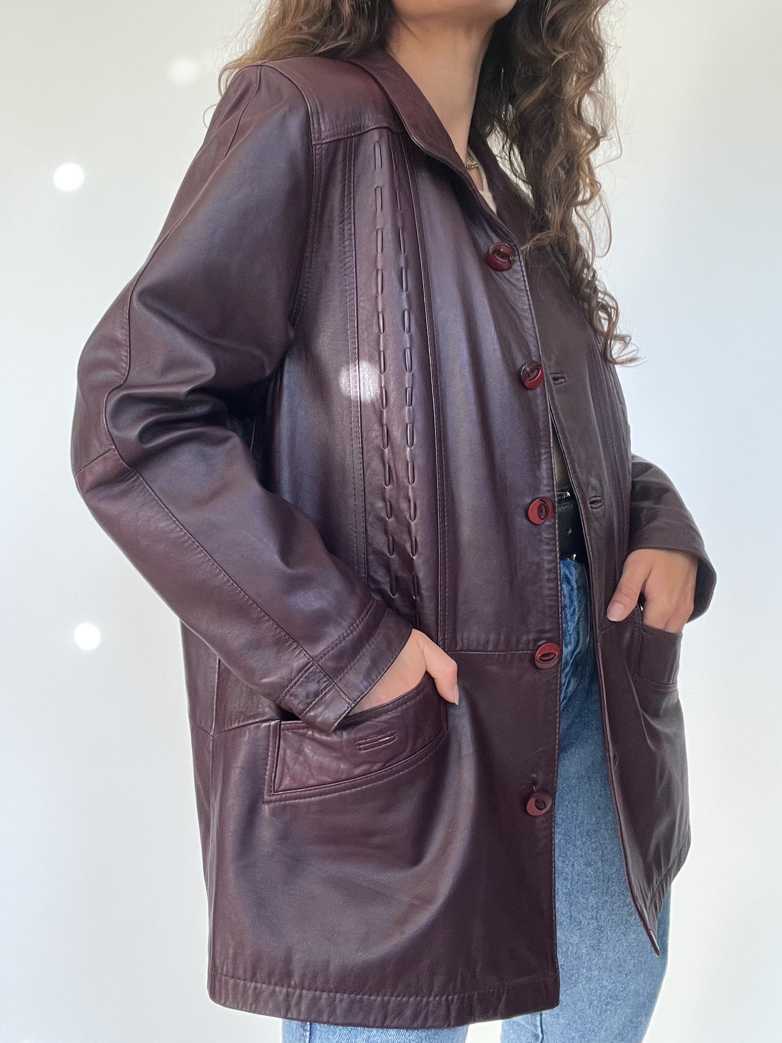 Vintage 90’s Burgundy Leather Longline Jacket with Textured Stitching