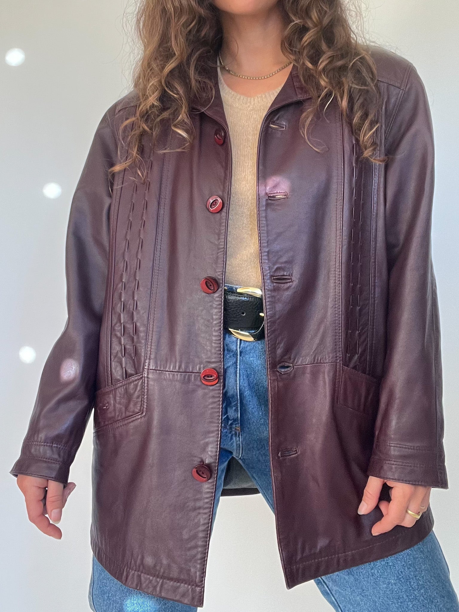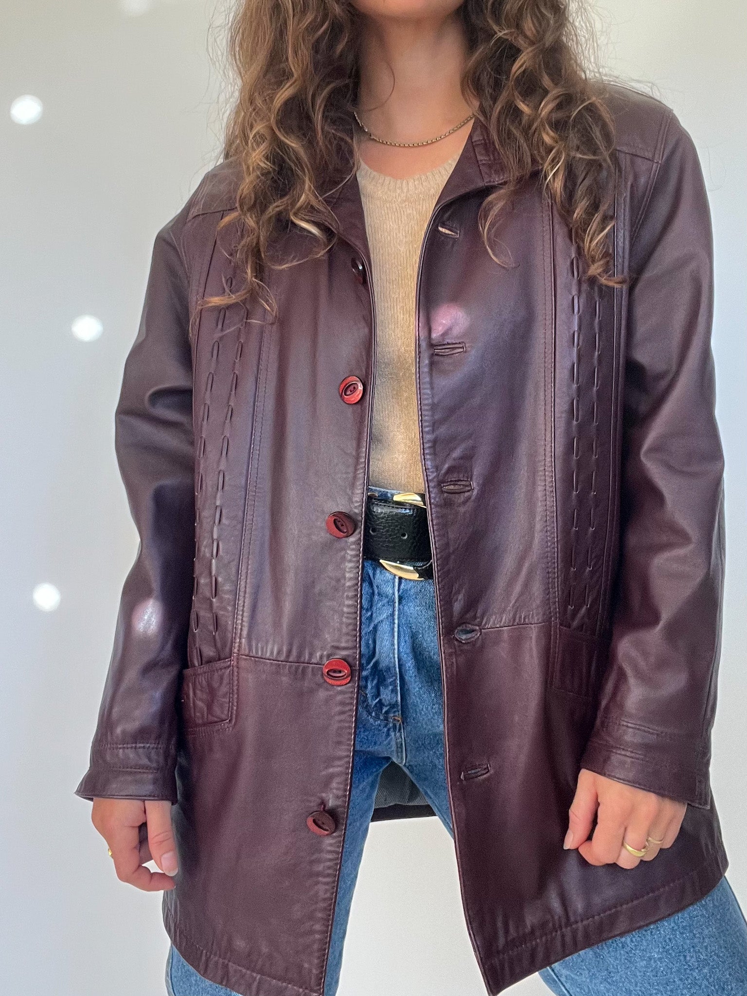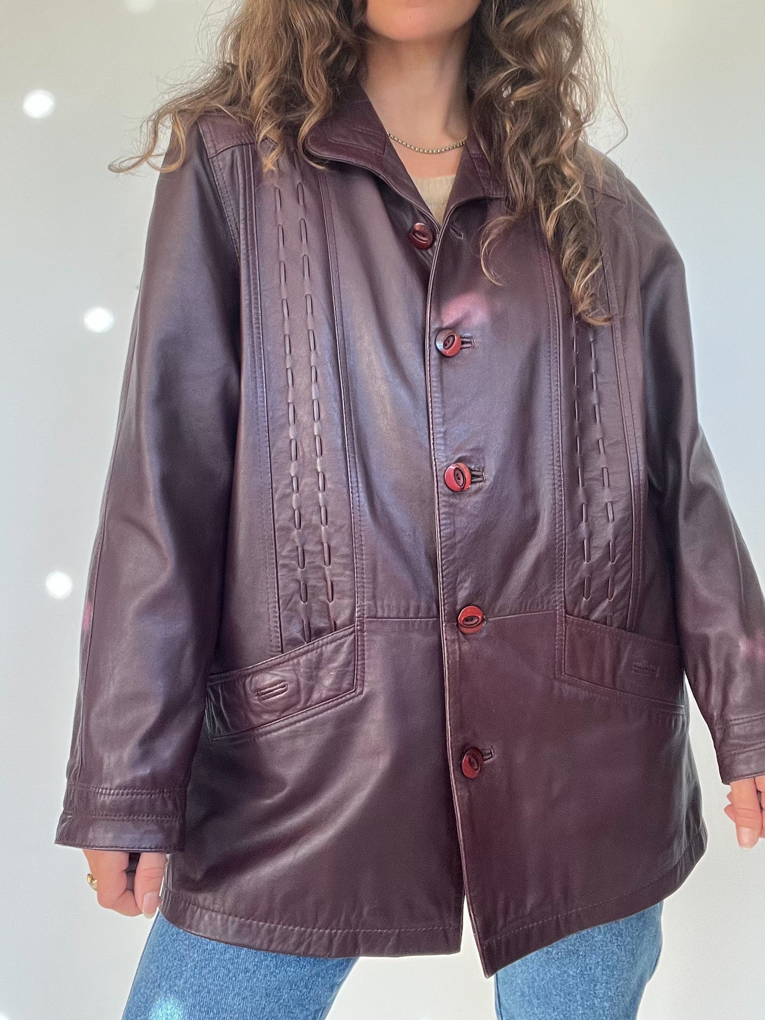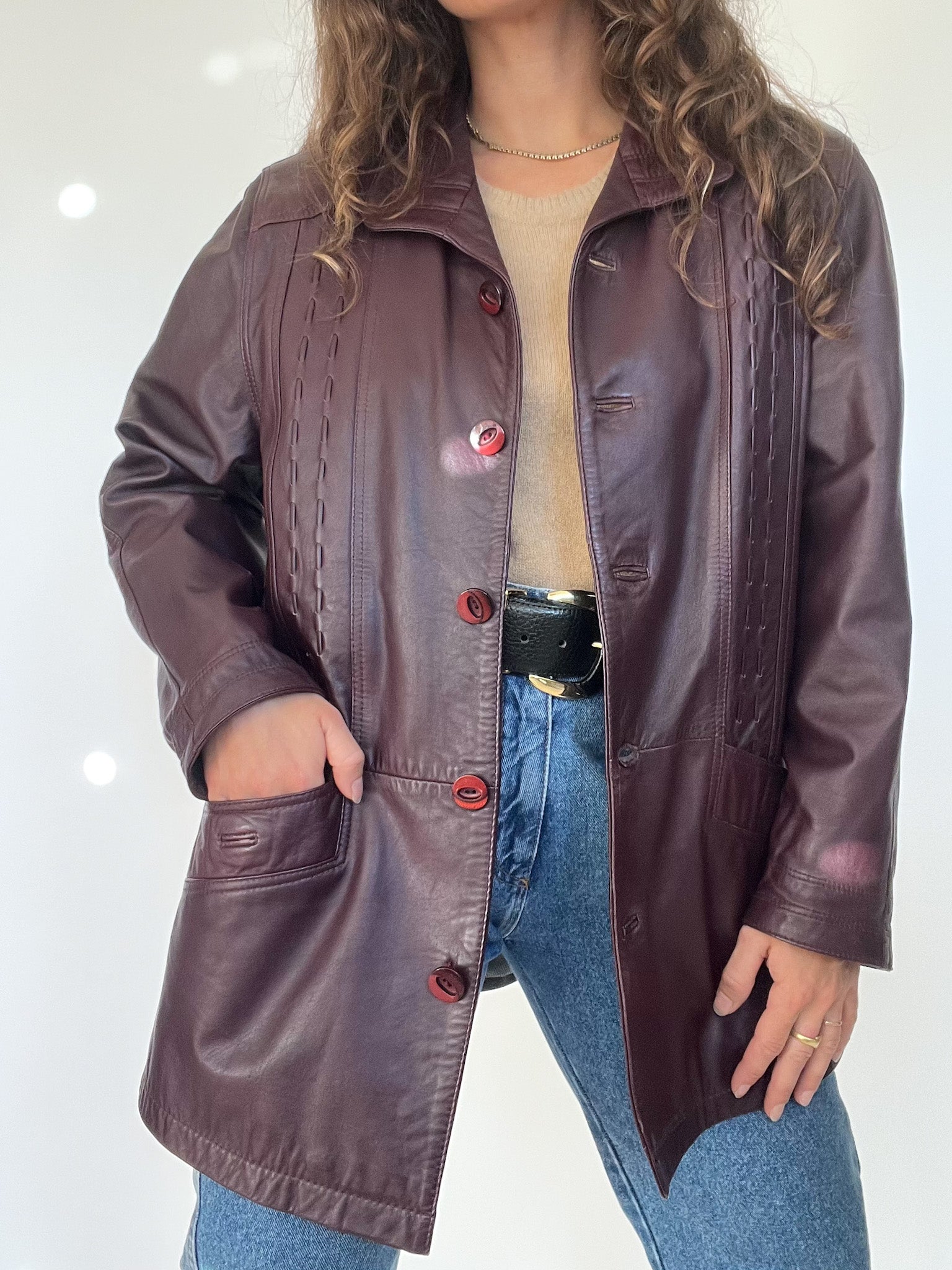 Vintage 90’s Burgundy Leather Longline Jacket with Textured Stitching