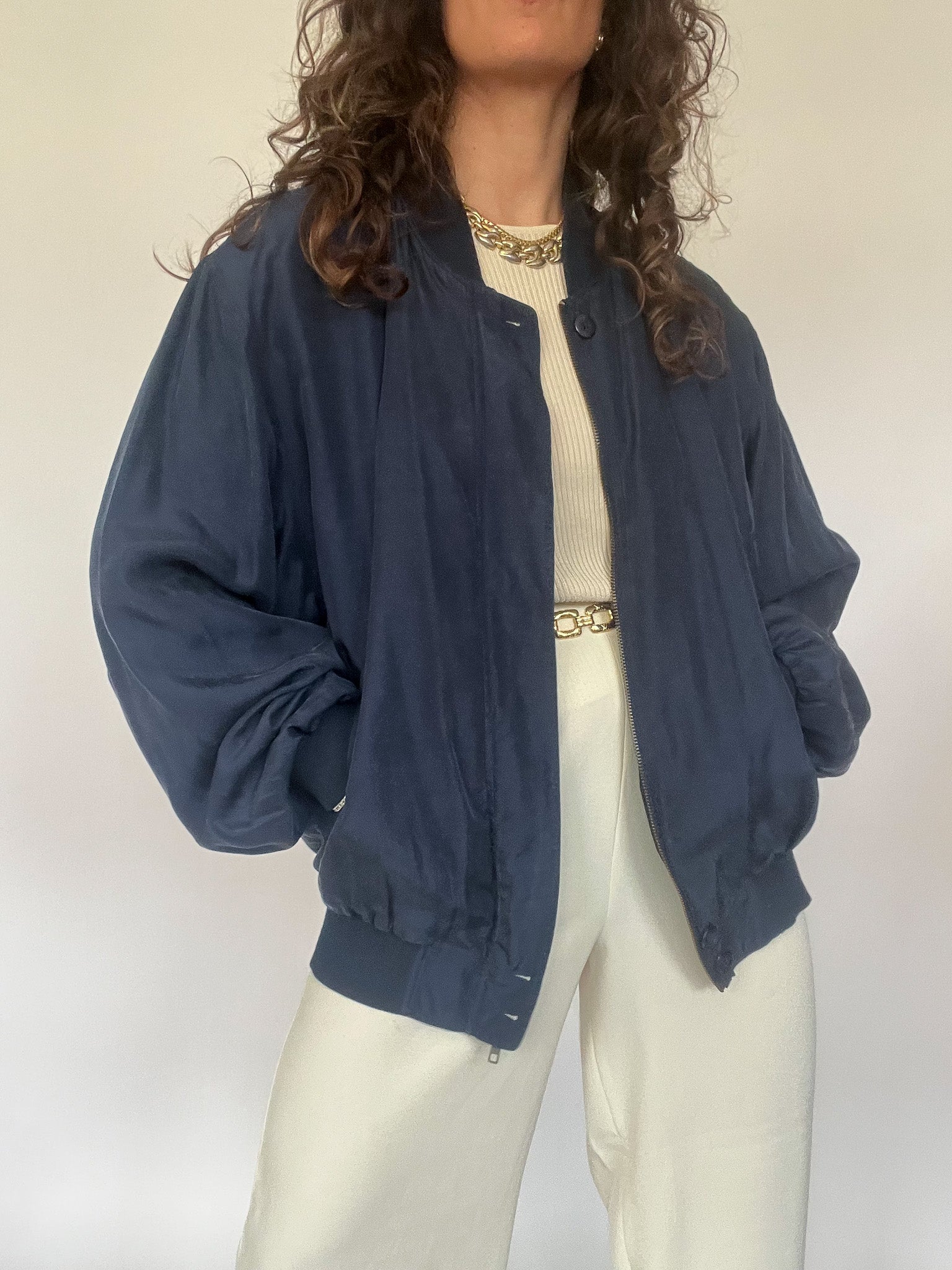 Iconic and timeless, this navy silk bomber brings effortless structure and softness in one silhouette. Its deep tone and subtle sheen make it an essential for those who dress with intention—adding character, not clutter. Vintage at its most wearable: clean lines, bold presence, and a soul that carries stories.