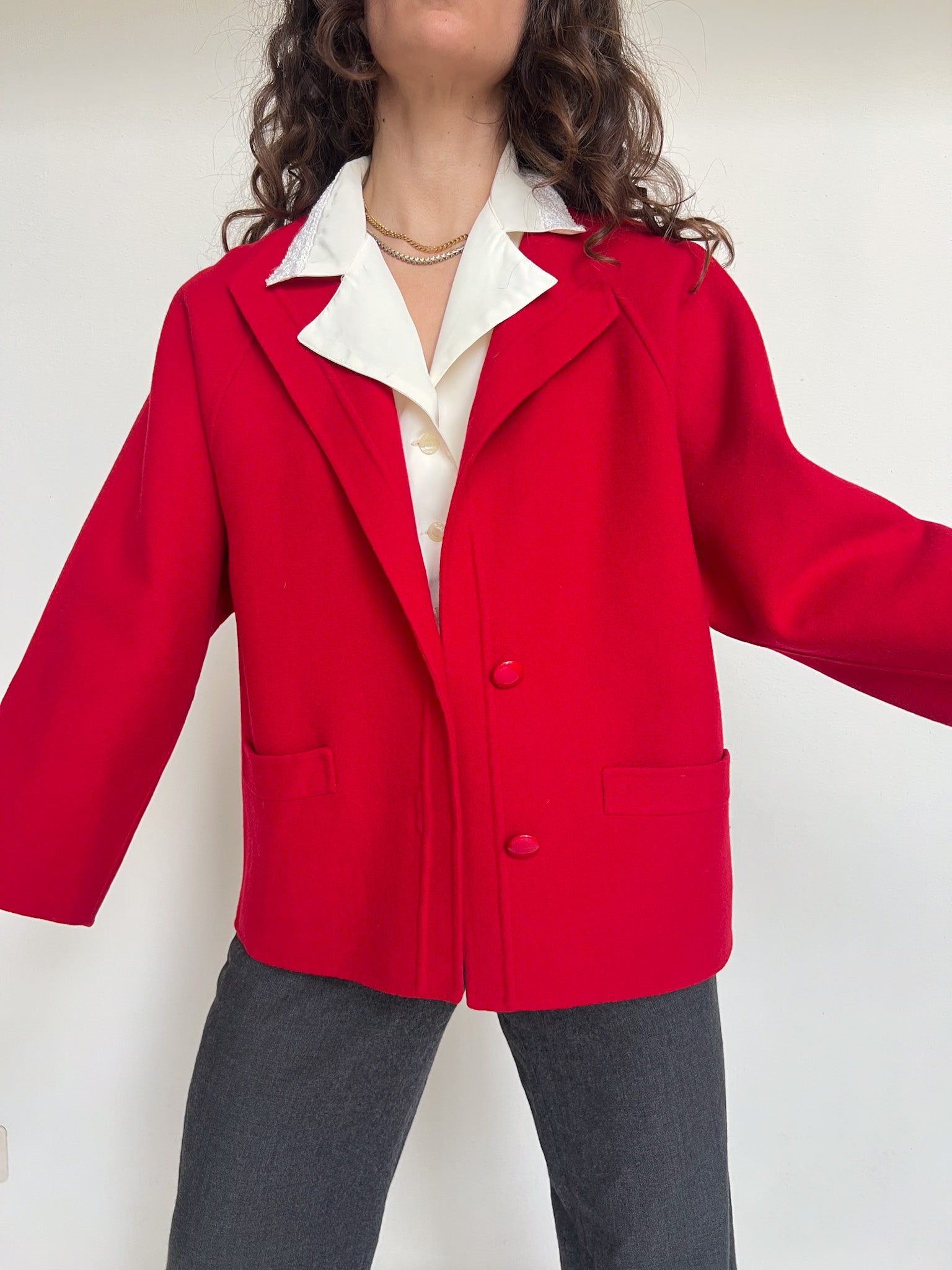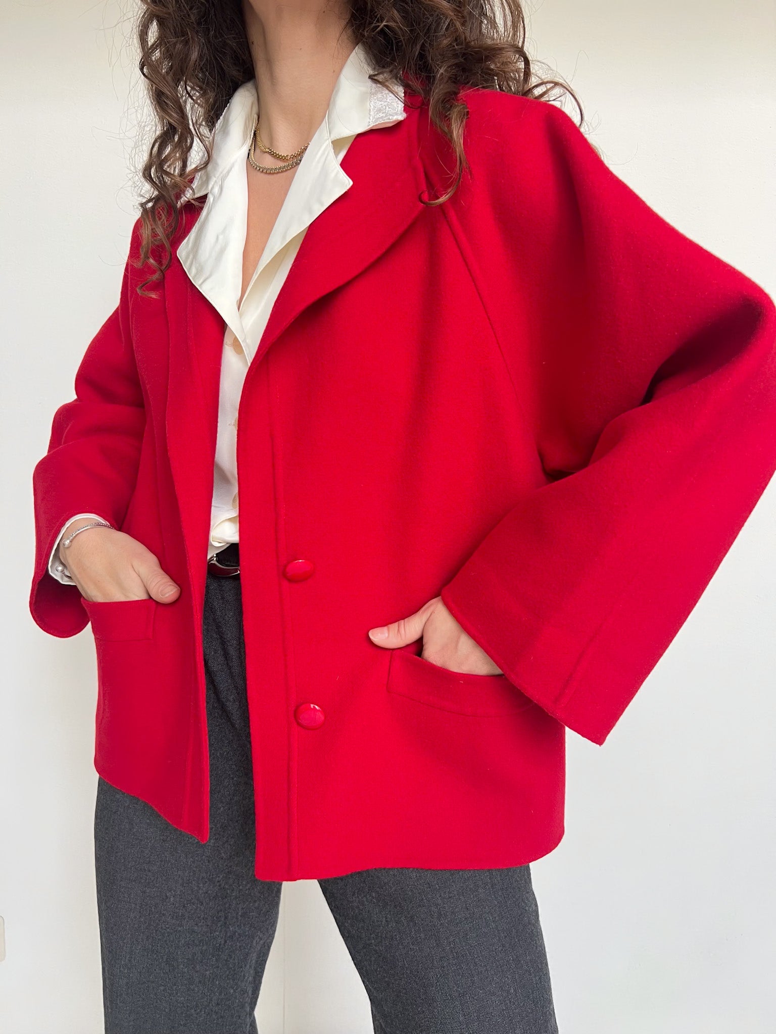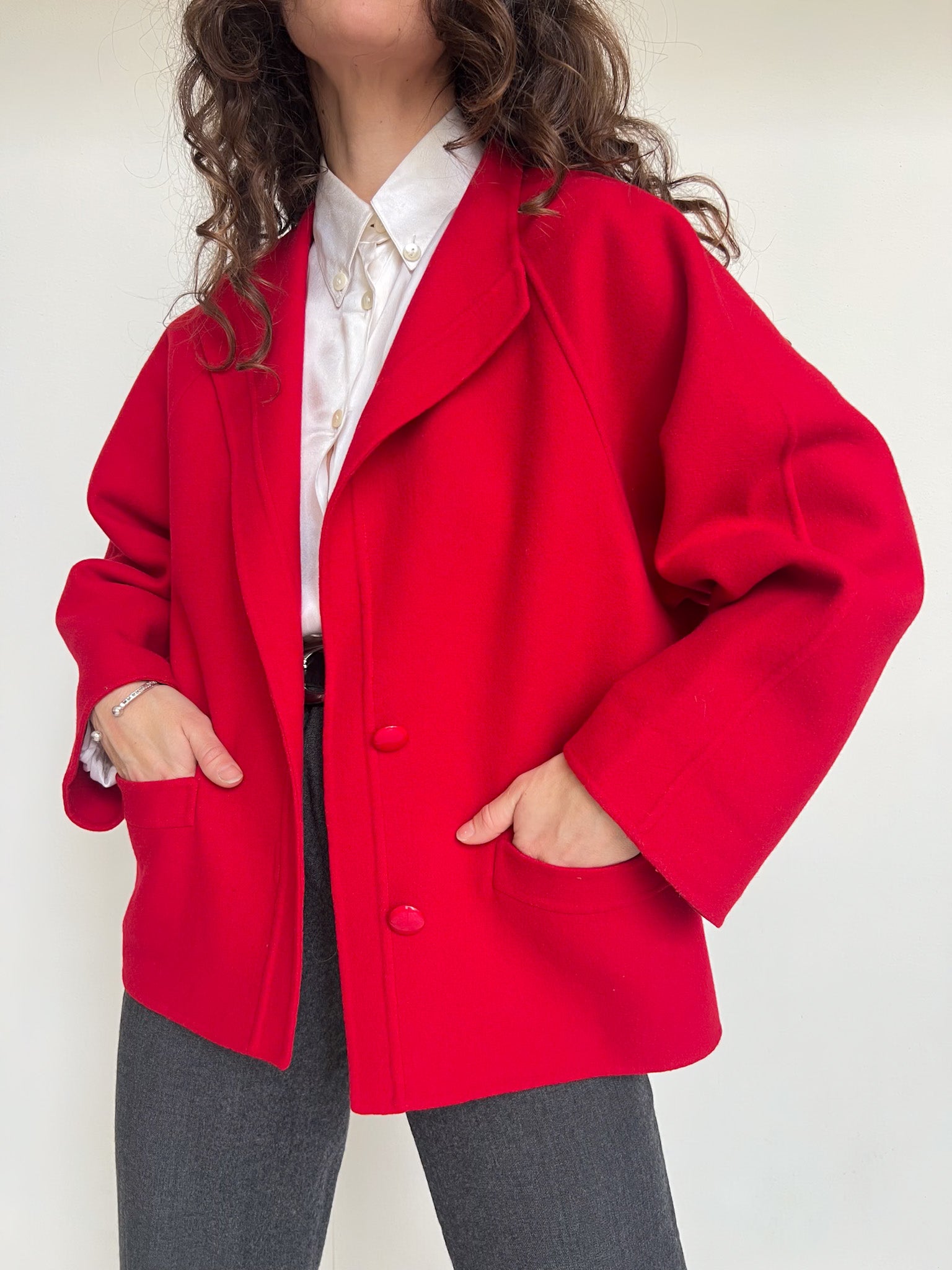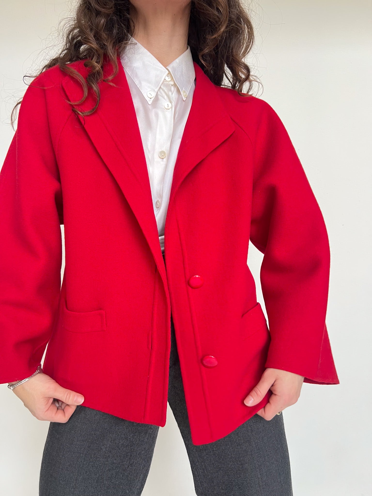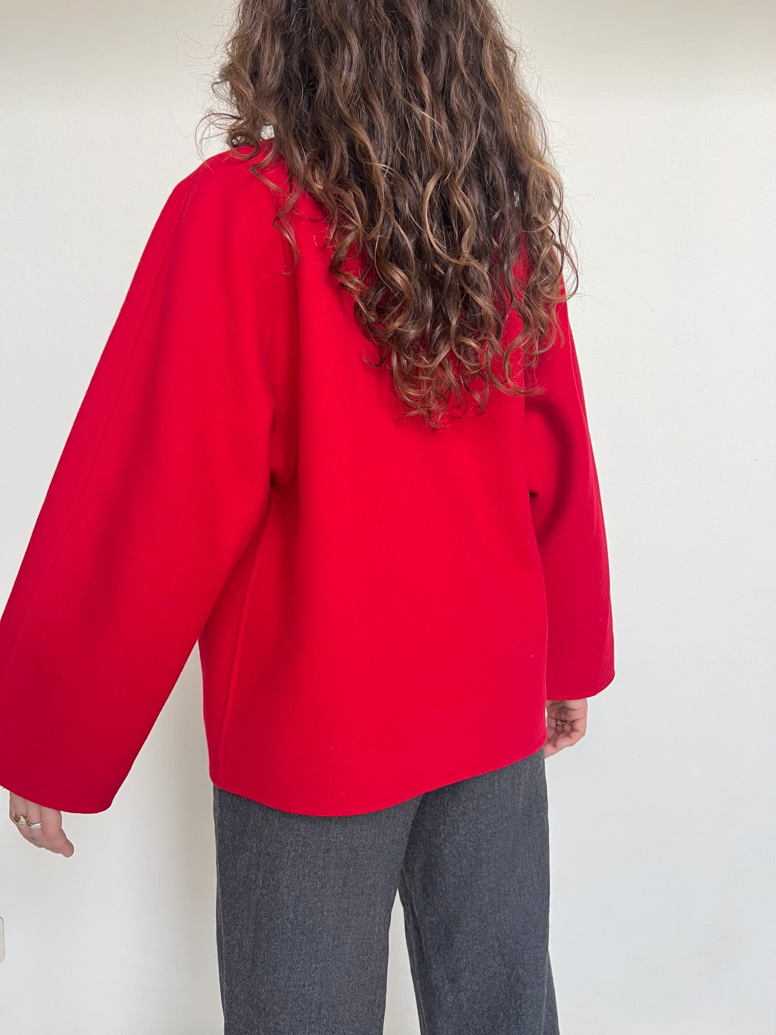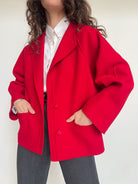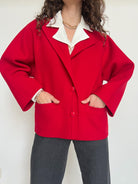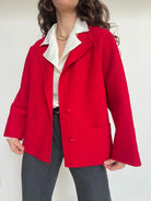 Chosen for its striking red shade and truly exceptional cut that gives this jacket an immediate presence. This is one of those iconic pieces that doesn’t need anything else to stand out, strong lines, bold color, and a silhouette that speaks for itself.