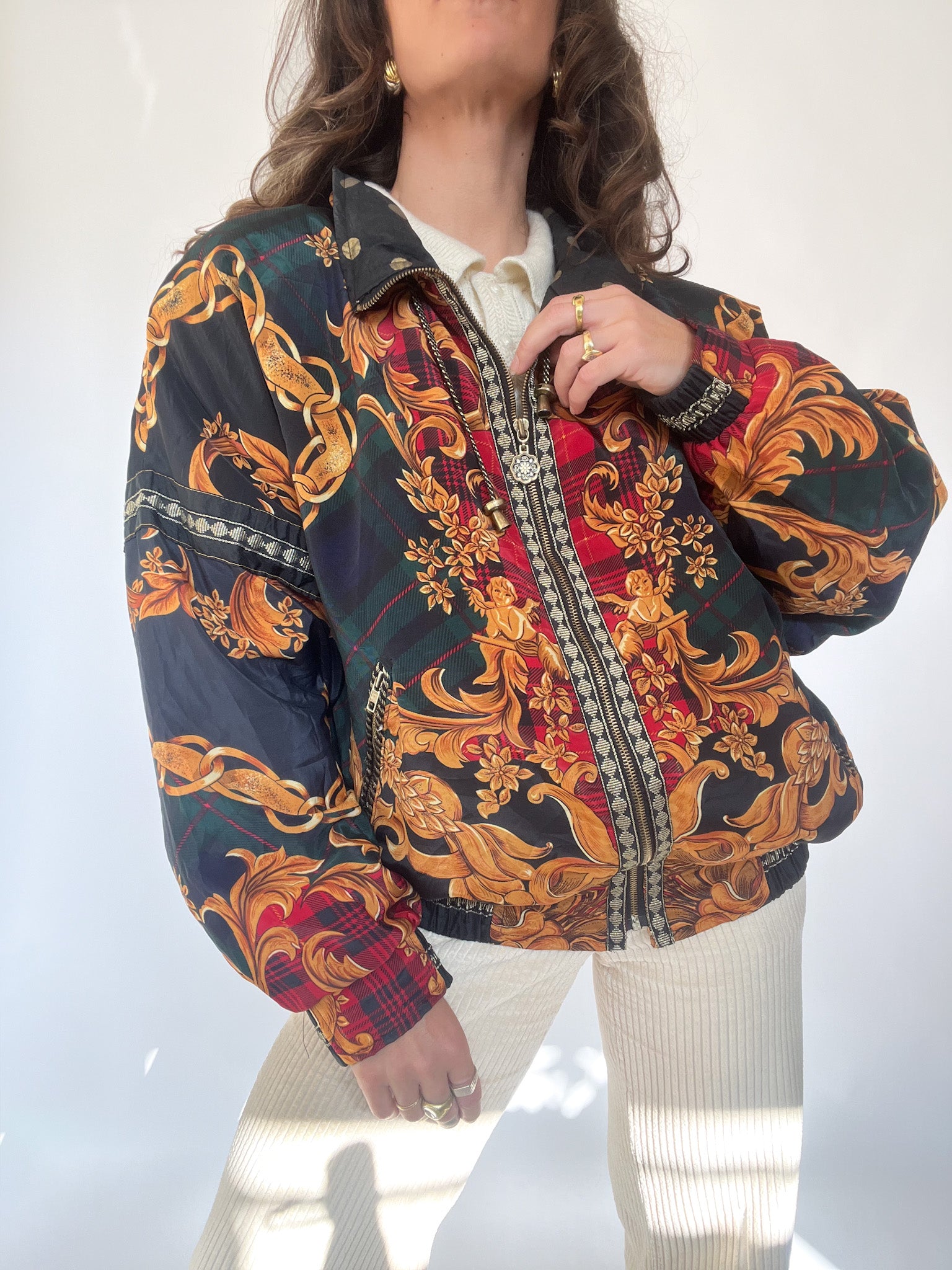This striking vintage bomber jacket features a bold baroque print in rich, vibrant hues of gold, red, and green. Its eye-catching pattern brings an artistic flair, making it a statement piece for any wardrobe. The lightweight material and relaxed fit ensure comfort, while the zip closure and elastic cuffs offer a snug, stylish finish. Perfect for adding a unique touch to casual outfits or layering on cooler days.