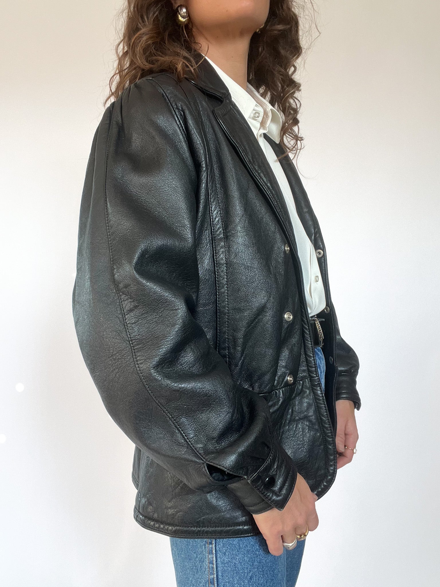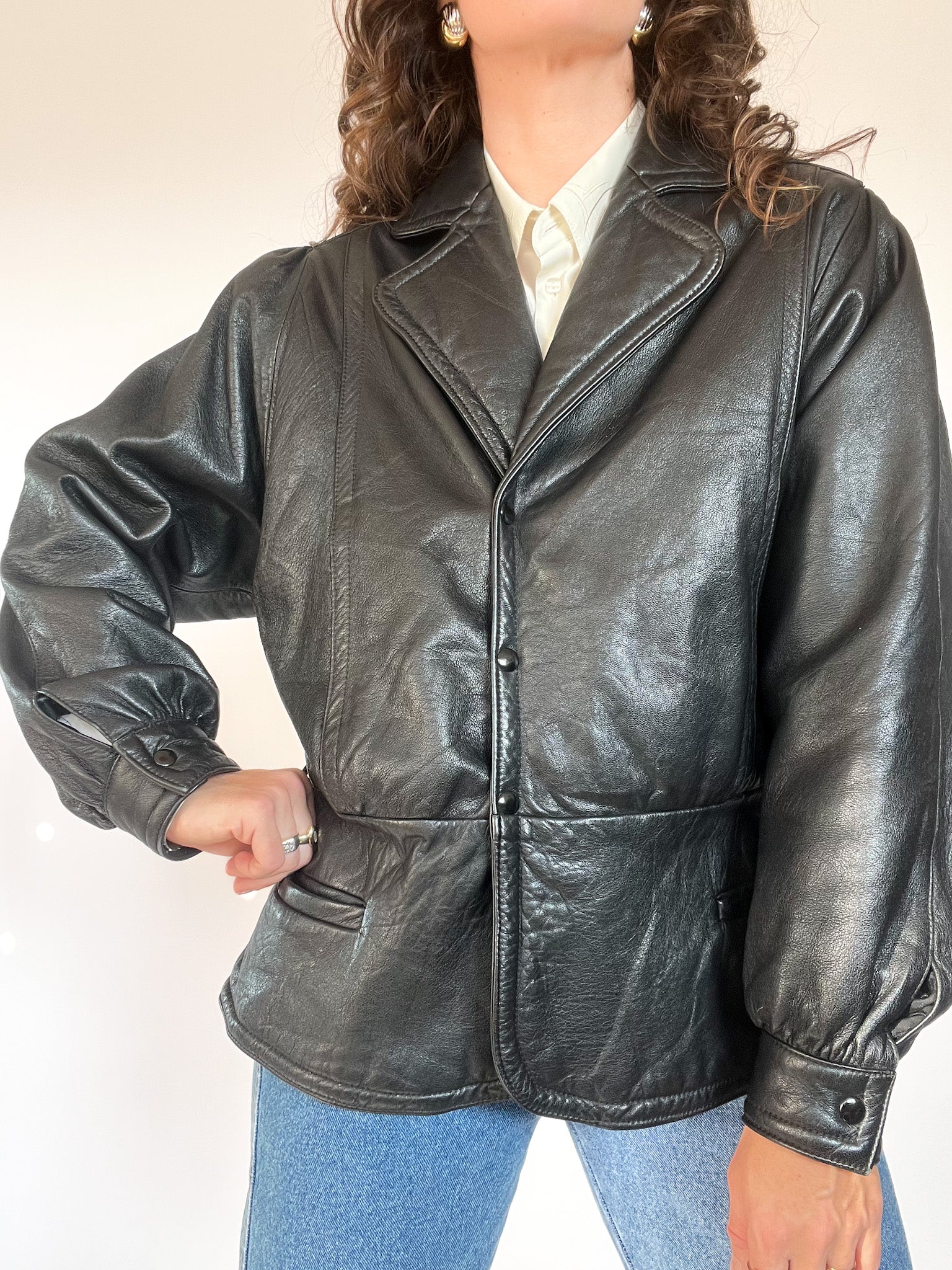 This vintage leather jacket is the perfect blend of structure and effortless sophistication. With a sharp, tailored silhouette and soft, supple leather, it offers a timeless and versatile look. The slightly puffed sleeves add a touch of character, while the front snap-button closure and large patch pockets provide both style and practicality.
