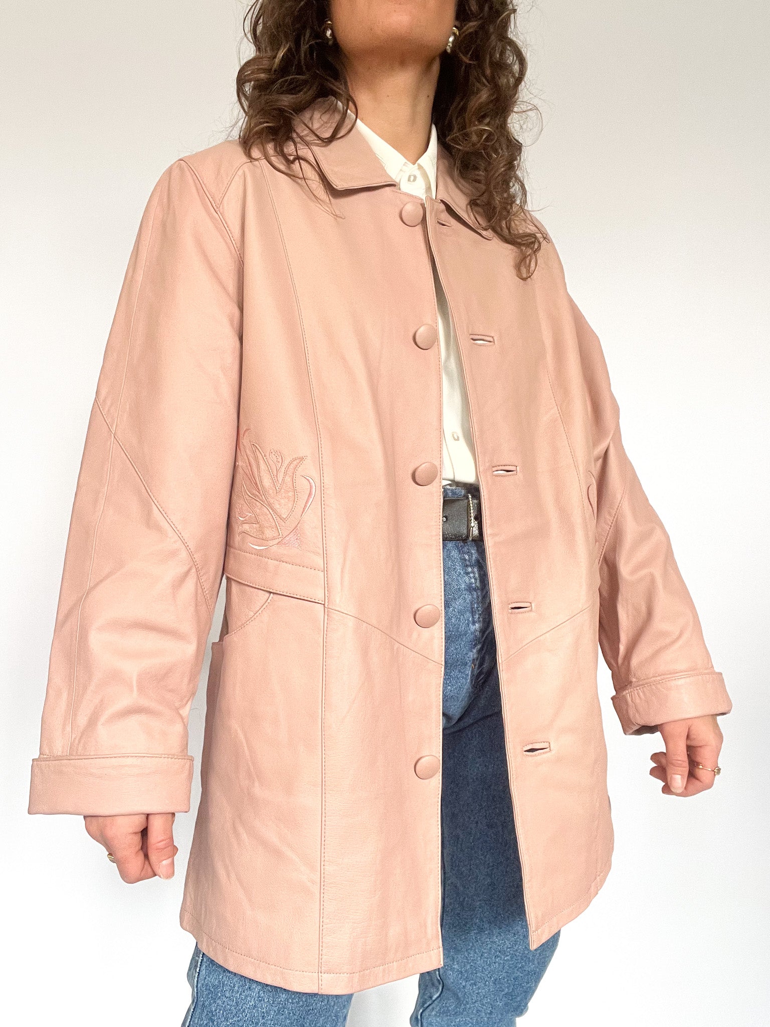 A rare vintage find in blush pink leather, featuring tonal embroidery on the back and a structured yet relaxed silhouette. The slightly oversized cut gives it a relaxed, effortless feel, perfect for layering over sharp tailoring or casual denim. With covered buttons and a unique back yoke detail, this jacket is designed for those who appreciate pieces with character—where every stitch tells a story.