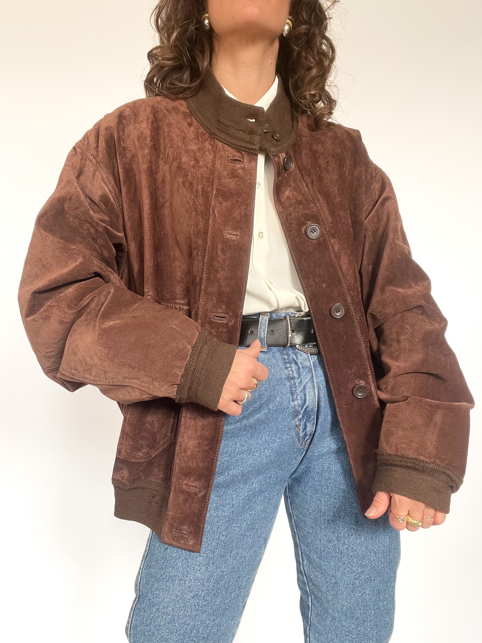 A timeless bomber jacket in deep chocolate suede, designed for a relaxed yet structured silhouette. The ribbed knit collar and cuffs add a sporty touch, while the button-up closure and oversized cut make it a versatile statement piece. Perfect for layering and elevating any look with an effortless vintage charm.