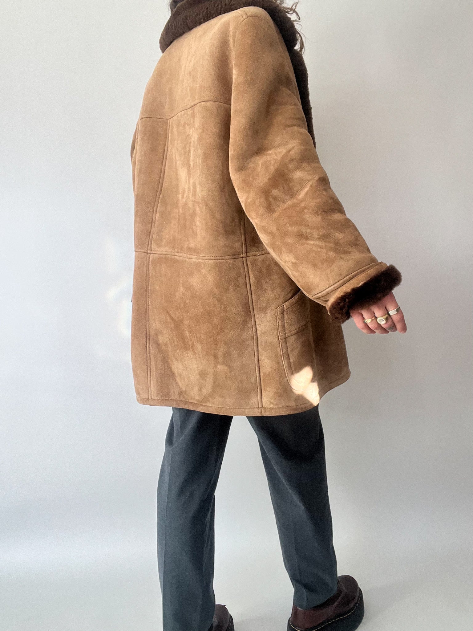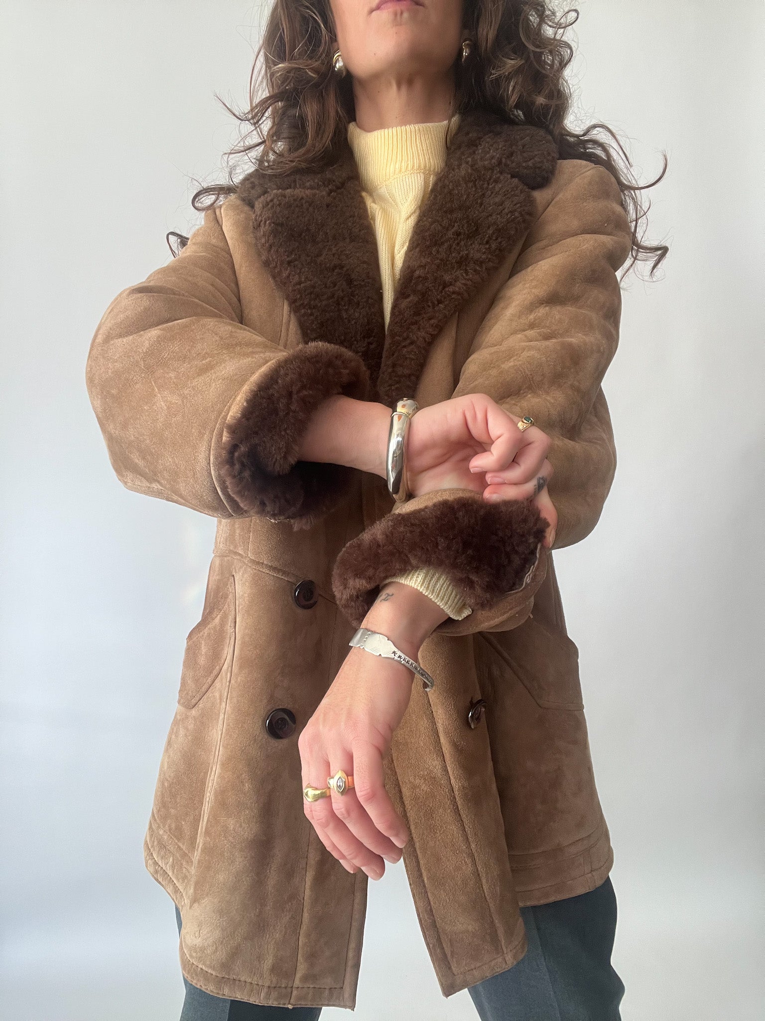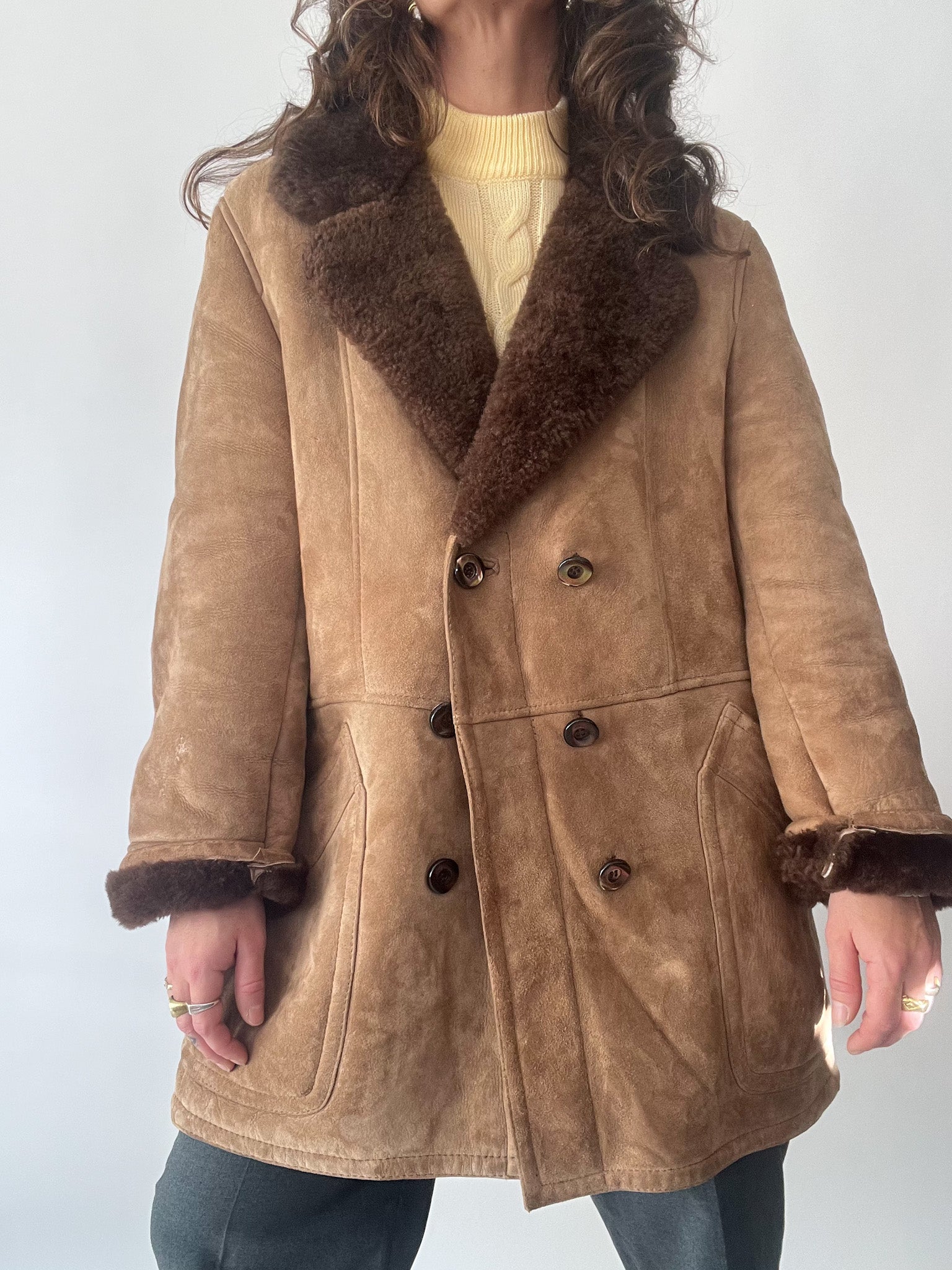 This exquisite vintage shearling jacket is a perfect balance of rugged charm and sophisticated warmth. With a rich tan suede exterior and a plush dark brown shearling lining, this piece offers both comfort and timeless style. The double-breasted design and wide lapels elevate its structured silhouette, making it a standout for winter fashion.