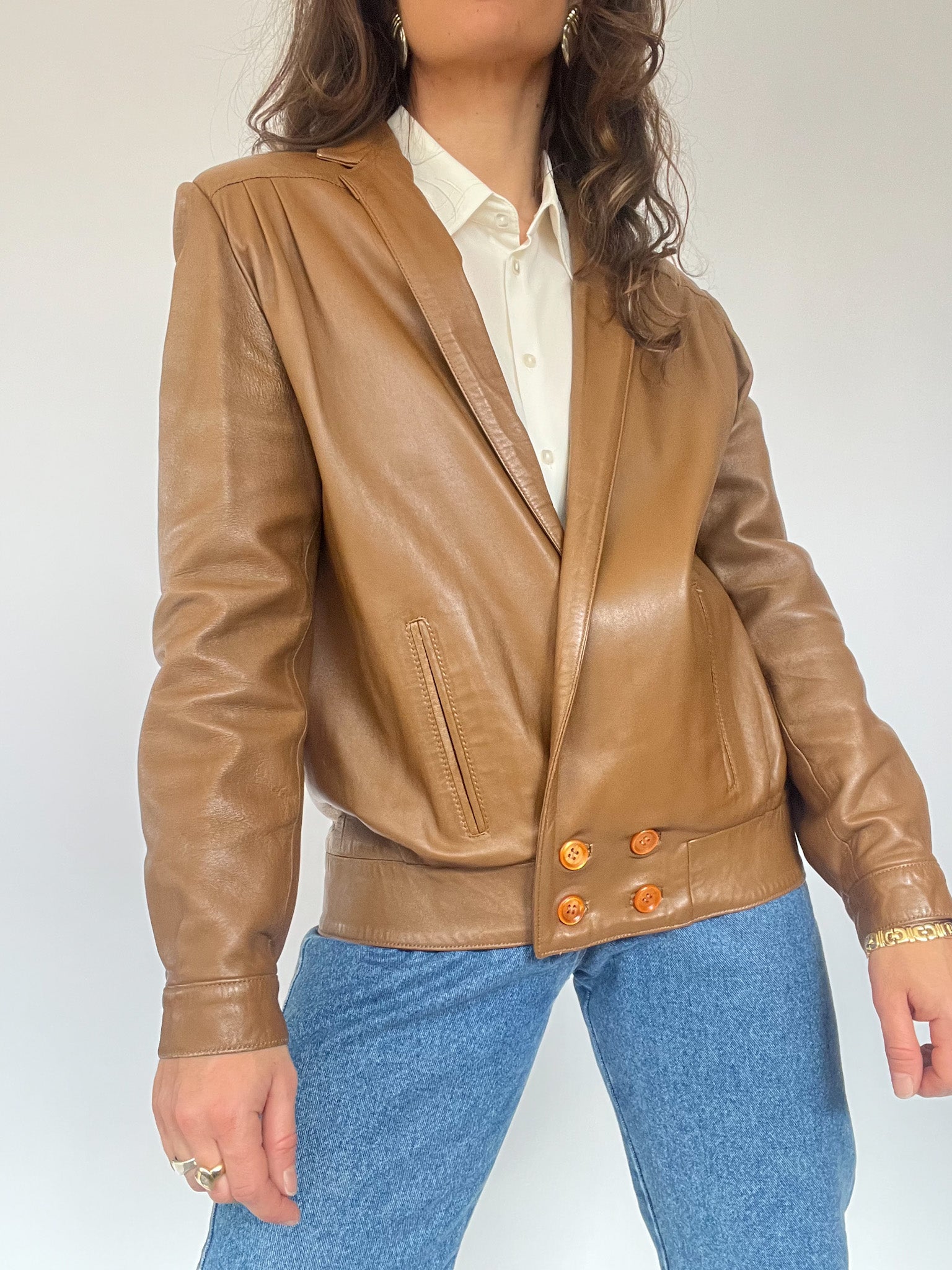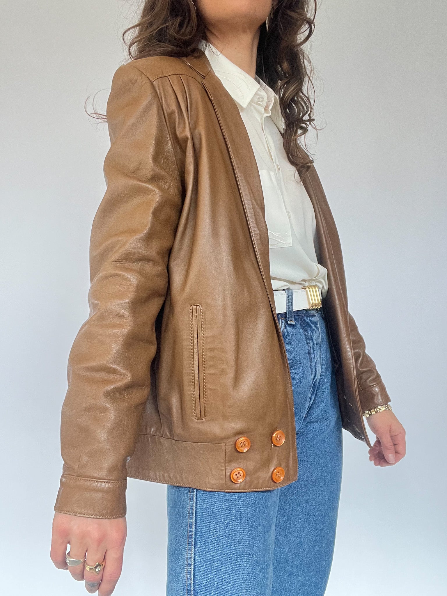A vintage leather blazer in a rich caramel shade, featuring double-breasted button closure with marbled buttons. This piece is the epitome of refined strength, bringing a bold yet sophisticated presence to any look.