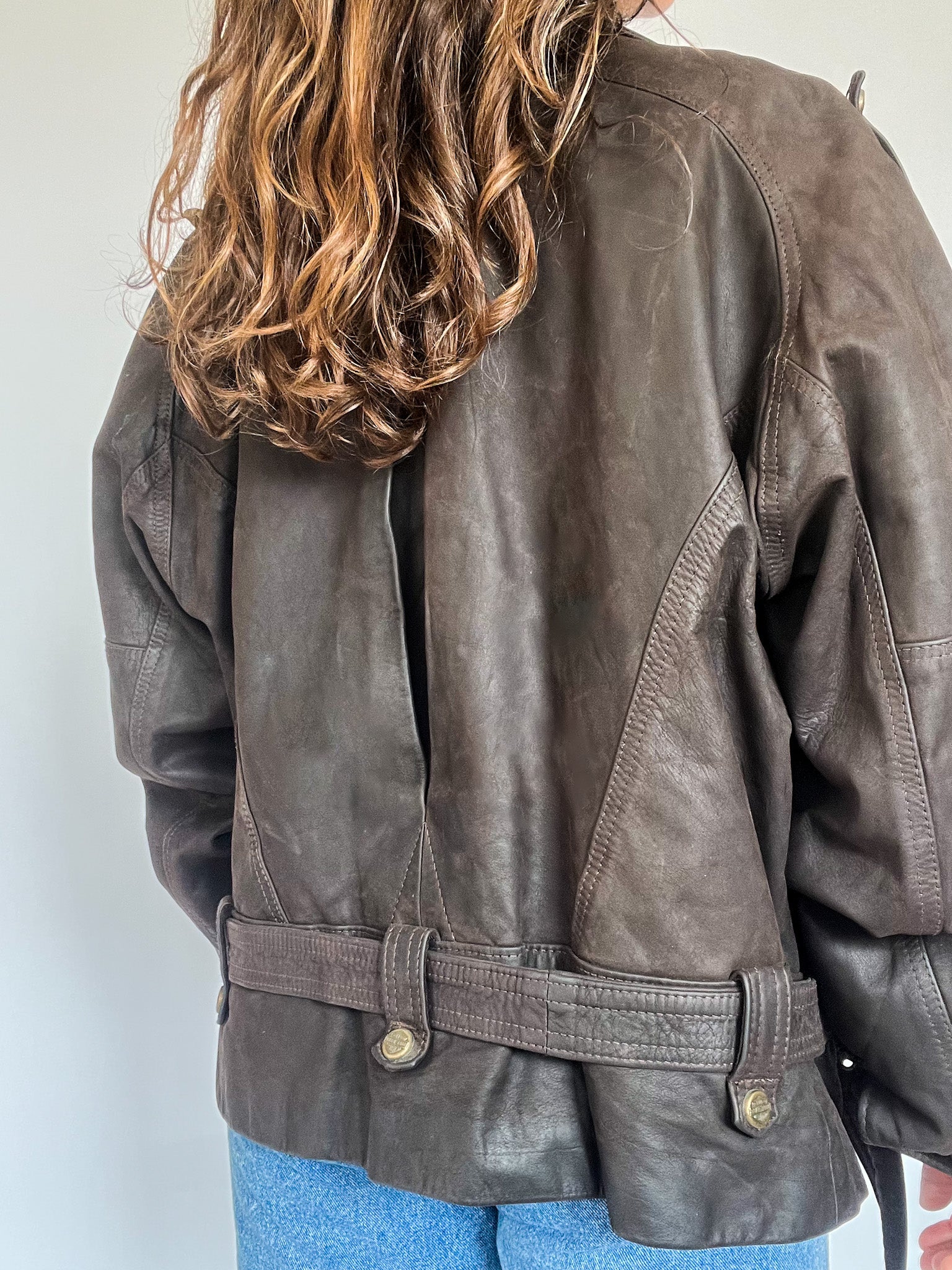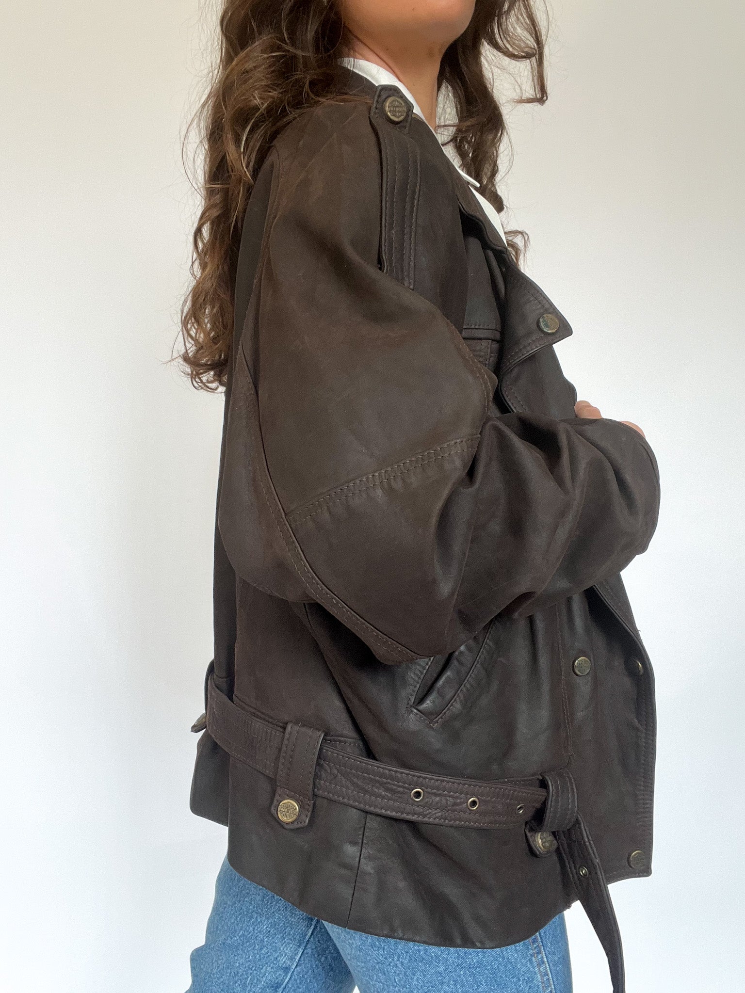 A true statement piece with attitude. This deep chocolate-toned leather jacket embodies the strength and singularity at the heart of Skorpiones Vintage. Its bold silhouette, belted waist and military-inspired details bring a sense of structure and power, without compromising on comfort. The aged leather gives it a worn-in softness while keeping its character intact—this is the kind of jacket you’ll wear on repeat, year after year.