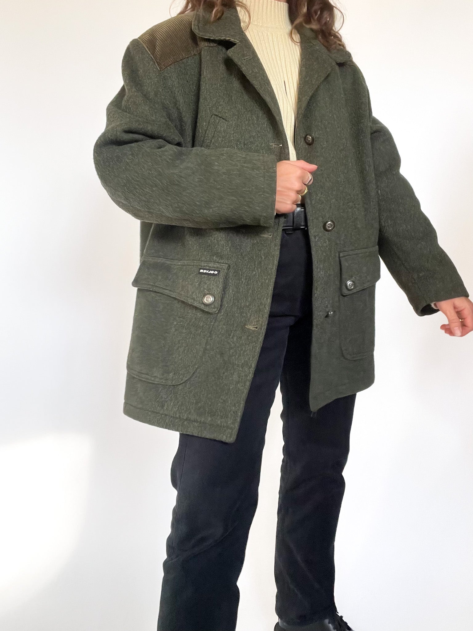 This vintage khaki wool jacket made in Italy blends rugged charm with refined style. Accented with corduroy shoulder patches, it exudes a classic, outdoorsy vibe while maintaining sophistication. Perfect for layering over knits or tees, this jacket offers a cozy feel and effortless style, ideal for both city strolls and countryside adventures.