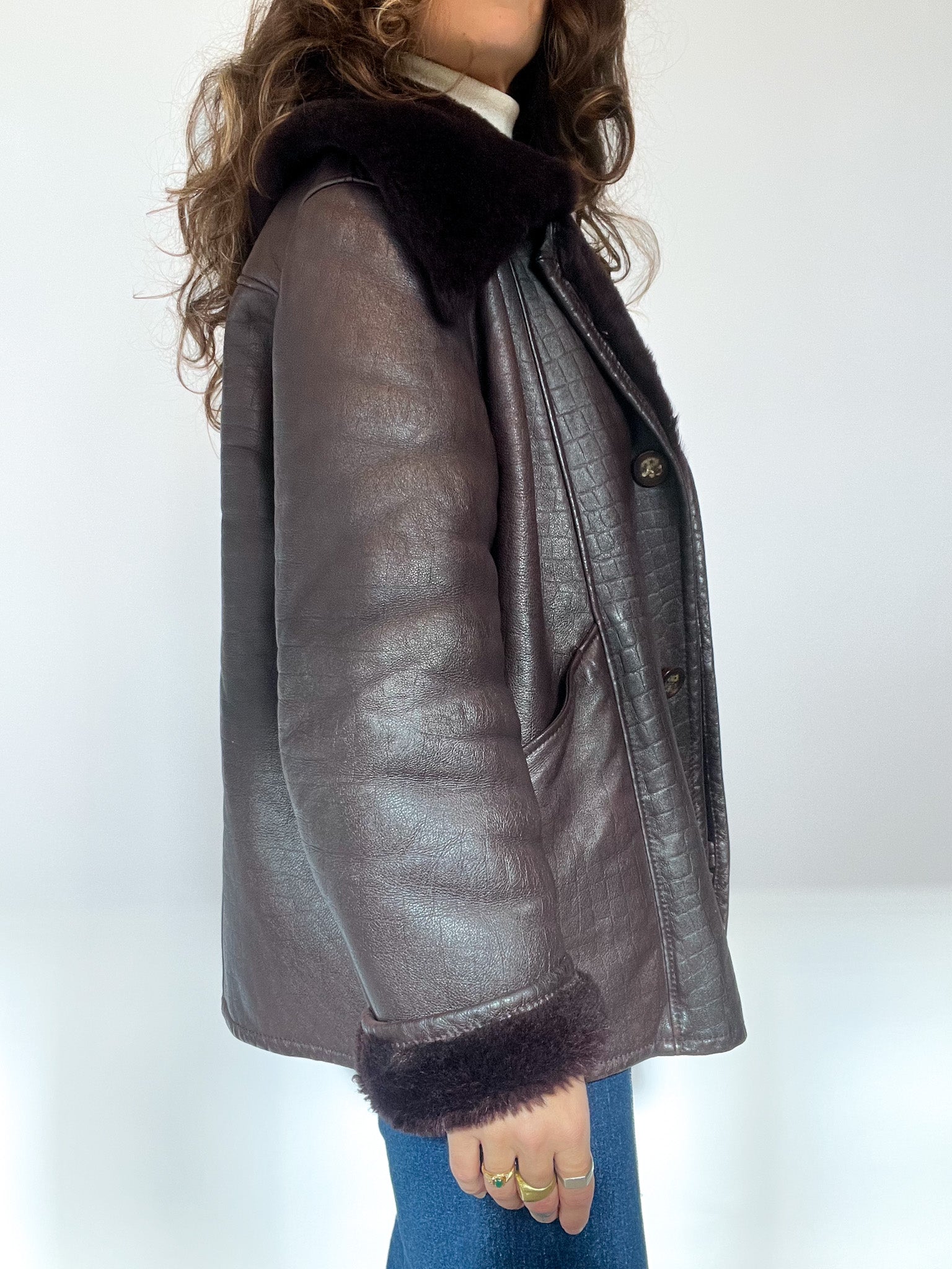 This luxurious vintage jacket boasts a rich chocolate brown leather finish with an embossed crocodile pattern, adding an elevated touch to its timeless design. The plush faux fur collar and cuffs in deep brown create a cozy, statement-worthy contrast, making it perfect for colder seasons. Its relaxed silhouette ensures comfort without compromising on style, featuring button closures for a classic finish.