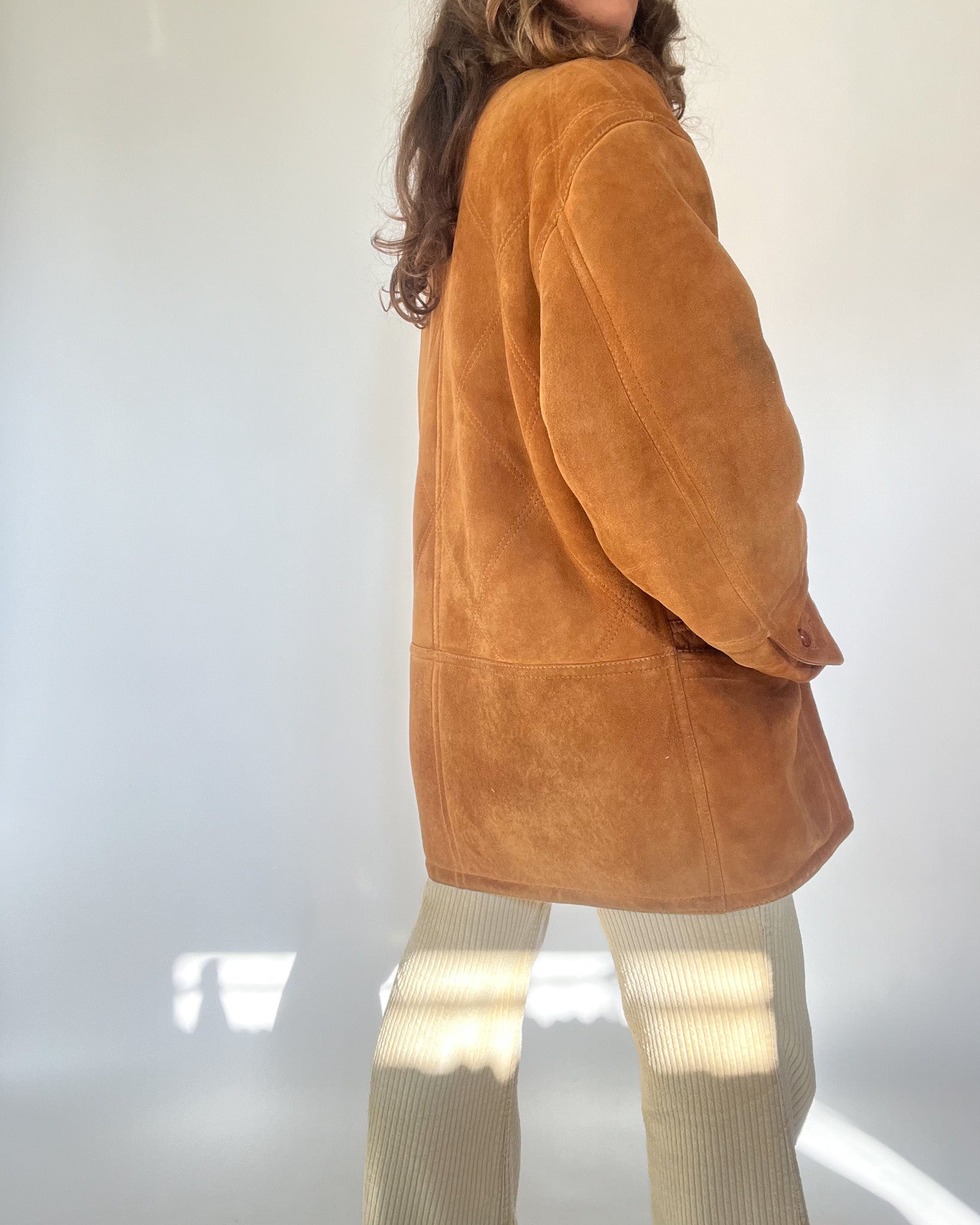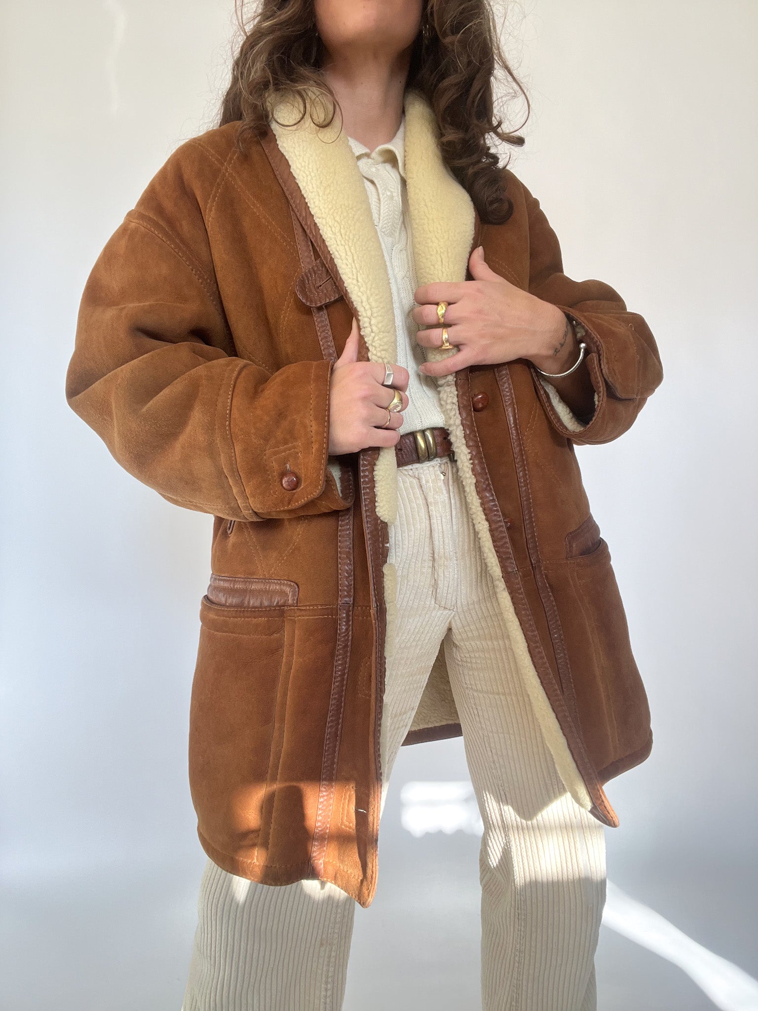 Stay warm and stylish in this vintage brown suede coat, featuring a luxurious shearling lining. The oversized silhouette and deep pockets add both comfort and functionality, while the leather trim details provide a refined touch. This classic piece combines warmth with timeless style, making it an ideal choice for chilly days. The button closure and cozy inner lining ensure you’re well-protected from the cold, without compromising on style.