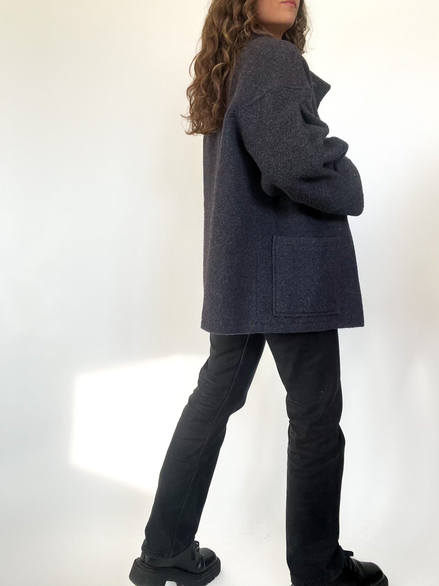 Embrace cozy sophistication with this vintage wool jacket, perfect for chilly days. Designed in a versatile dark charcoal shade, this piece adds an effortlessly chic touch to your wardrobe. The minimalist silhouette and oversized pockets create a practical yet stylish look that pairs seamlessly with any outfit.
