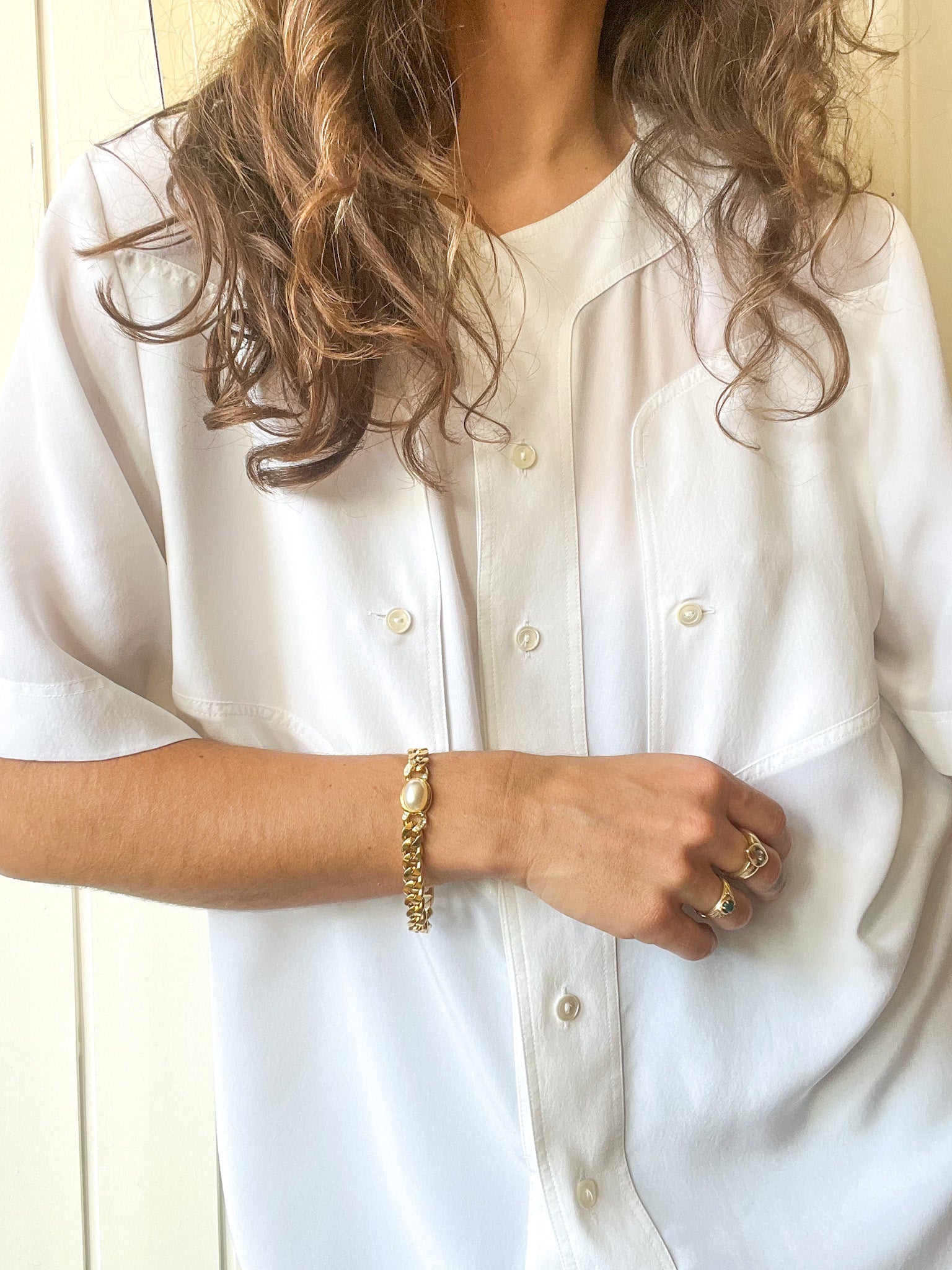 Bold yet refined, this vintage bracelet from the 1980s makes a striking statement with its thick gold-tone chain and central faux pearl cabochon, flanked by delicate crystal accents. With its sculptural silhouette and luxurious finish, it captures the essence of vintage glamour in a single gesture. Wear it solo or stack it to bring a radiant highlight to your wrist.