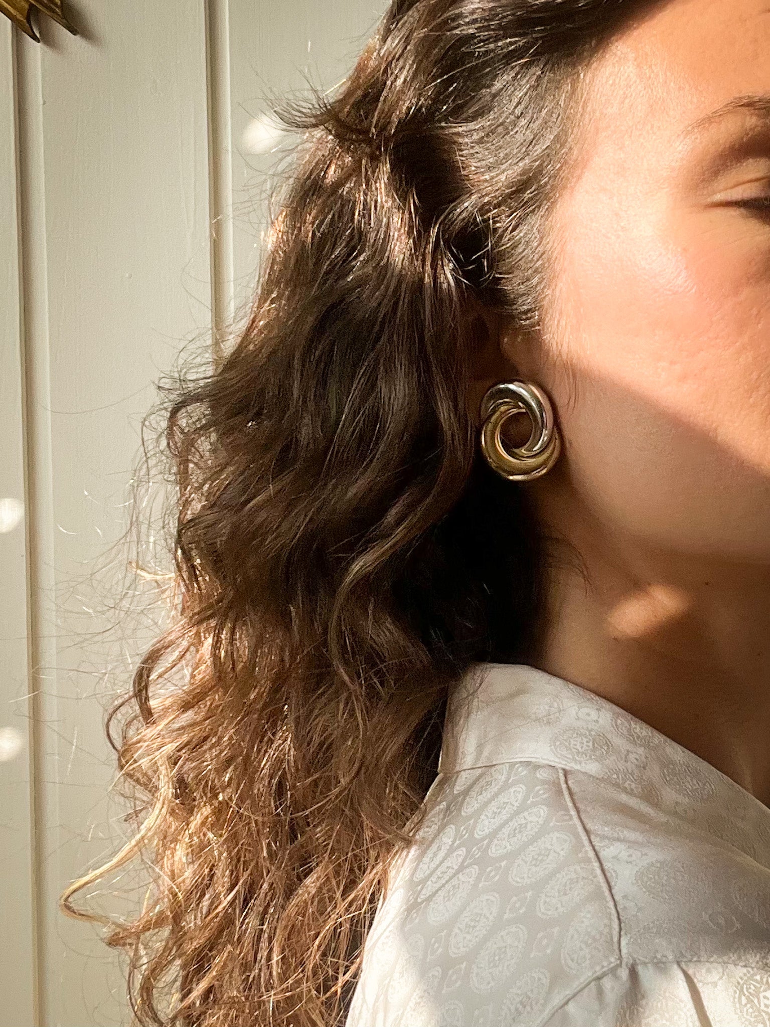 These vintage clip-on earrings feature an elegant interlocking loop design in gold and silver tones, creating a sculptural and timeless look. Their fluid shape adds a sophisticated touch to any outfit. While some black spots are visible up close due to color fading, they remain subtle when worn, maintaining their refined appearance.