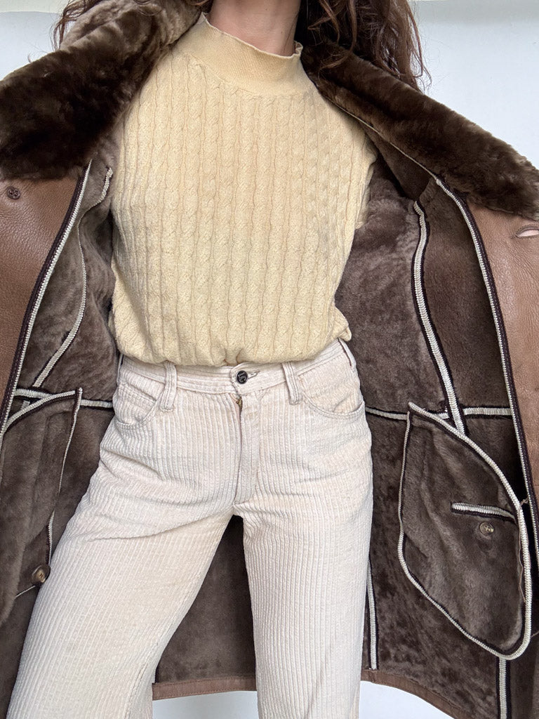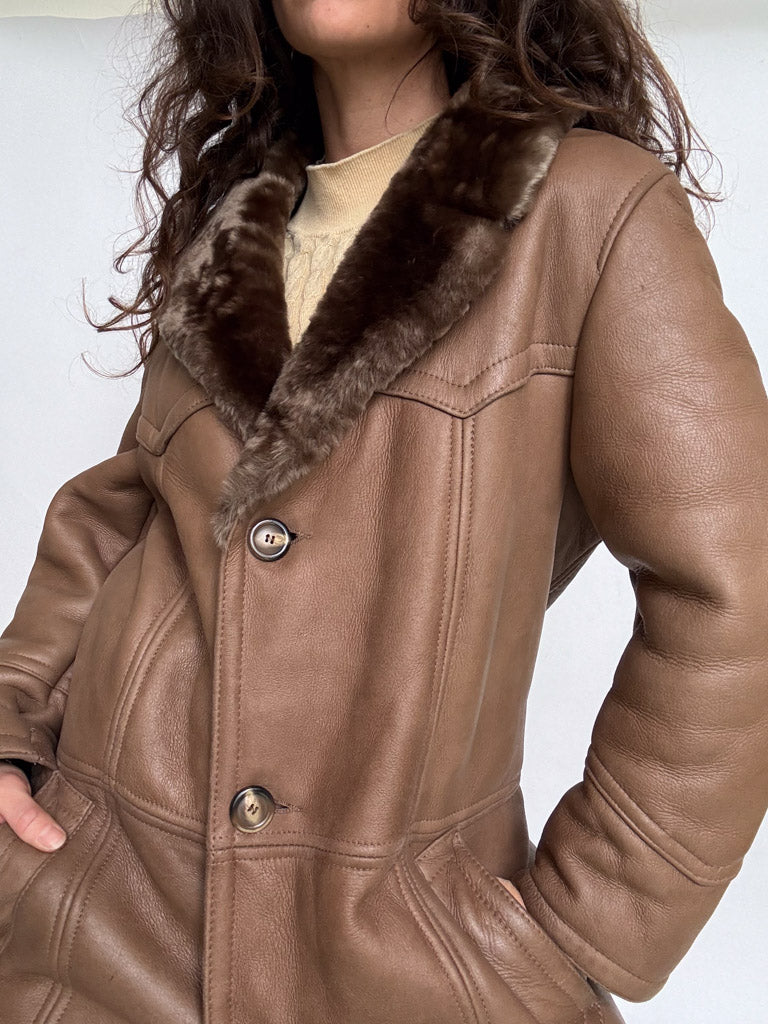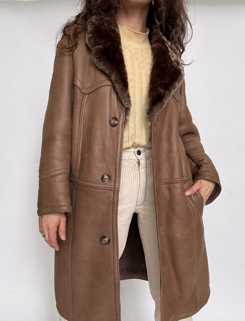Chosen for its iconic 70’s silhouette and its beautifully aged brown tone, this long shearling coat is the definition of effortless vintage elegance. The slightly looser cut gives it a strong yet relaxed presence, while the soft fur collar adds depth and warmth to the look. It is one of those rare pieces that instantly brings both class and comfort, wrapping the body in structure and softness at the same time. A truly magnificent coat with undeniable character.