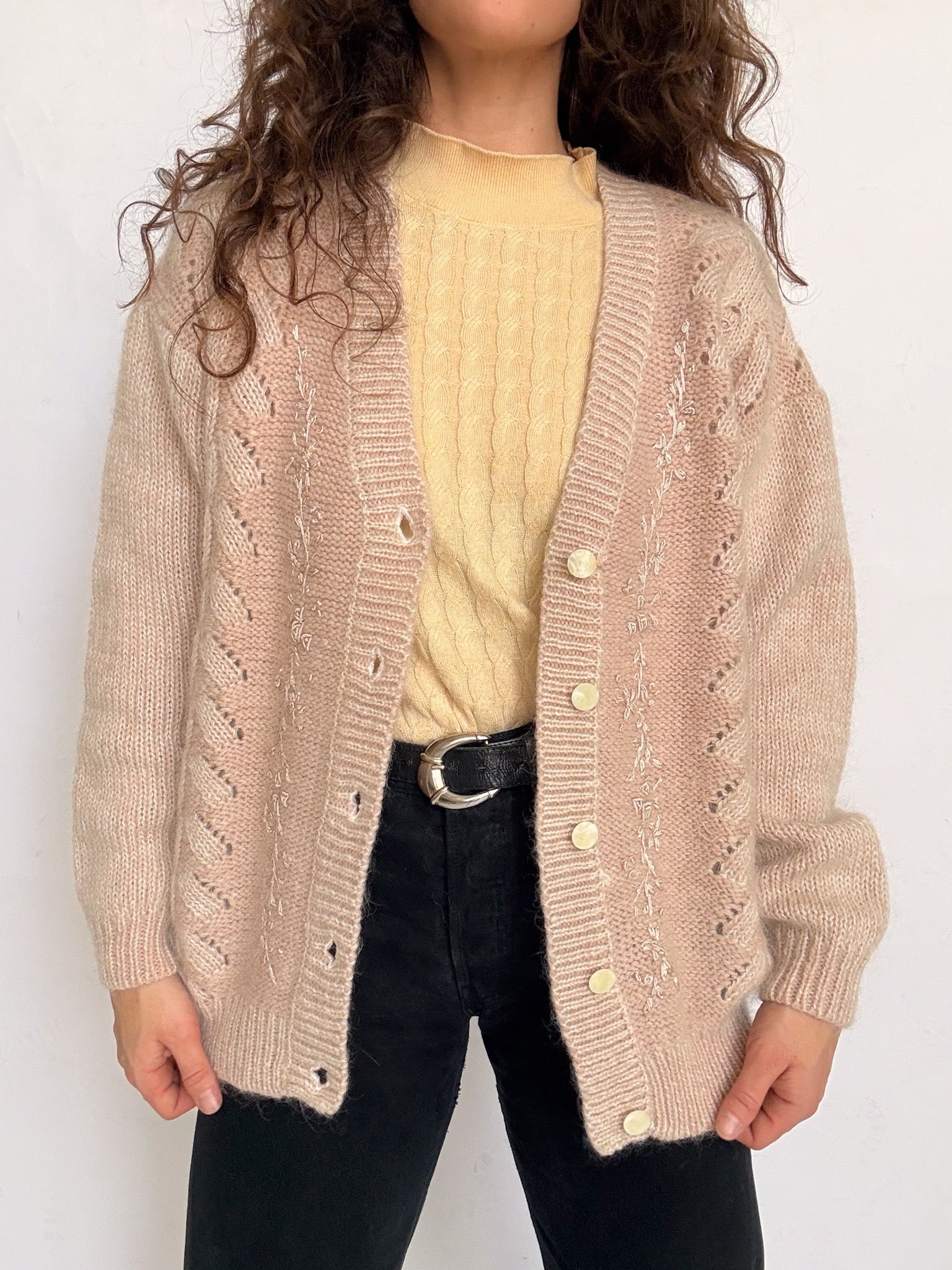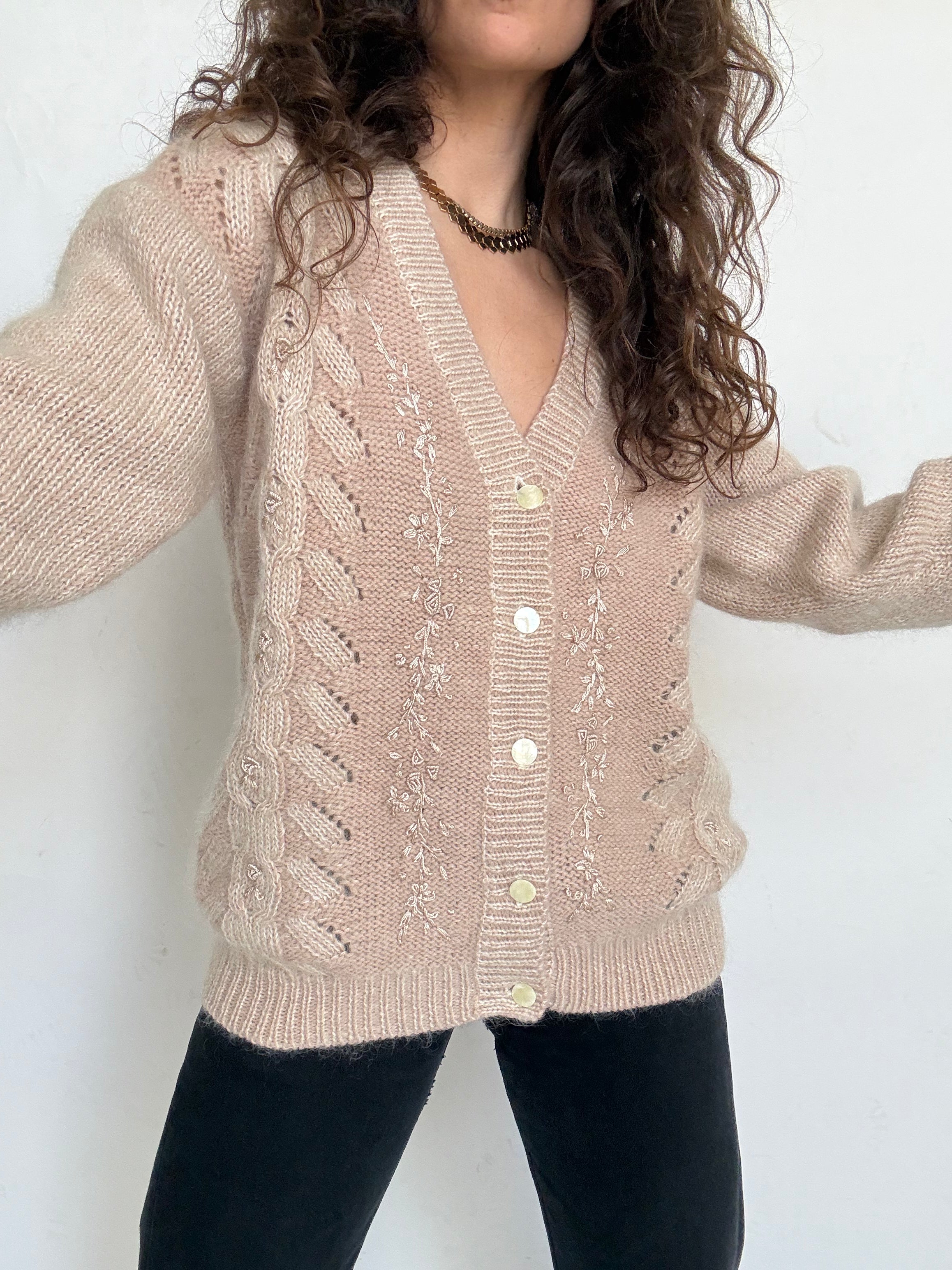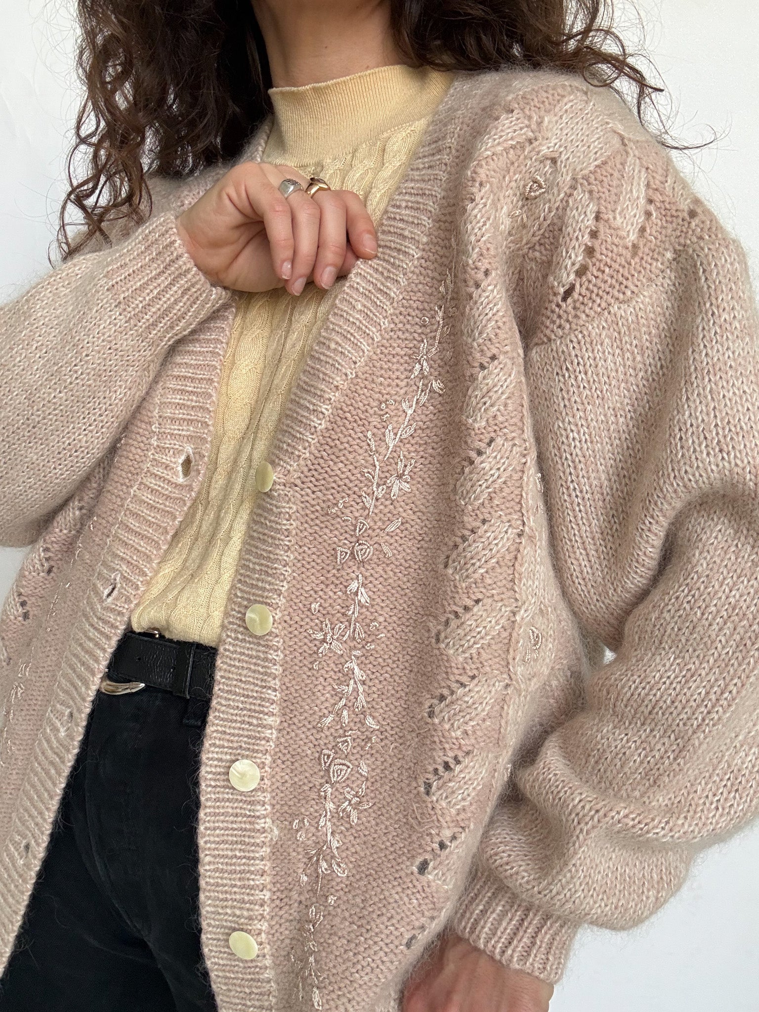 Vintage 80’s Beige Light Pink Embroidered Mohair Cardigan