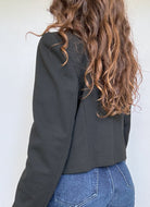 Chosen for its striking contrast and sharp silhouette, this piece instantly channels a bold vintage elegance. The deep black base is elevated by vivid red accents on the collar and pockets, creating a graphic and confident look. Its cropped cut and structured shoulders give it that iconic 80’s presence, making it a standout piece that transforms any outfit.
