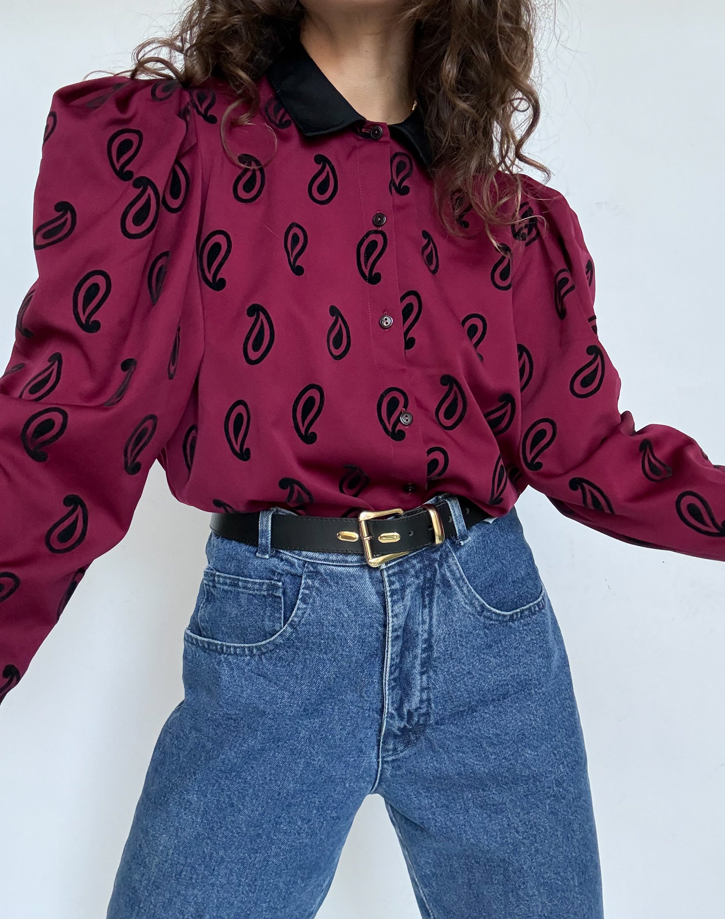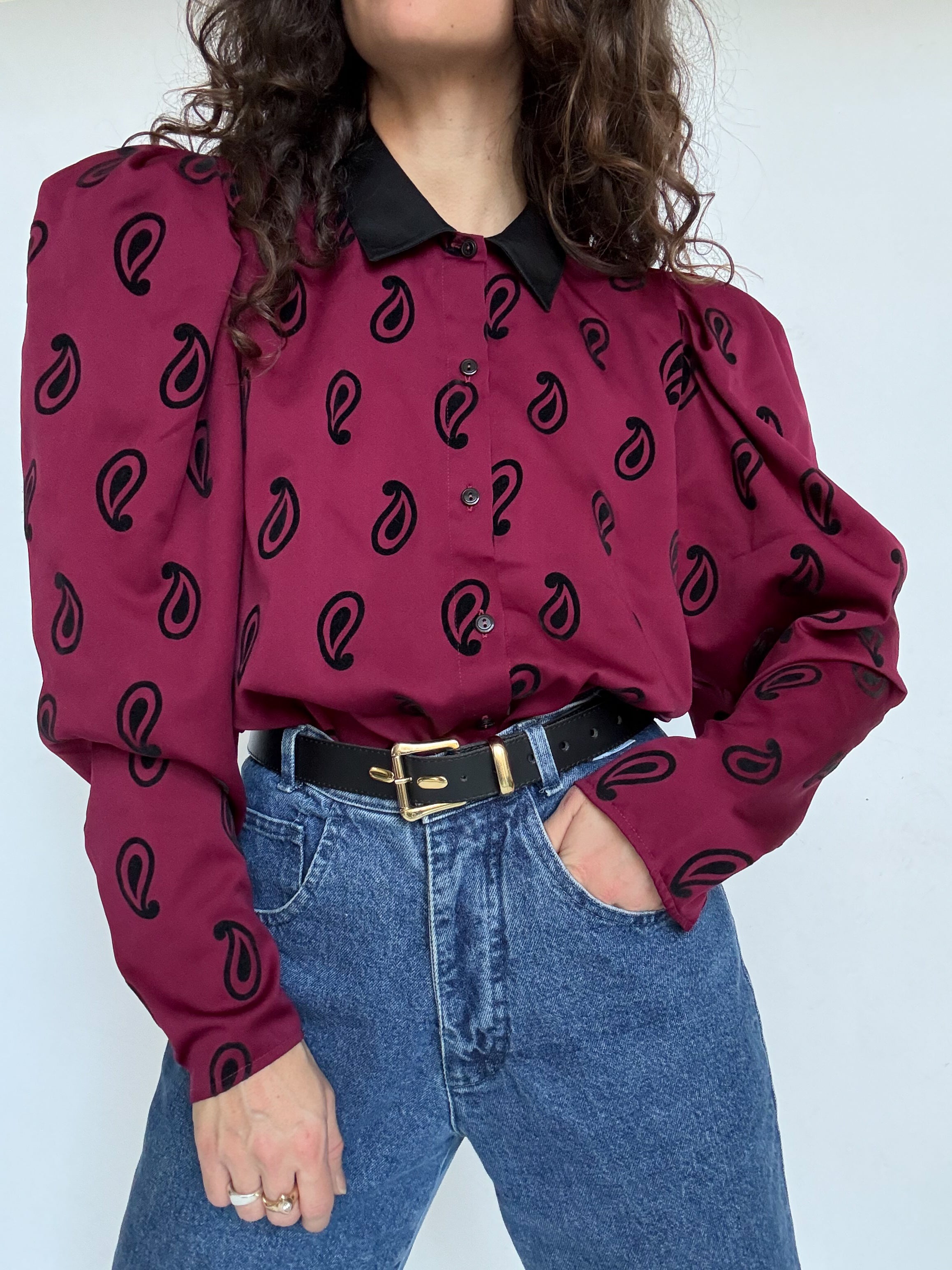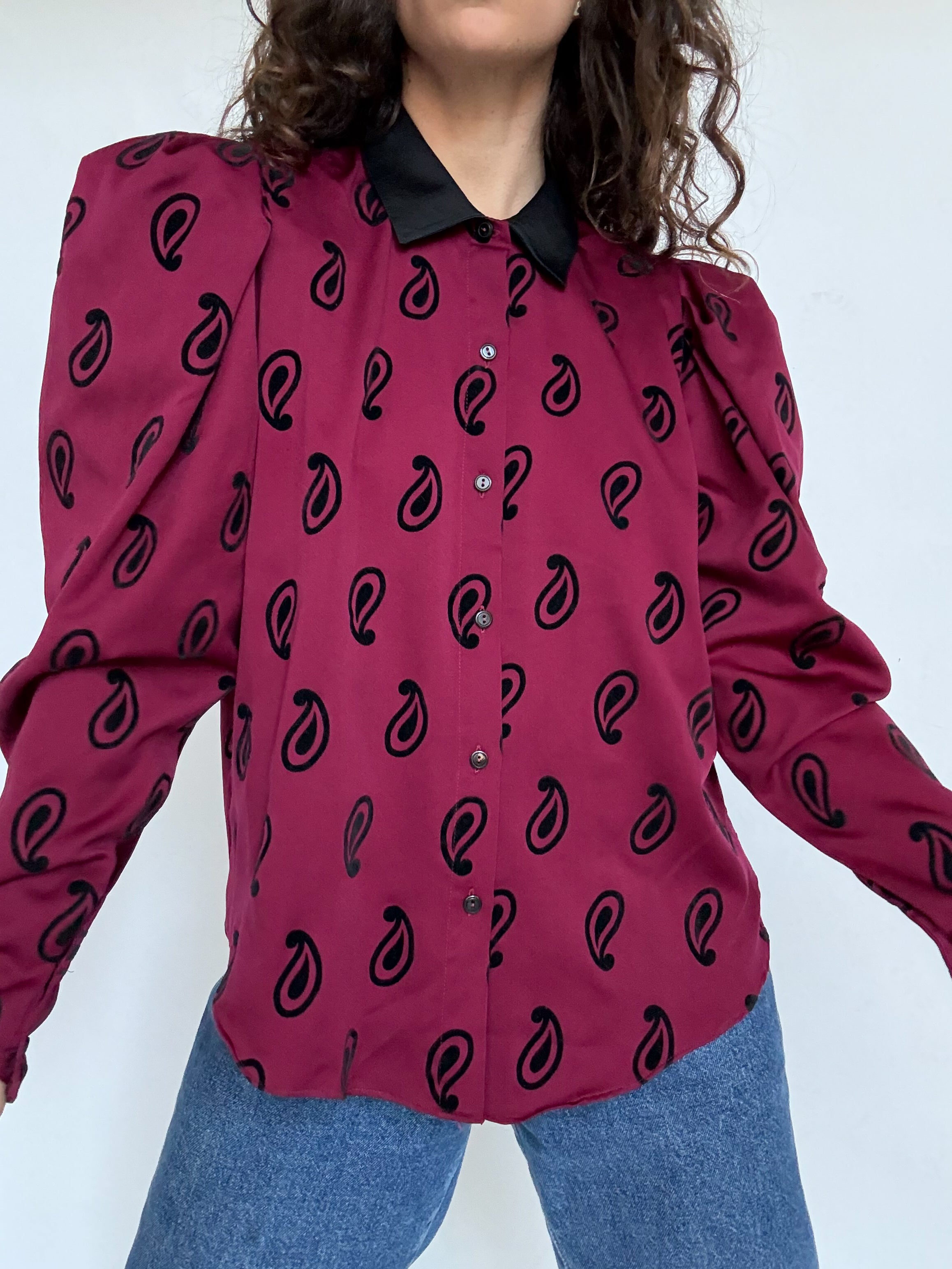 Chosen for its bold 80’s silhouette and its striking paisley pattern, this blouse is a true statement vintage piece. The structured shoulders create that iconic power look of the era, while the deep burgundy tone paired with the black collar adds a beautiful contrast and elegance. A characterful blouse that perfectly embodies the confident and expressive spirit of vintage fashion.