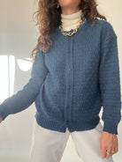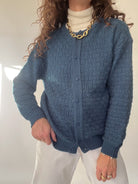A beautifully structured 80’s cardigan chosen for its rich deep-teal tone and its unique textured knit — a subtle, architectural pattern that instantly elevates the silhouette. With no material tag but clearly containing wool, it offers that soft, authentic vintage warmth. The tone-on-tone buttons and clean round neckline create a refined, minimalist look, making it the perfect layering piece over a turtleneck, a crisp shirt, or even a simple tee.