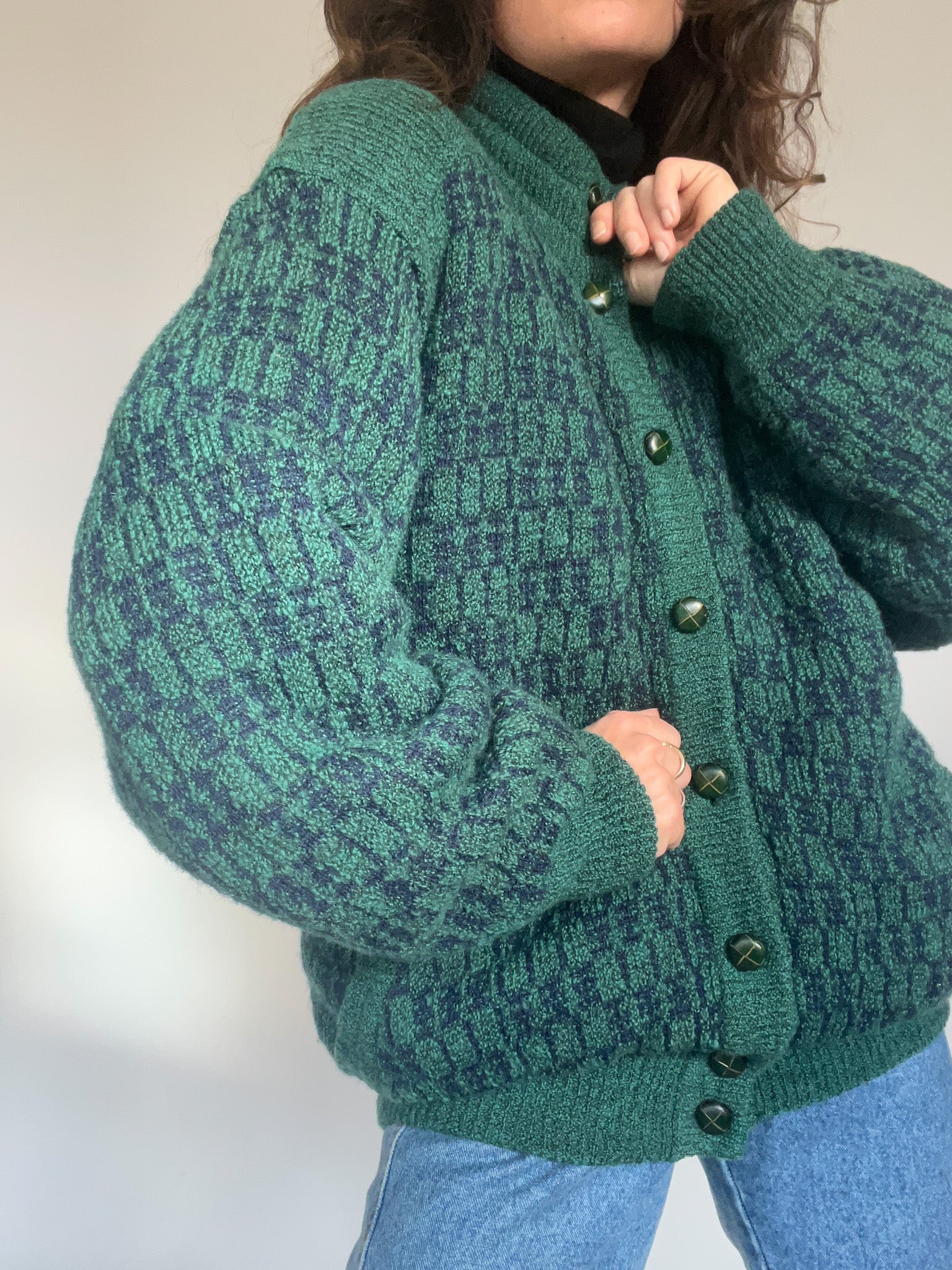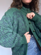 A true 80’s gem — the kind of knit that instantly brings character, texture, and that unmistakable vintage charm. This emerald cardigan is crafted in a textured geometric knit, rich in depth and softness, with an oversized silhouette that wraps you in comfort while keeping your look confident and intentional.